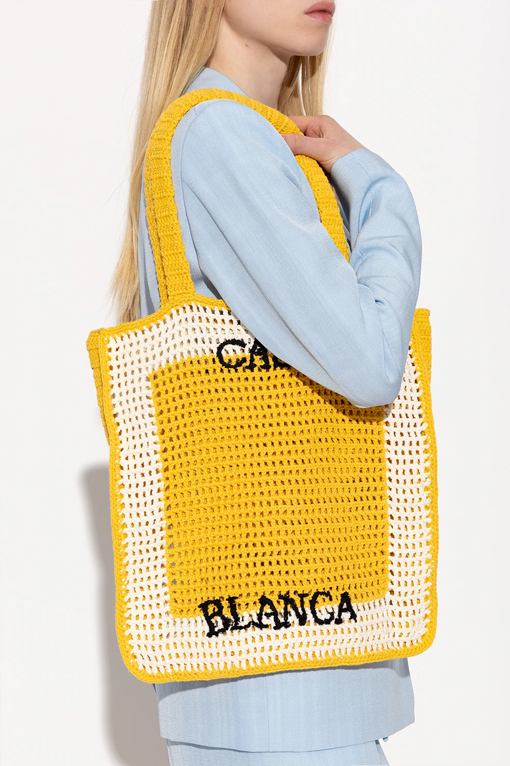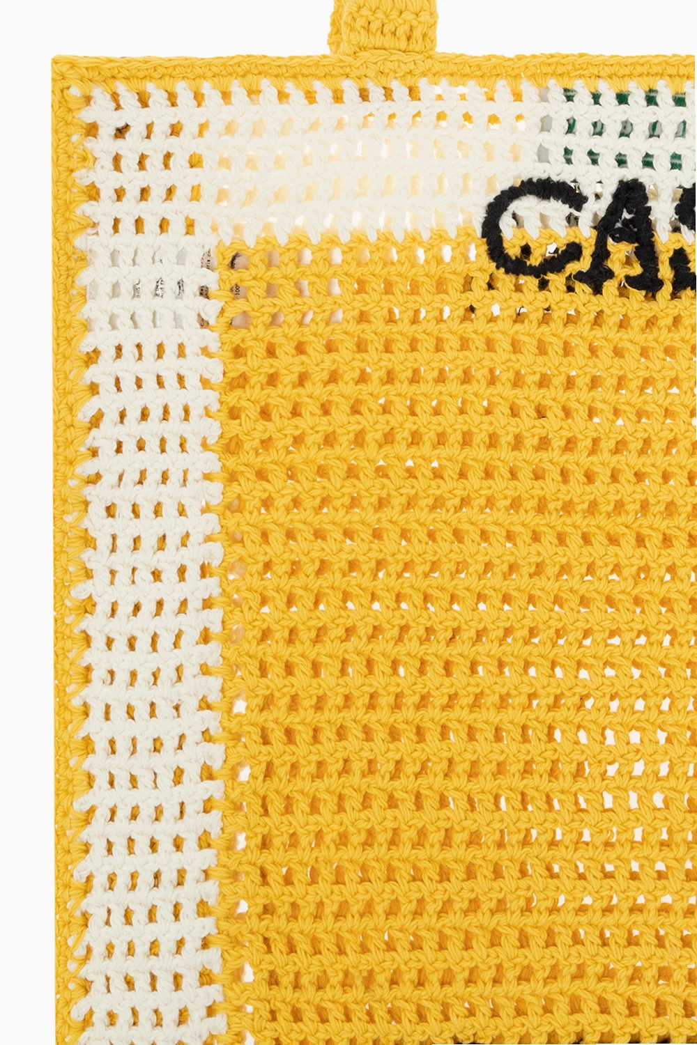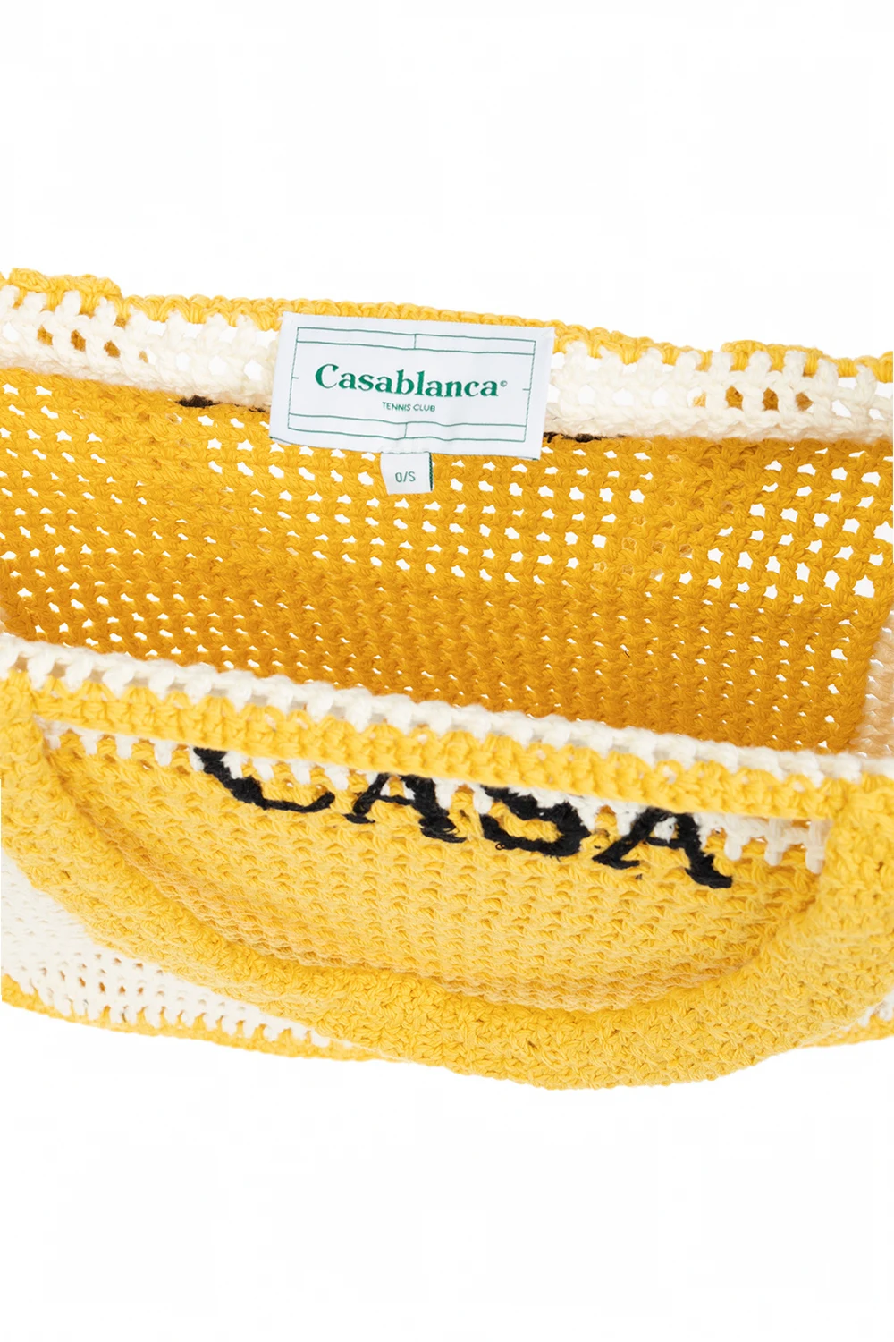 Yellow and cream shopper bag from Casablanca. Crafted from cotton with a crochet finish, this design features two half-round handles and an embroidered black logo.