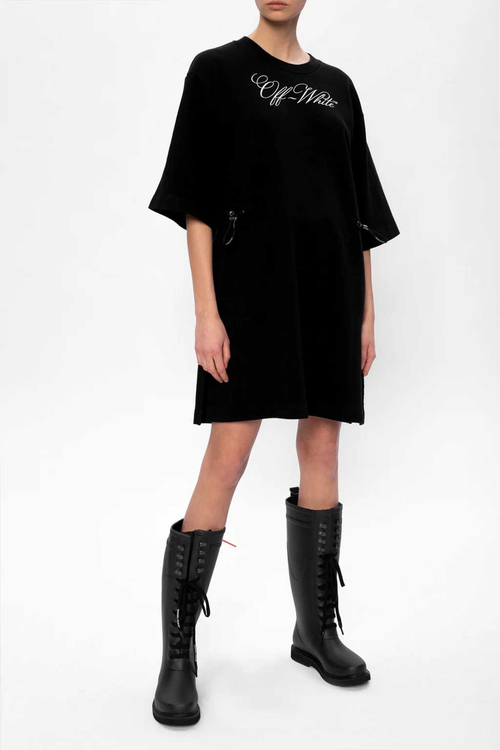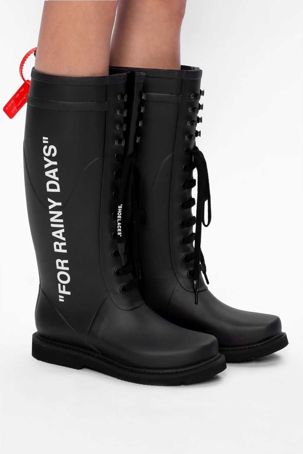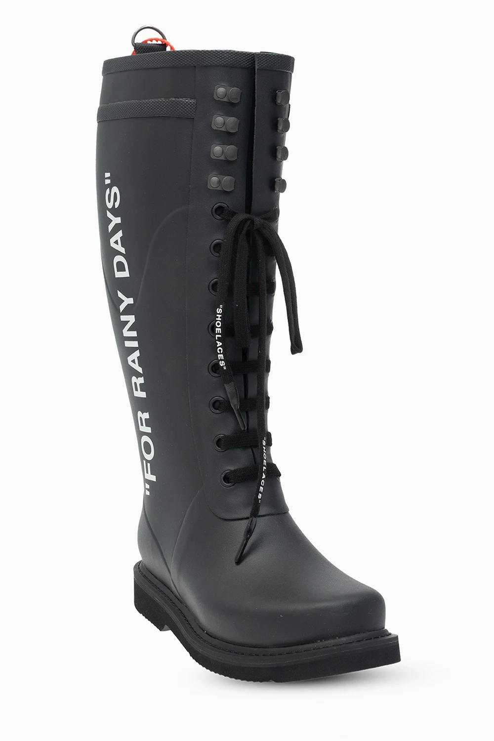 Black ‘Rain’ boots from Off-White. Set on a black rubber sole, this lace-up model features printed lettering in white.