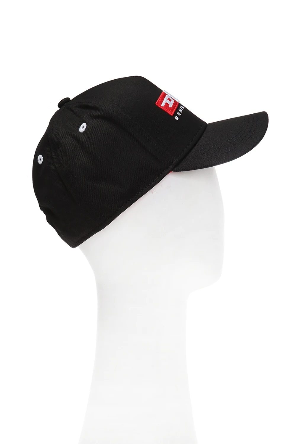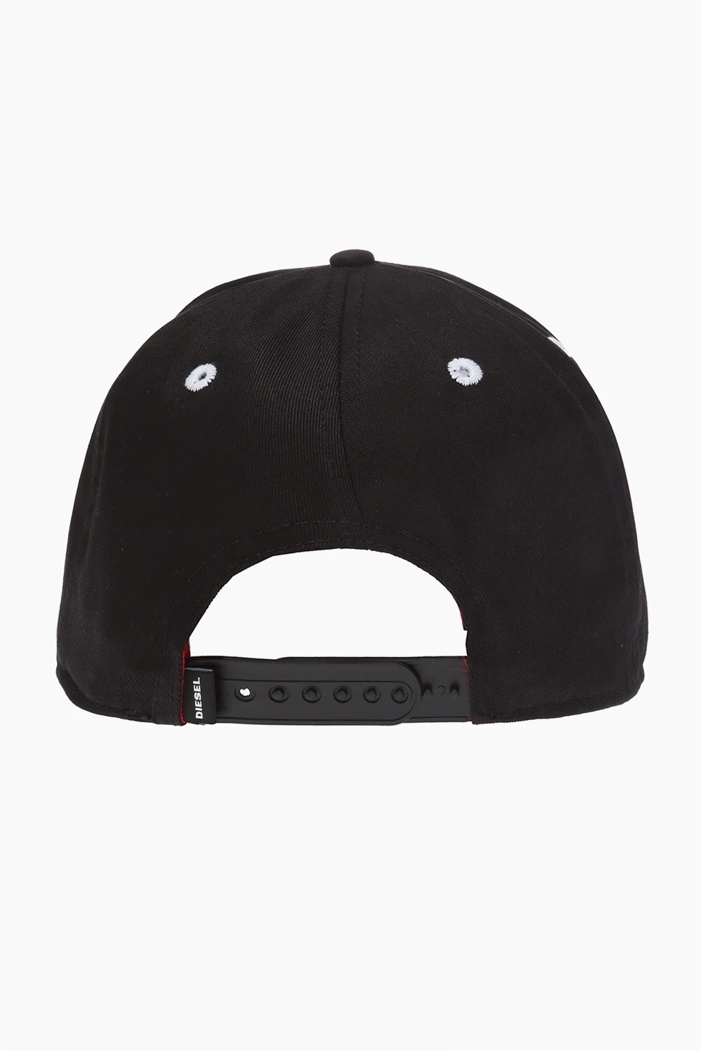 Black baseball cap from Diesel. Made of cotton. Front decorated with a white and red embroidered logo. Adjustable strap at the back.