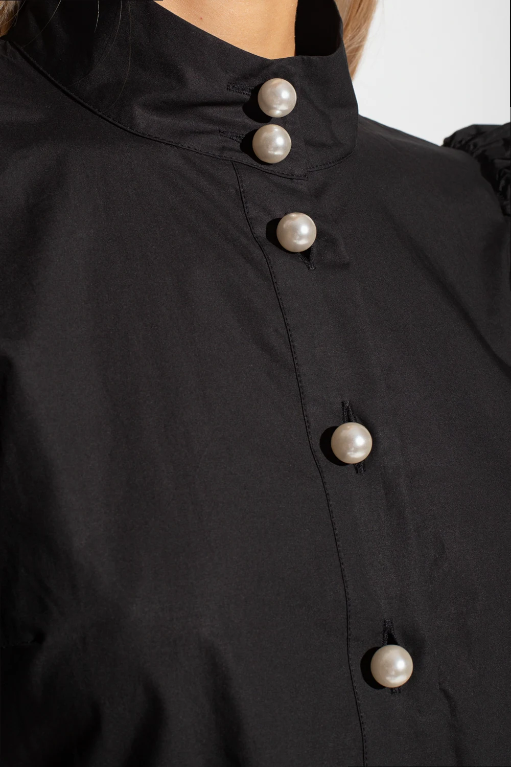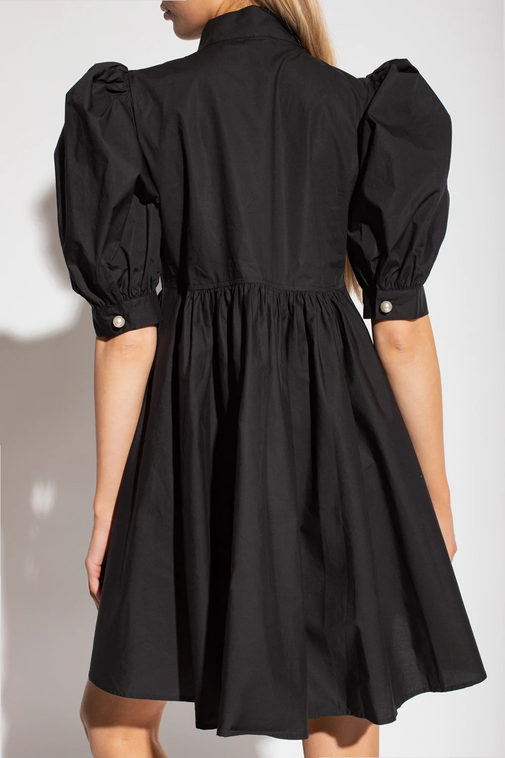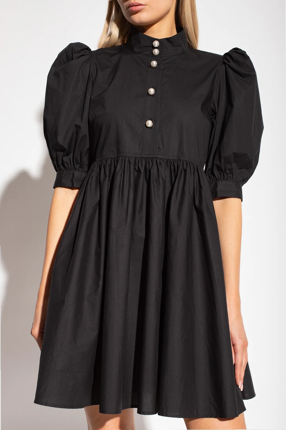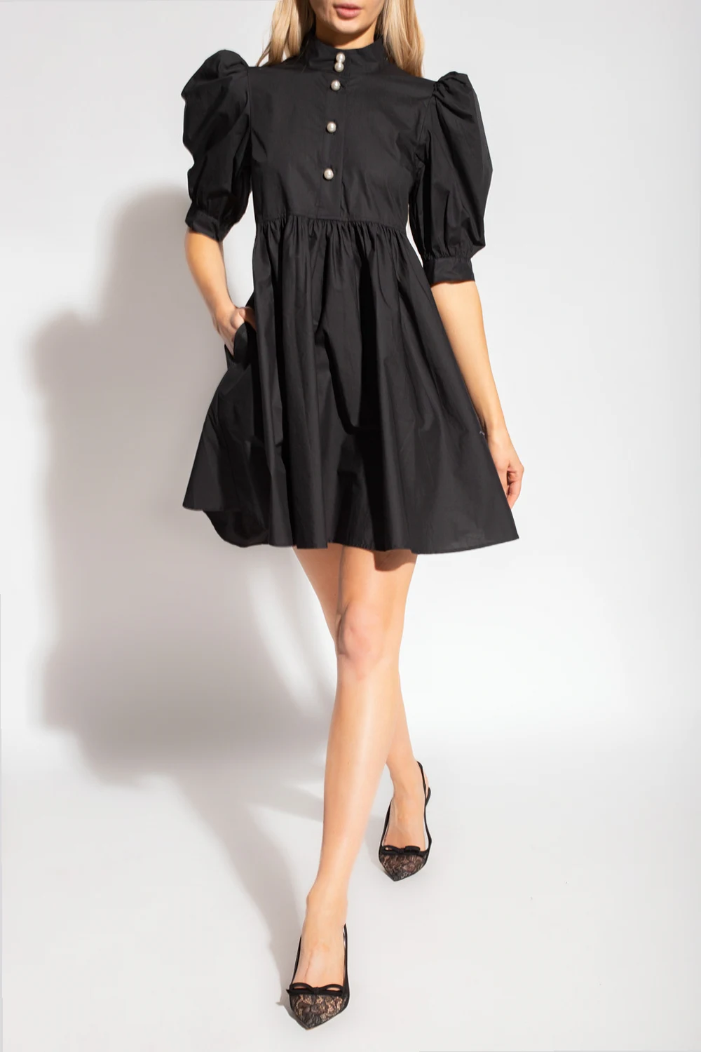 Black ‘Lema’ dress with a stand collar from Custommade. Crafted from organic cotton, this flared design features pearl buttons, side pockets and short puff sleeves with pearly buttons.