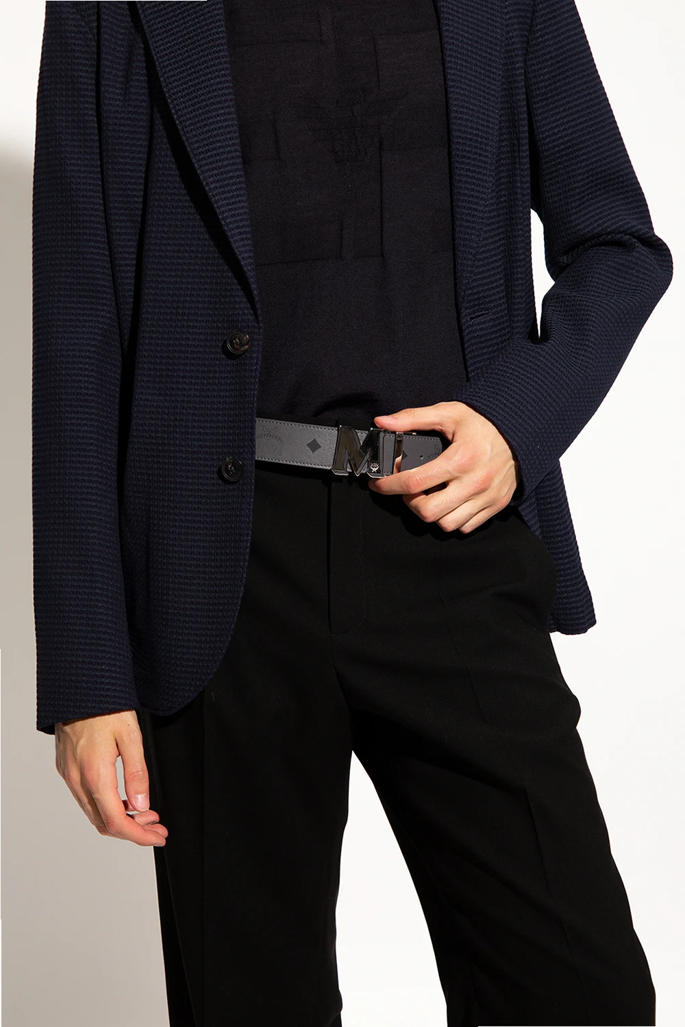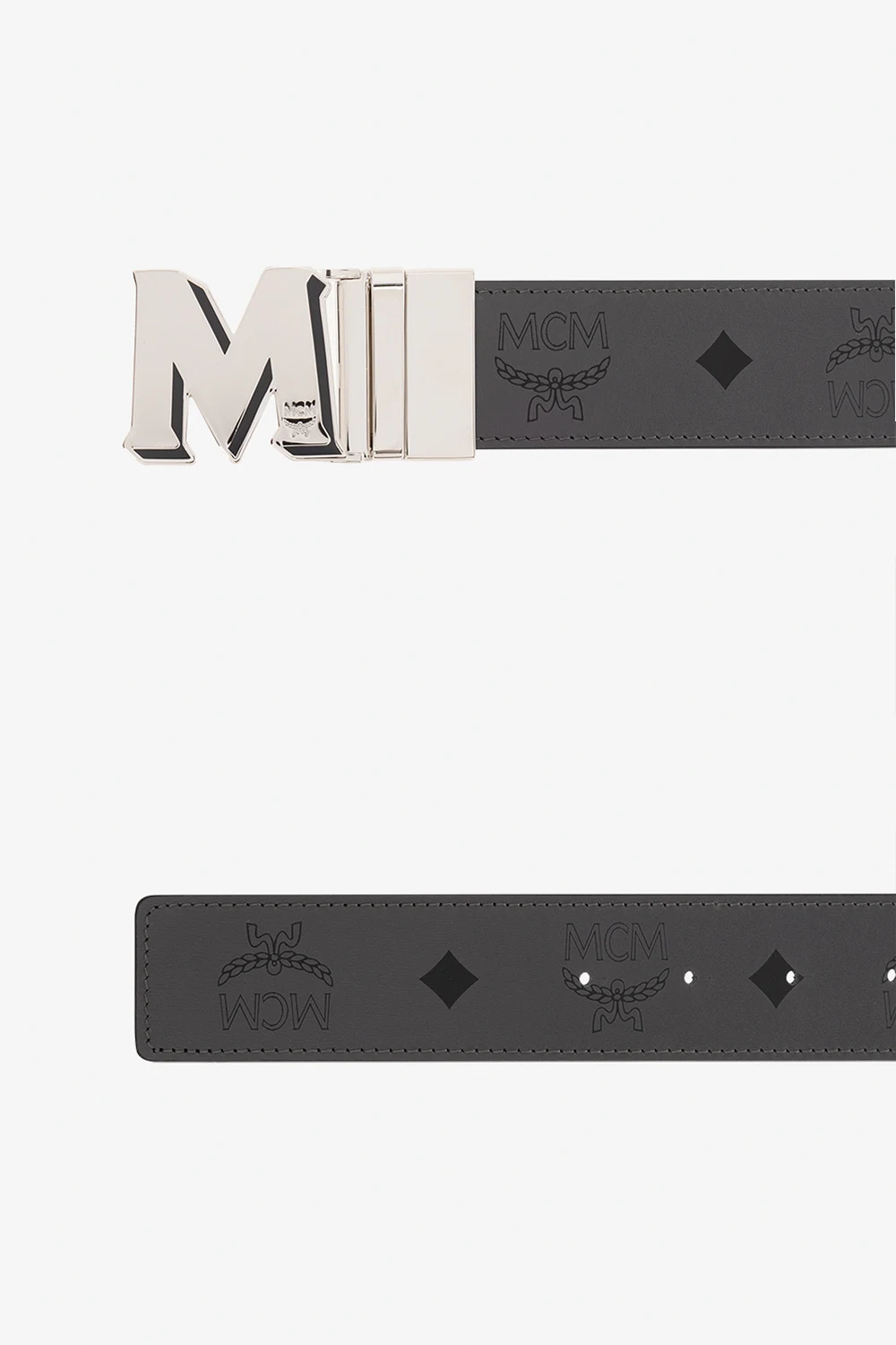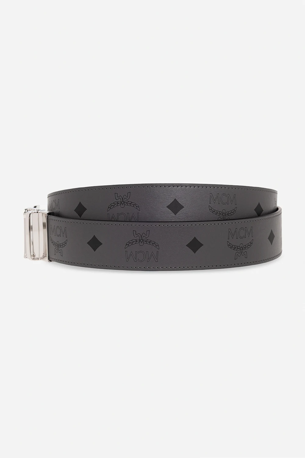 Grey belt from MCM. Made from leather, this item features a silver-tone metal logo buckle and a printed black Visetos pattern.