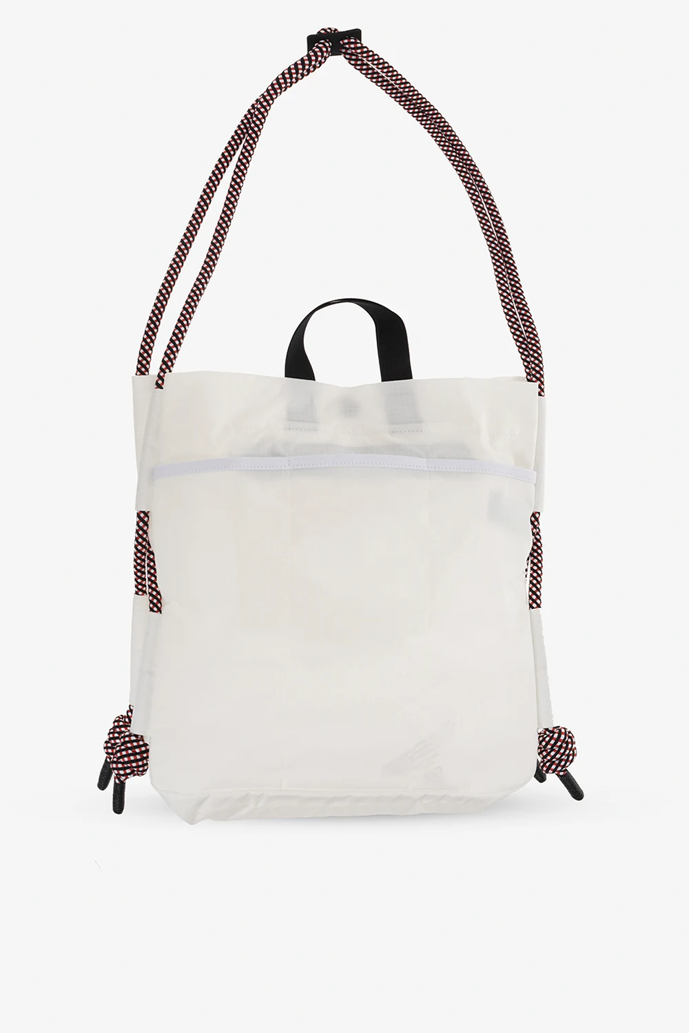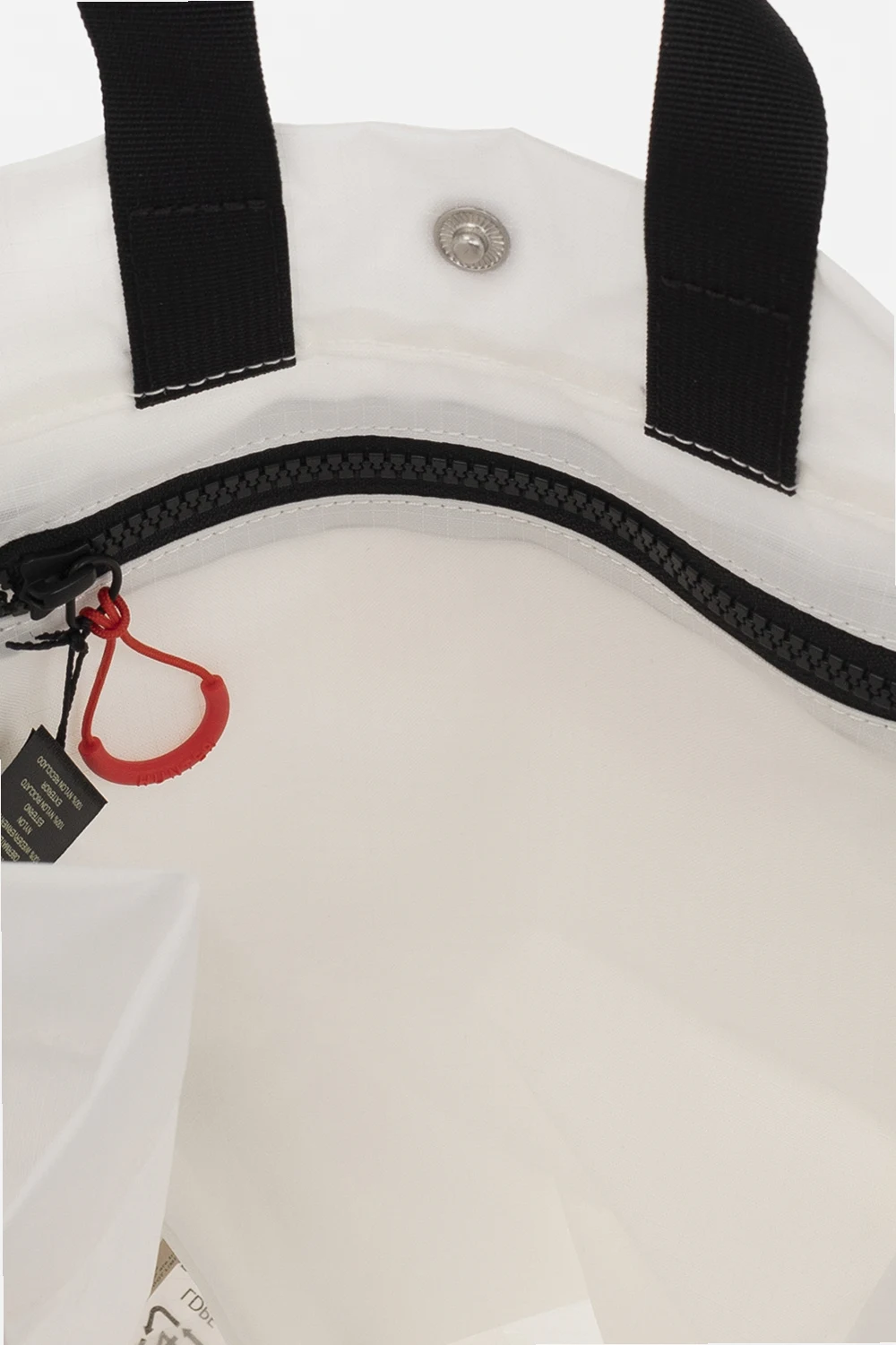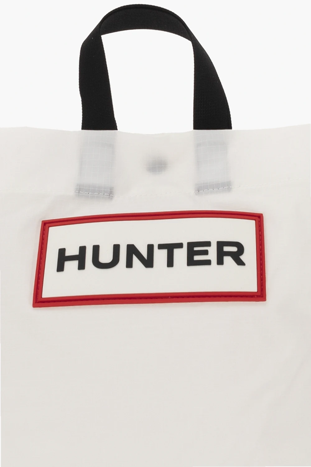 White shoulder bag from Hunter. Crafted from recycled waterproof fabric, this design fastens with a snap button and is decorated with a rubber logo detail in white and red. It is complete with three pockets at the back, two half-round handles in black, metal hardware in silver-tone and black as well as one internal compartment with one zip pocket.