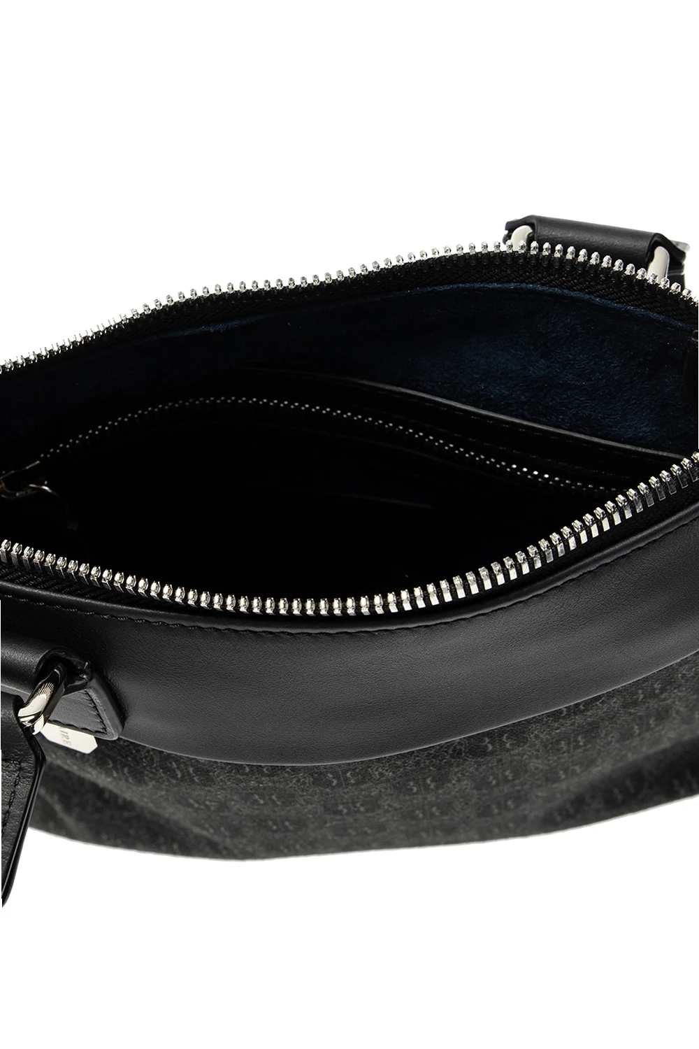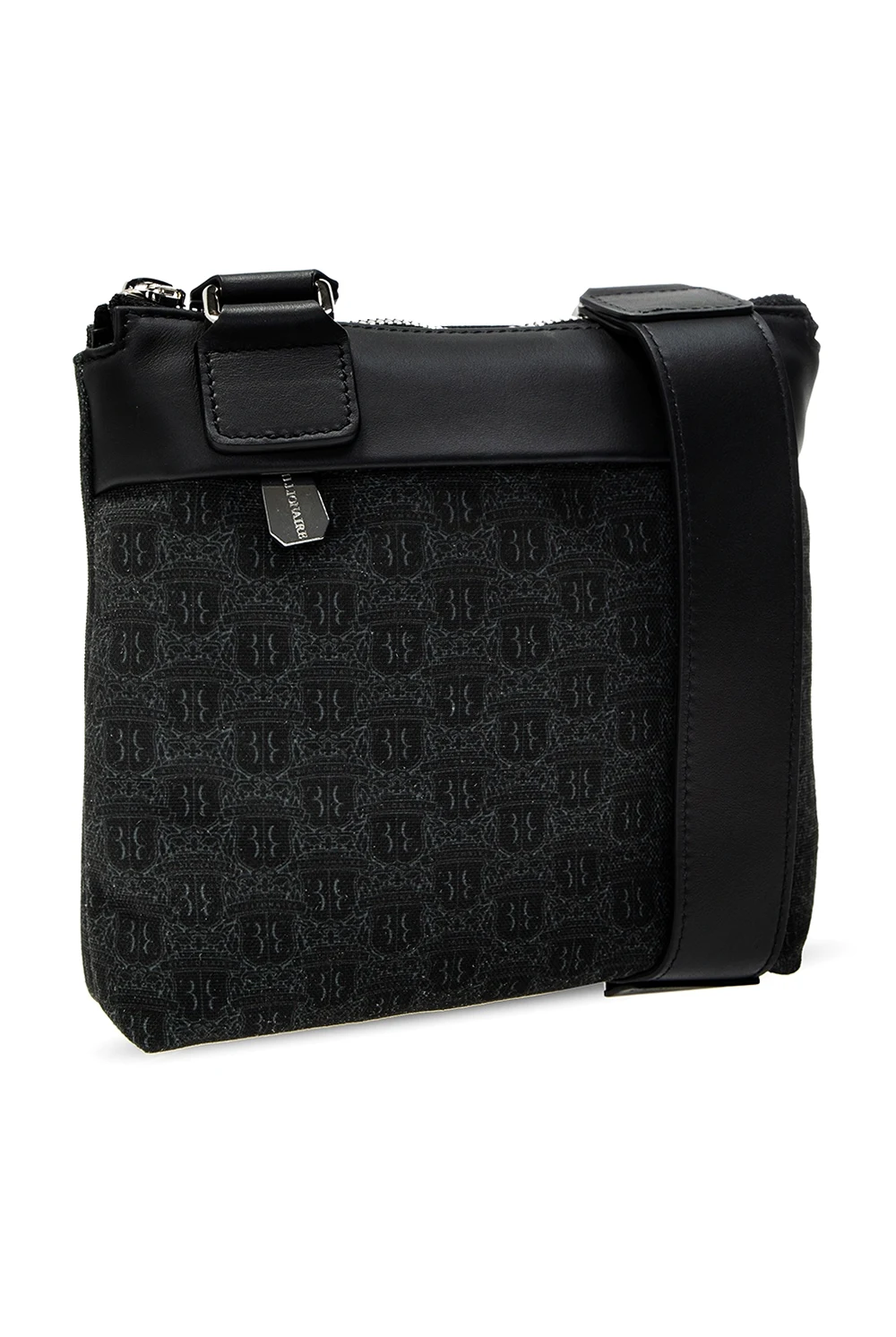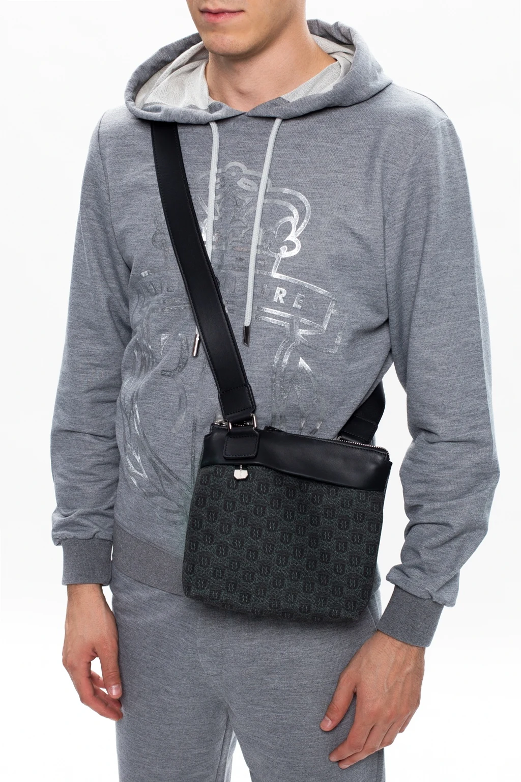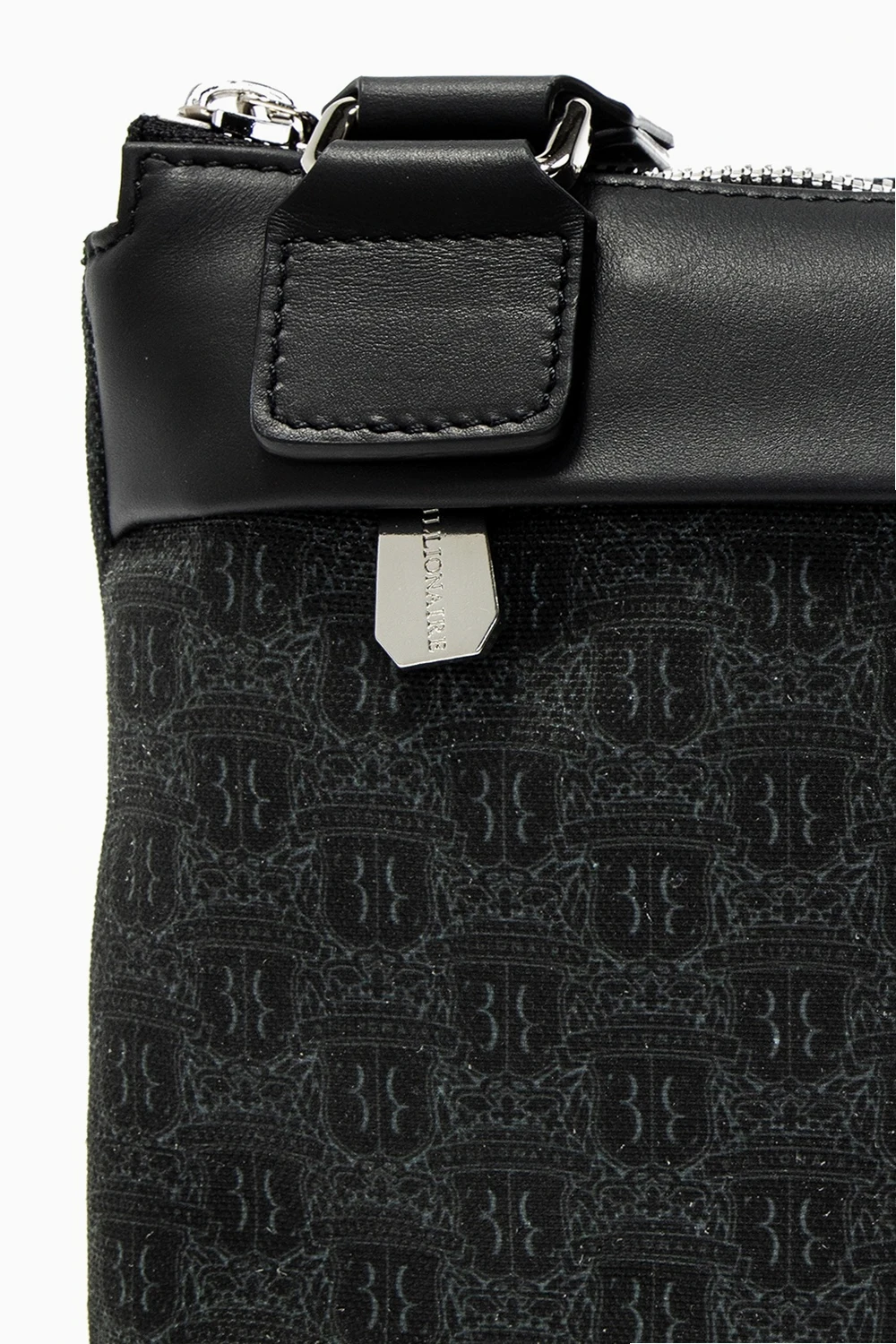 Green and black shoulder bag from Billionaire. Printed with the label's logo, this design fastens via zipper and features calf leather trims, an external zip pocket on the front, an adjustable shoulder strap, silver-tone metal hardware and interior with one compartment, one zip pocket and one slip pocket.