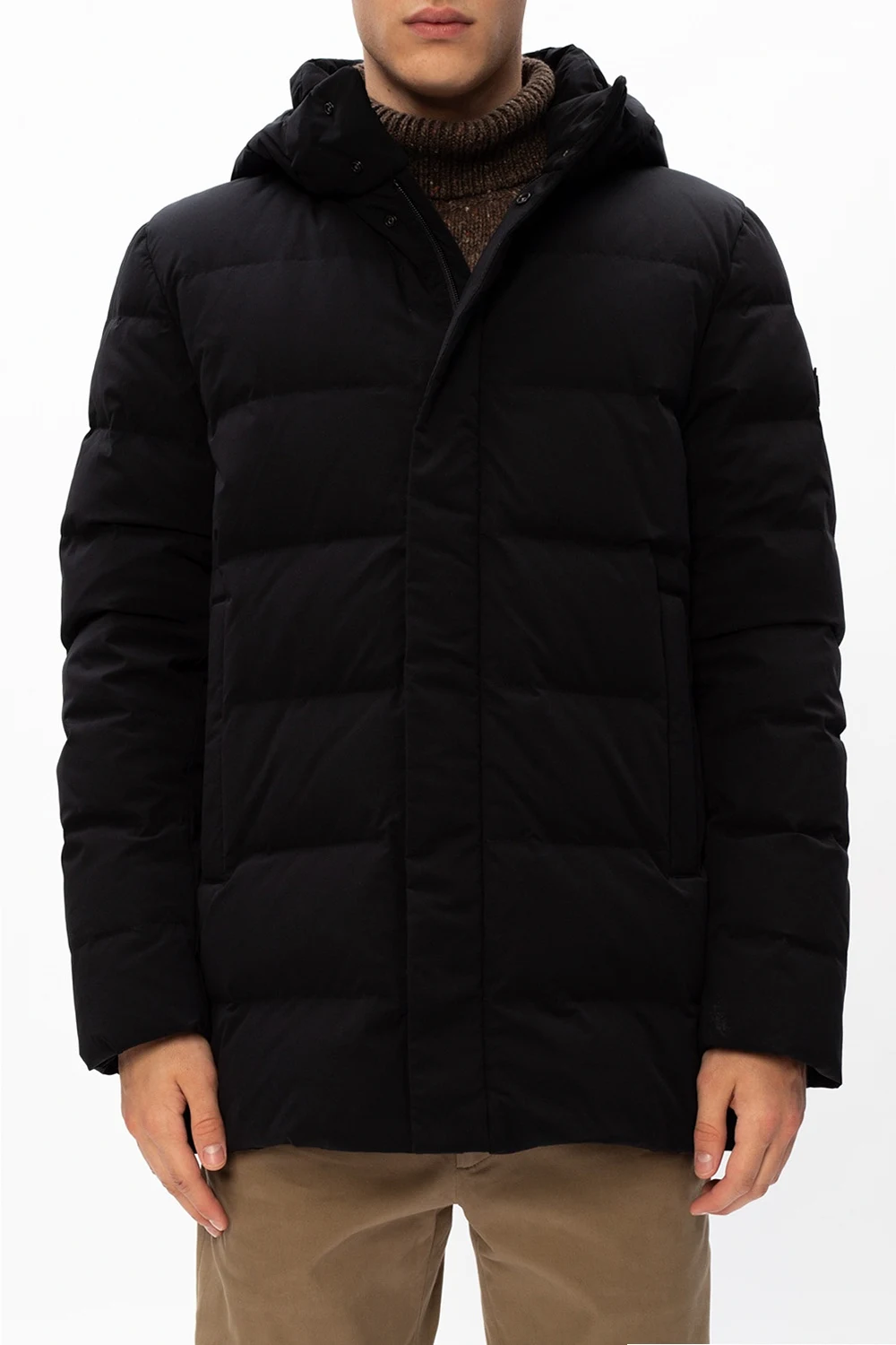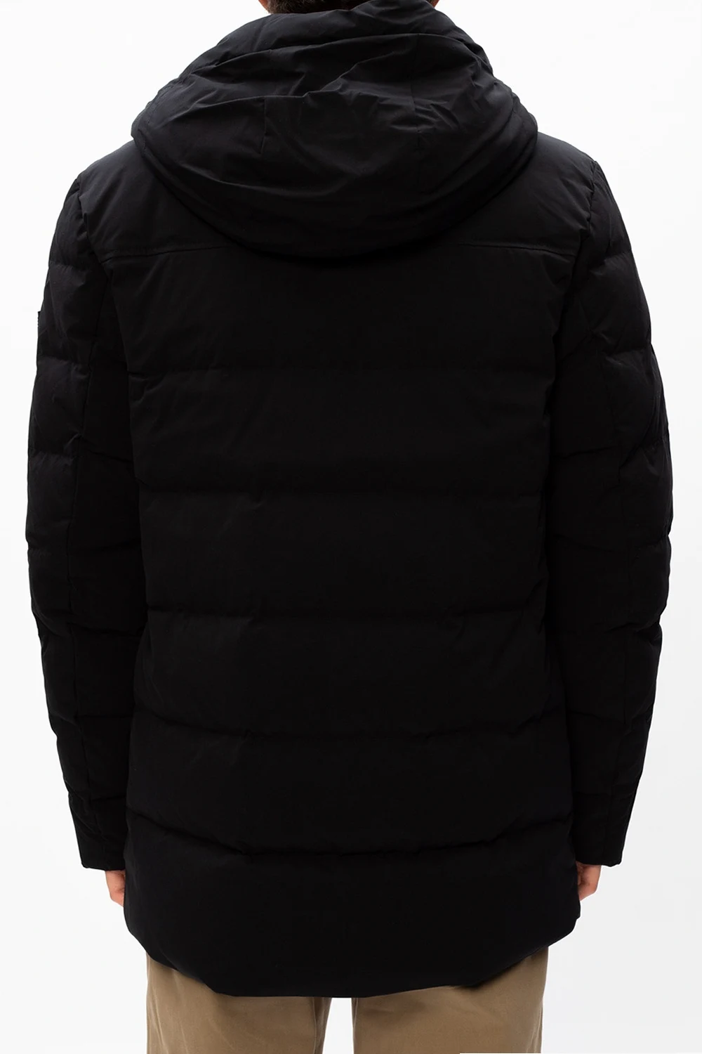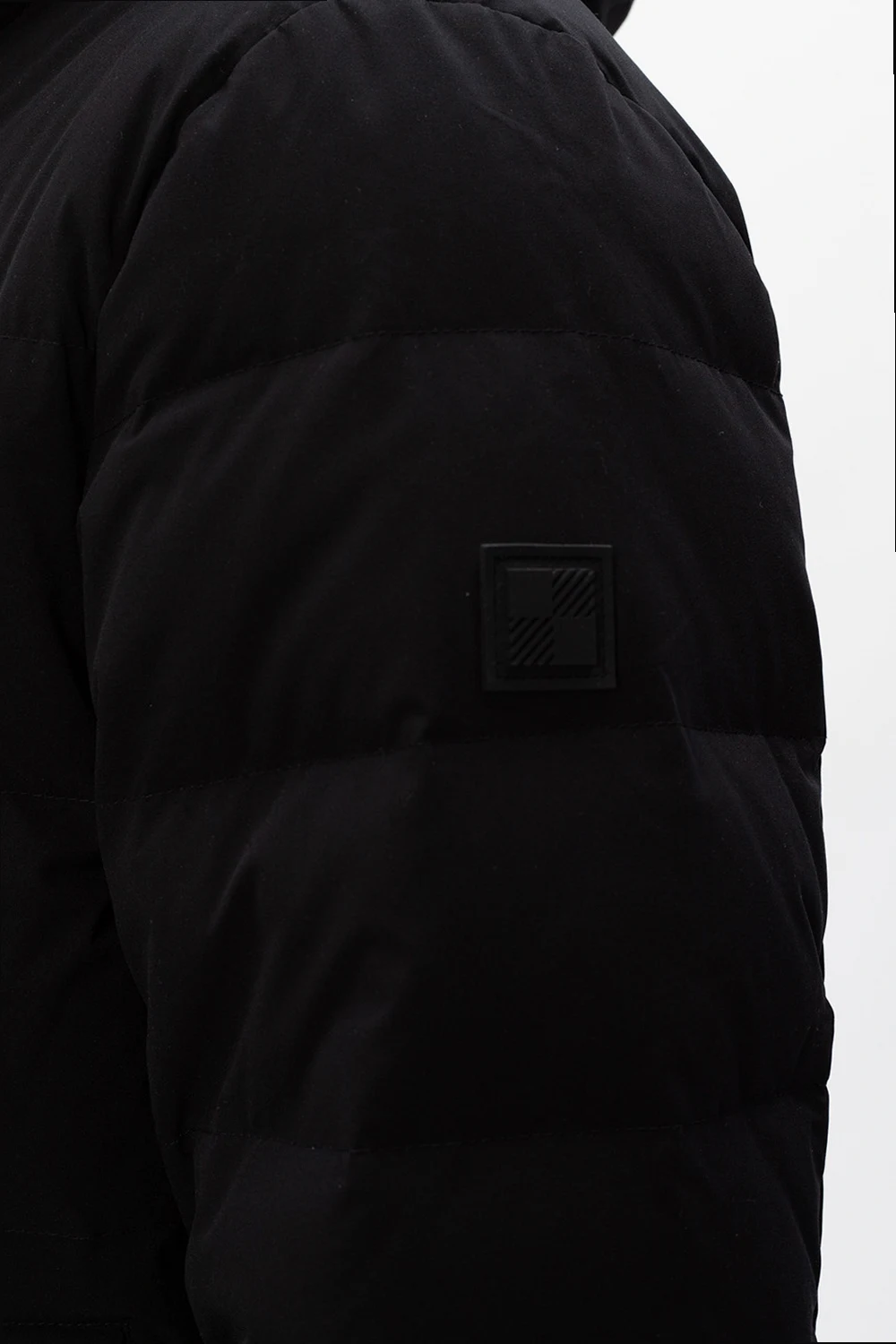 Black 'Sierra' quilted down jacket from Woolrich. Embellished with a rubberised logo appliqué for the brand recognition, this style fastens via two-way zip and snap fastenings and employs two zip pockets on the front, long sleeves with elasticated cuffs and drawstring channel at the bottom hem.