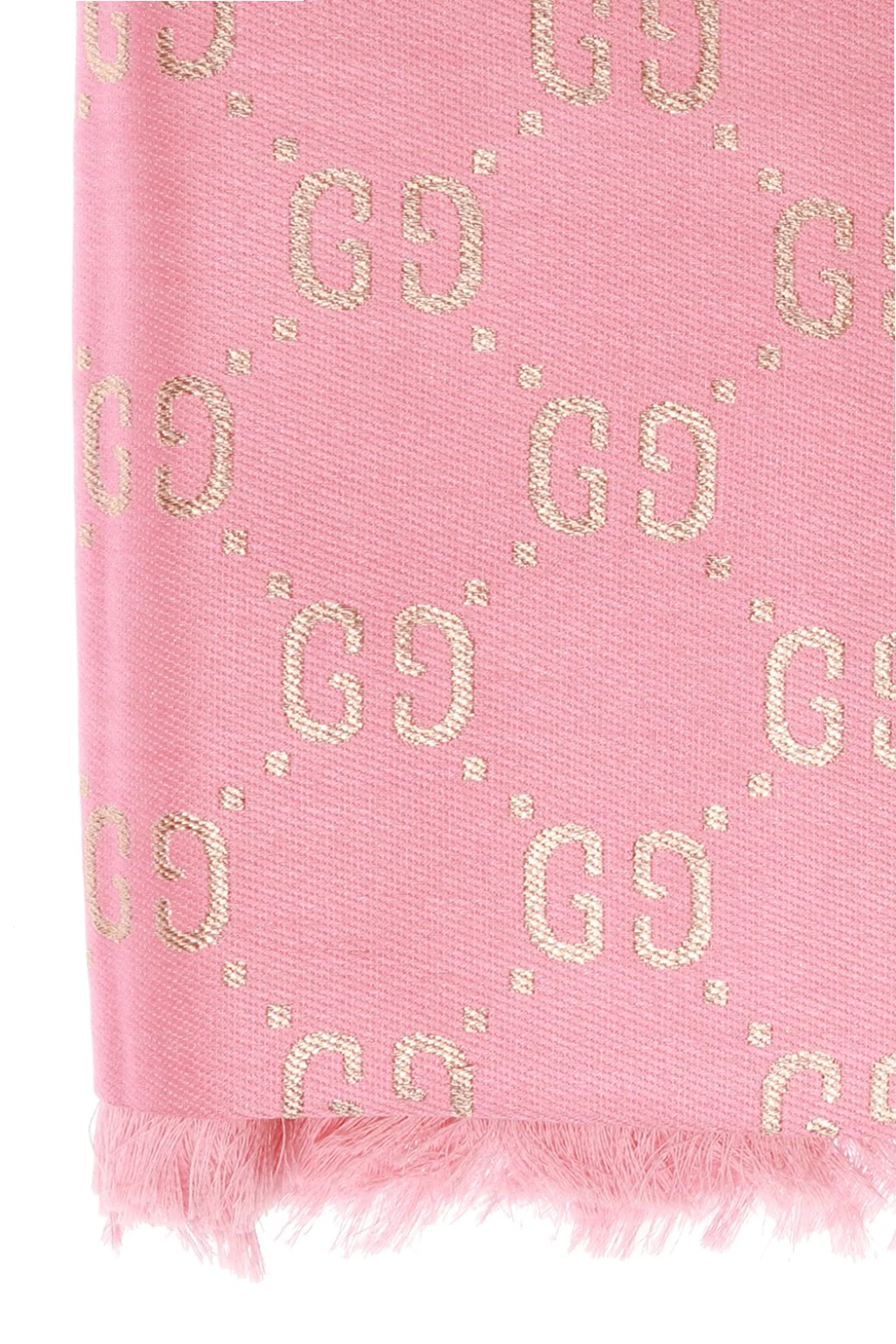 Pink scarf from Gucci Kids. Trimmed with wool and silk. Decorated with a logo pattern embroidered with a gold-tone lurex thread. Fringe ends.