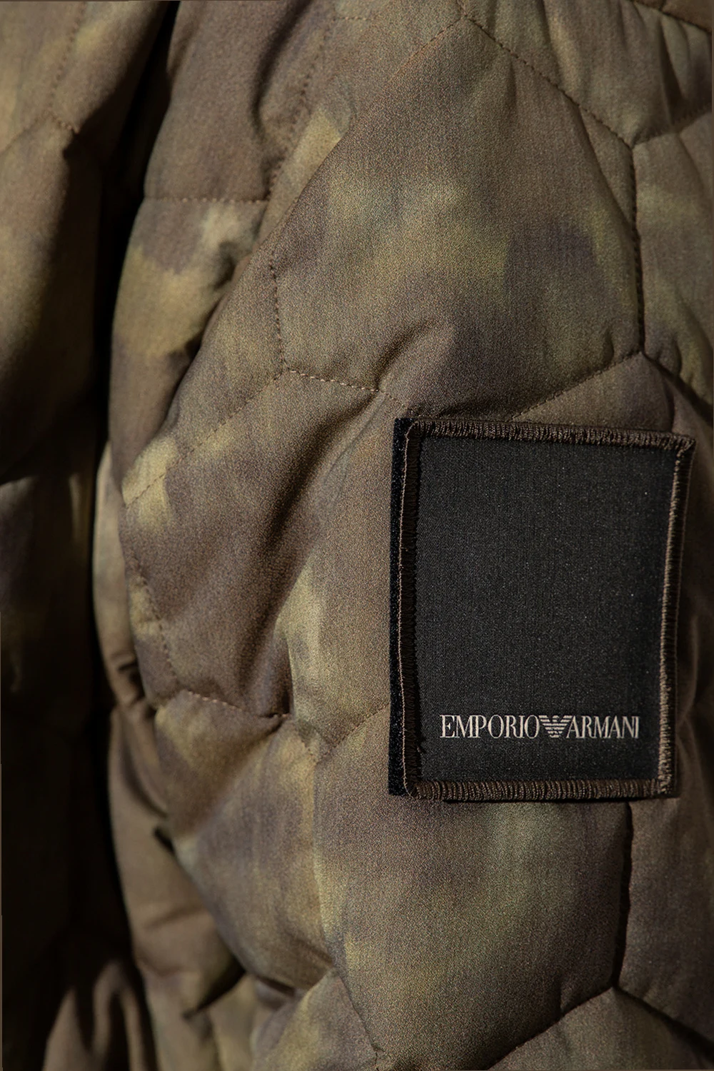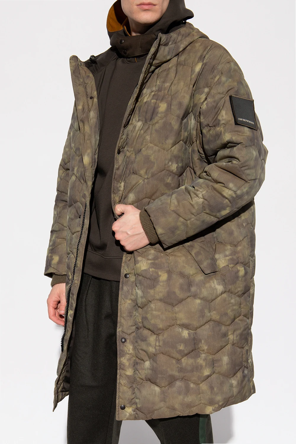Green and beige quilted jacket from Emporio Armani, the ‘Sustainable’ collection. Emblazoned with a logo patch, this style fastens via a two-way zipper and snaps and features a drawcord-adjustable hood, two snap-fastened pockets with flaps and long sleeves with elasticated cuffs.
