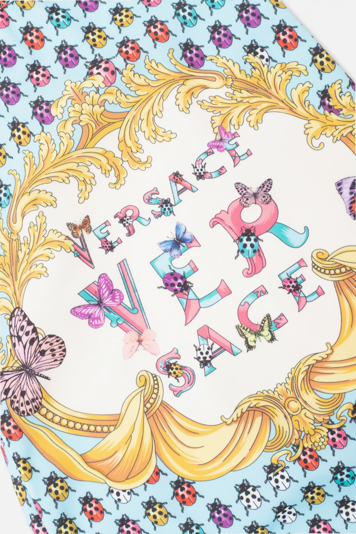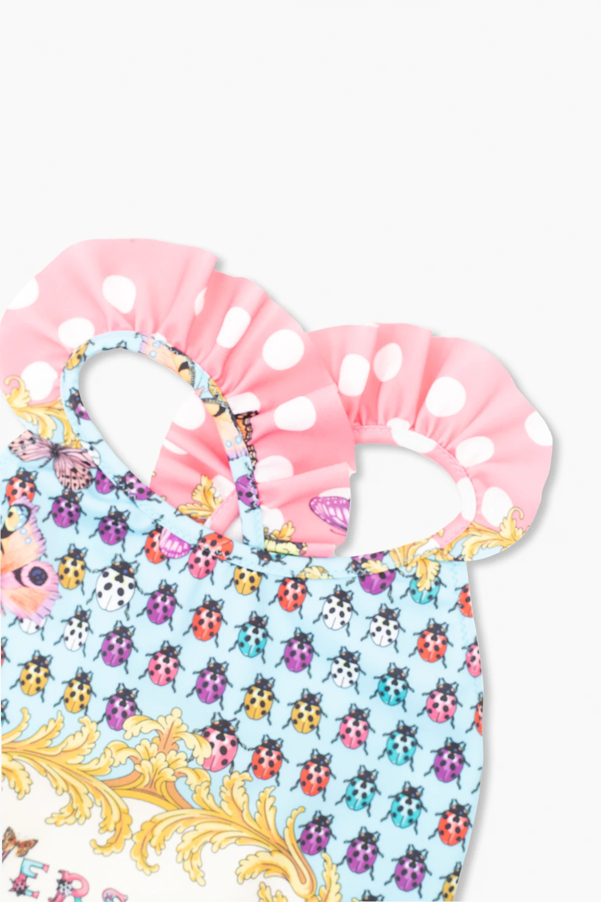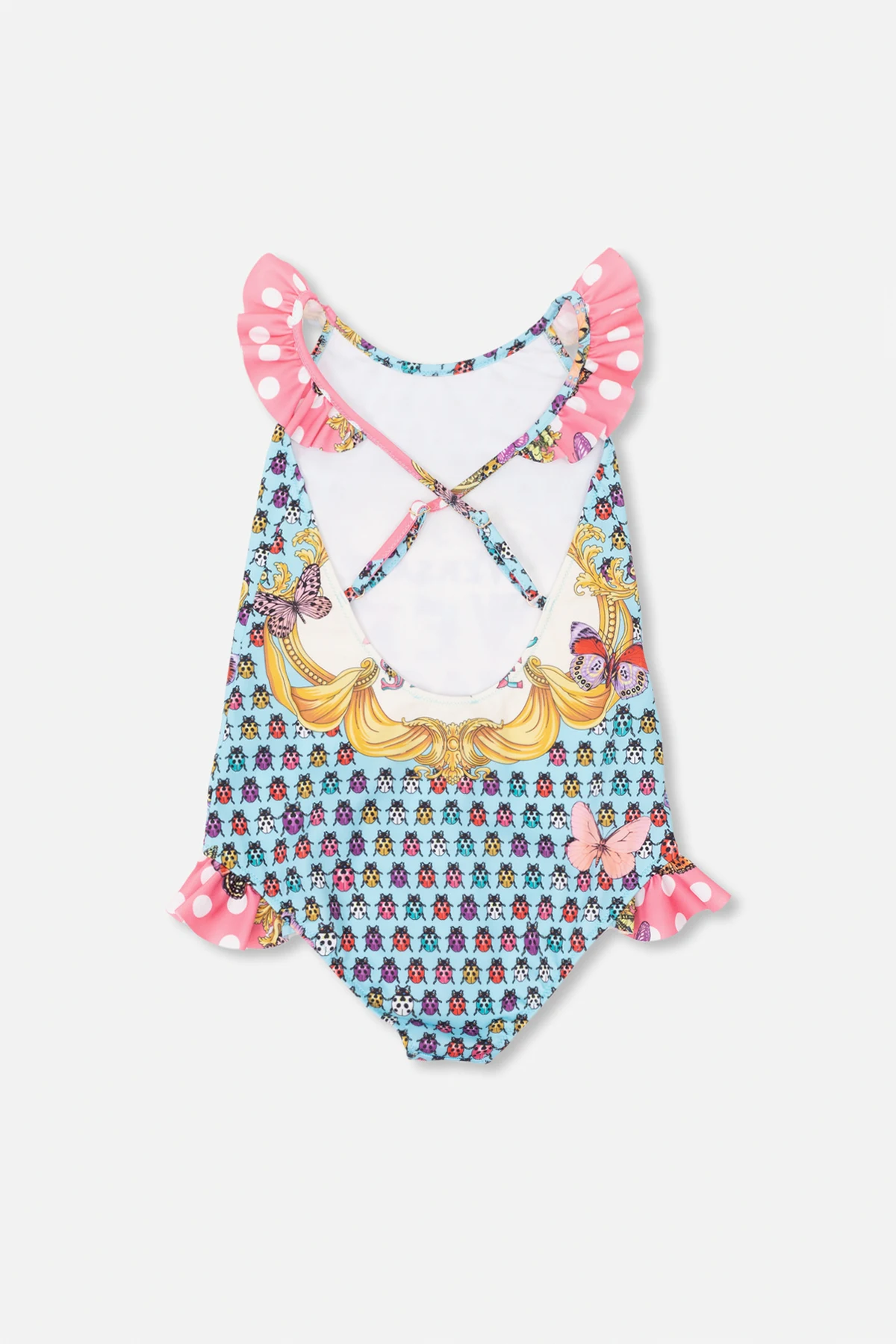 Multicolored one-piece swimsuit from Versace Kids, ‘La Vacanza’ capsule collection. Decorated with the Heritage Butterflies & Ladybugs Kids pattern and ruffles, this design features a round neck and adjustable shoulder straps crossed at the back.