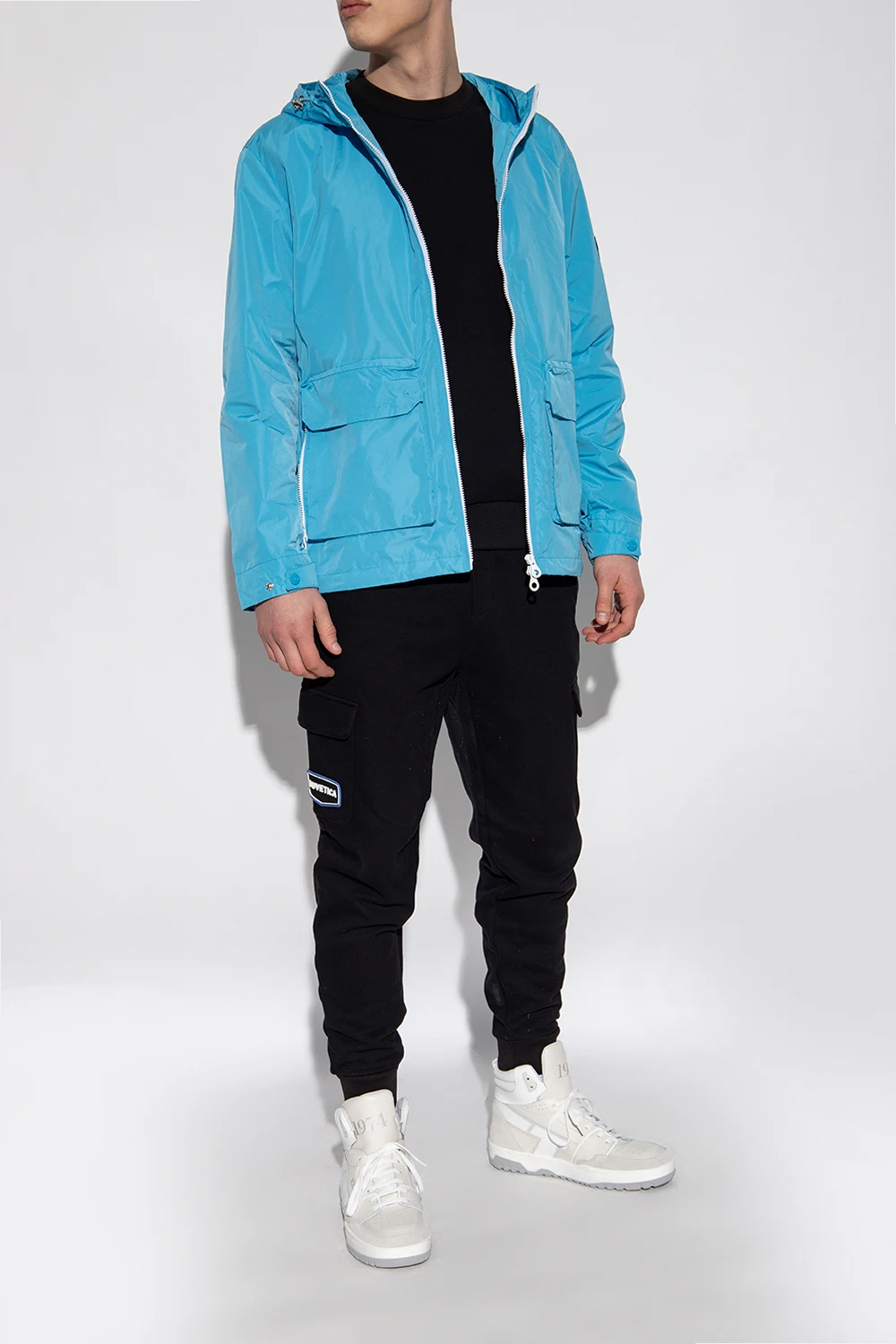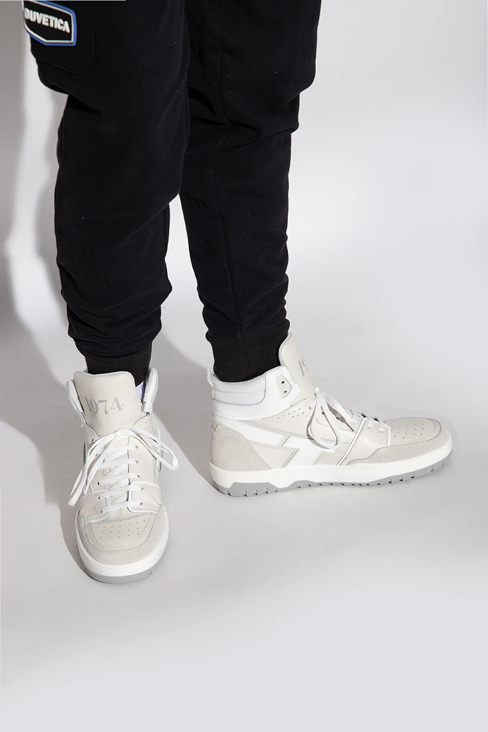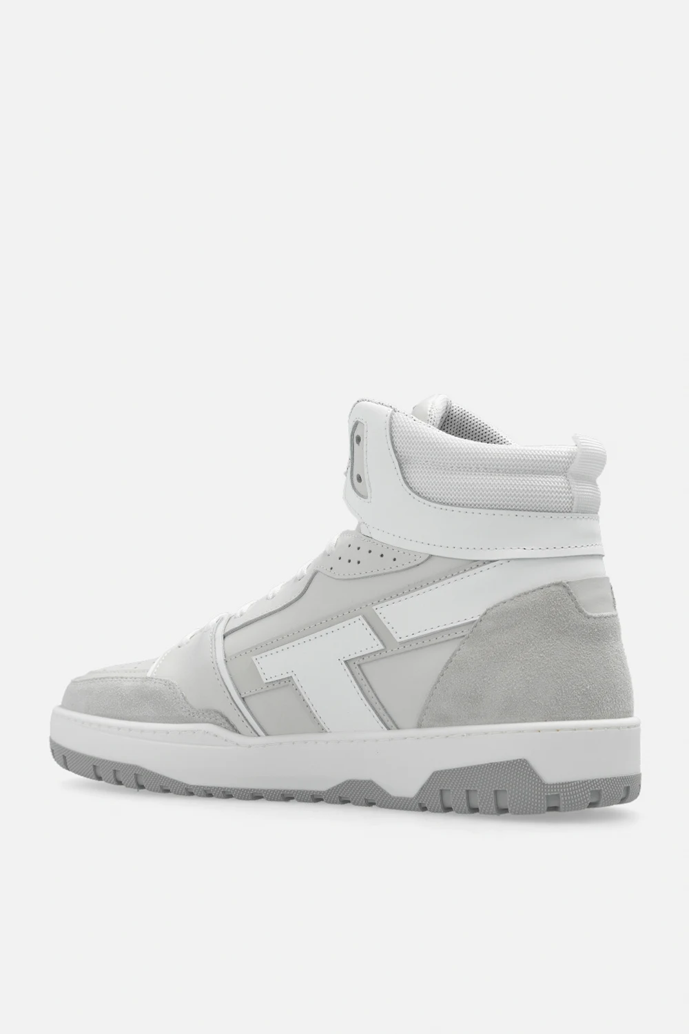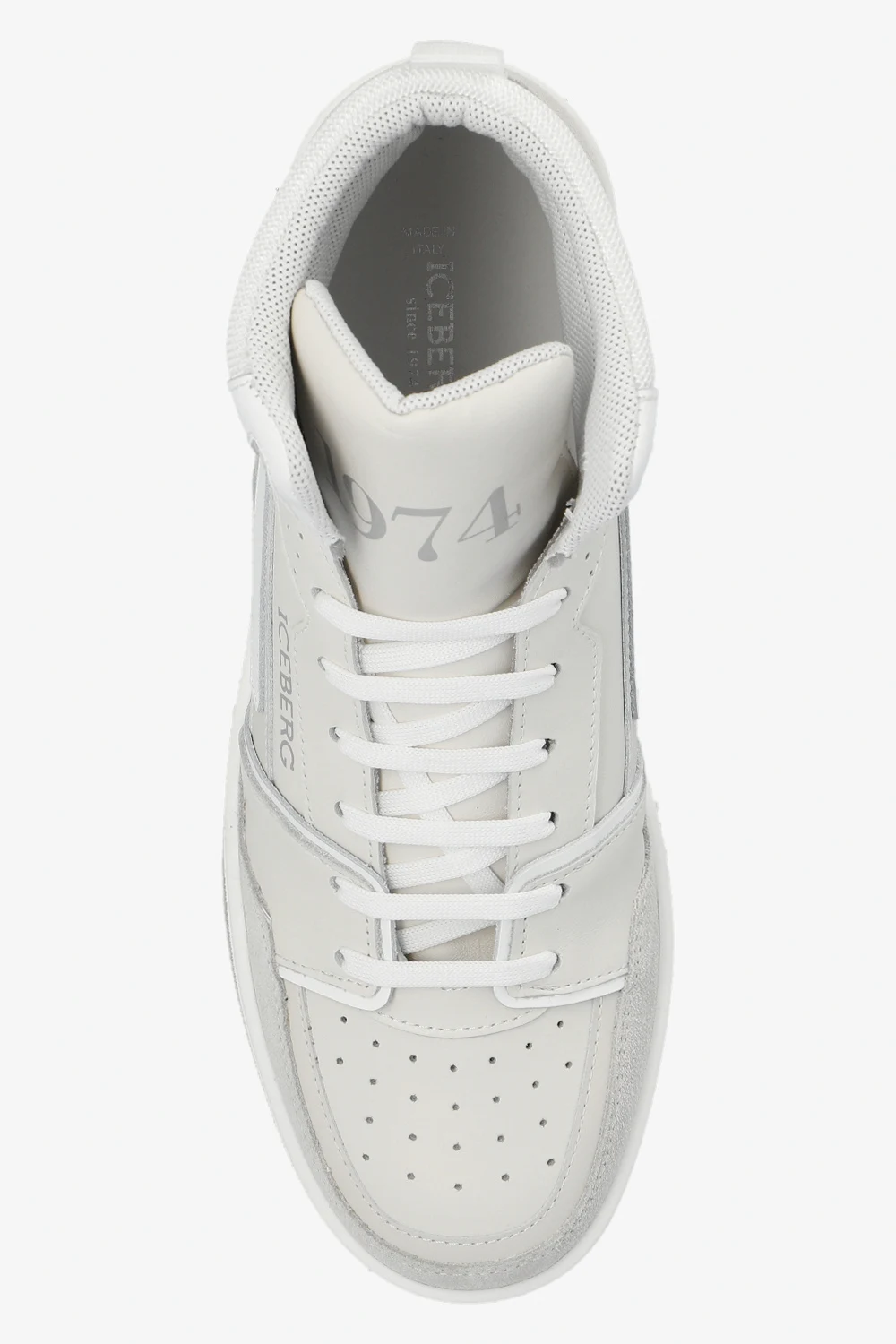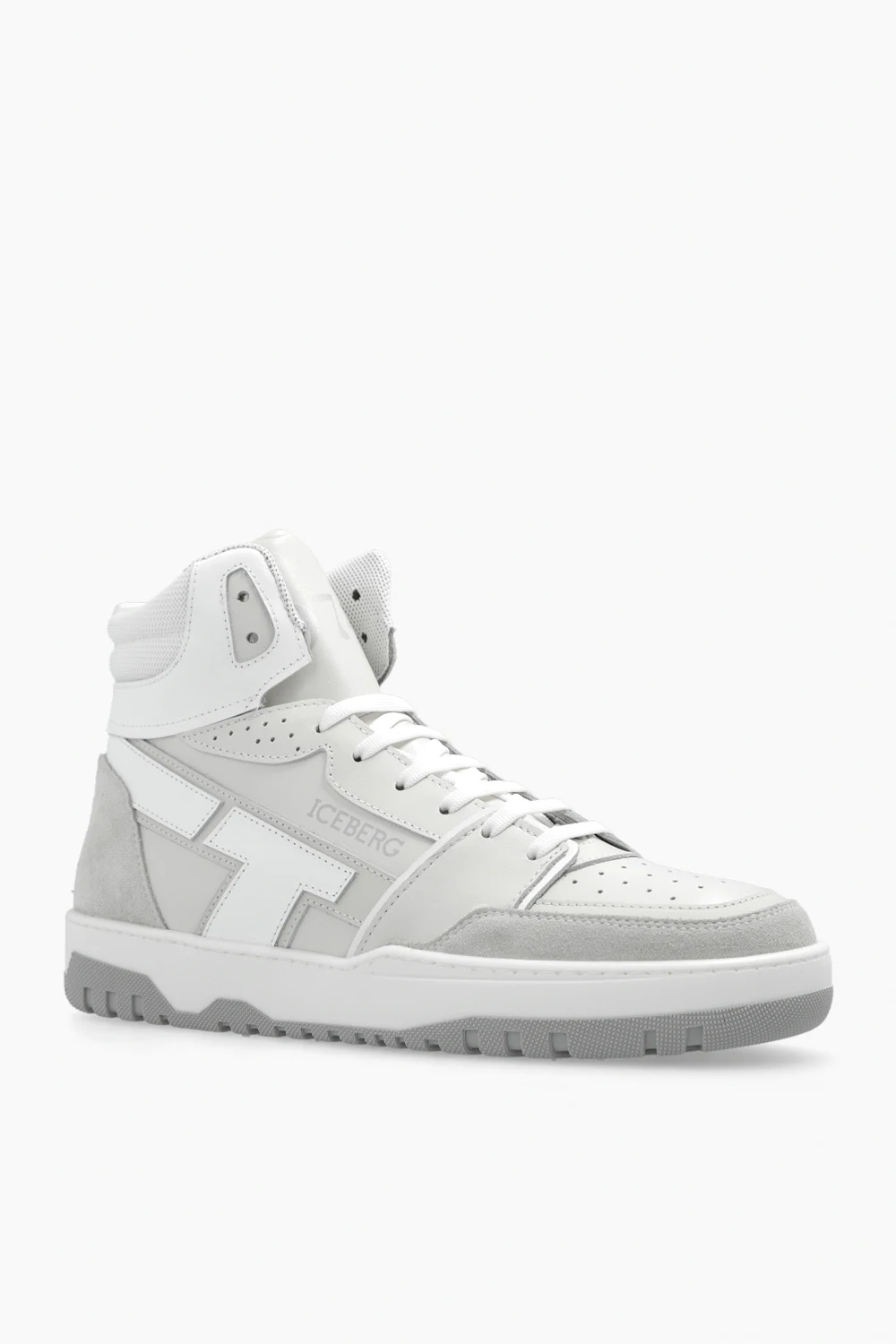 Grey and white 'Okoro' high-top sneakers from Iceberg. Made of leather and trimmed with fabric overlays, this lace-up model sits on a grey and white rubber sole and showcases a printed silver-tone logo and perforations.