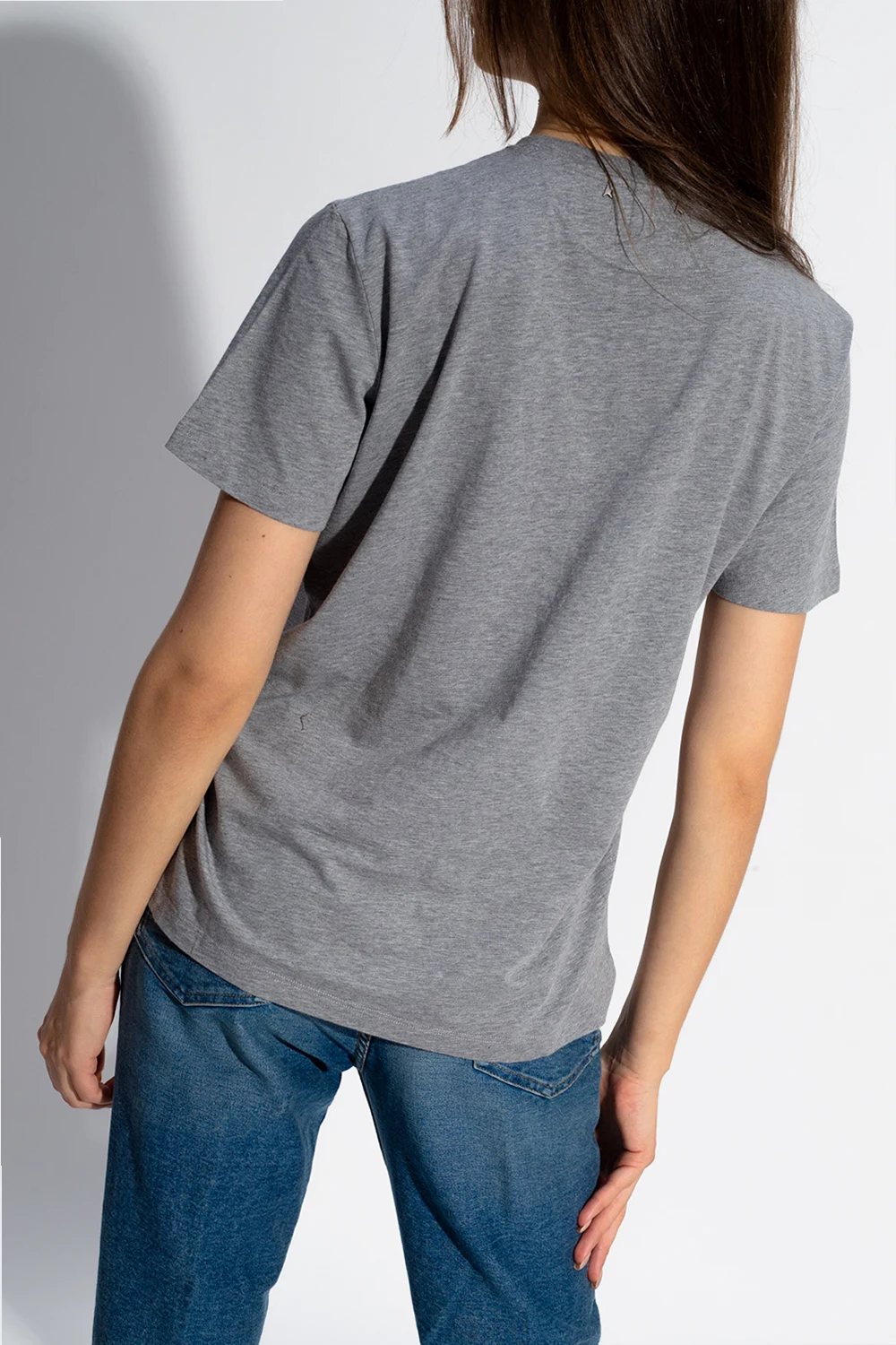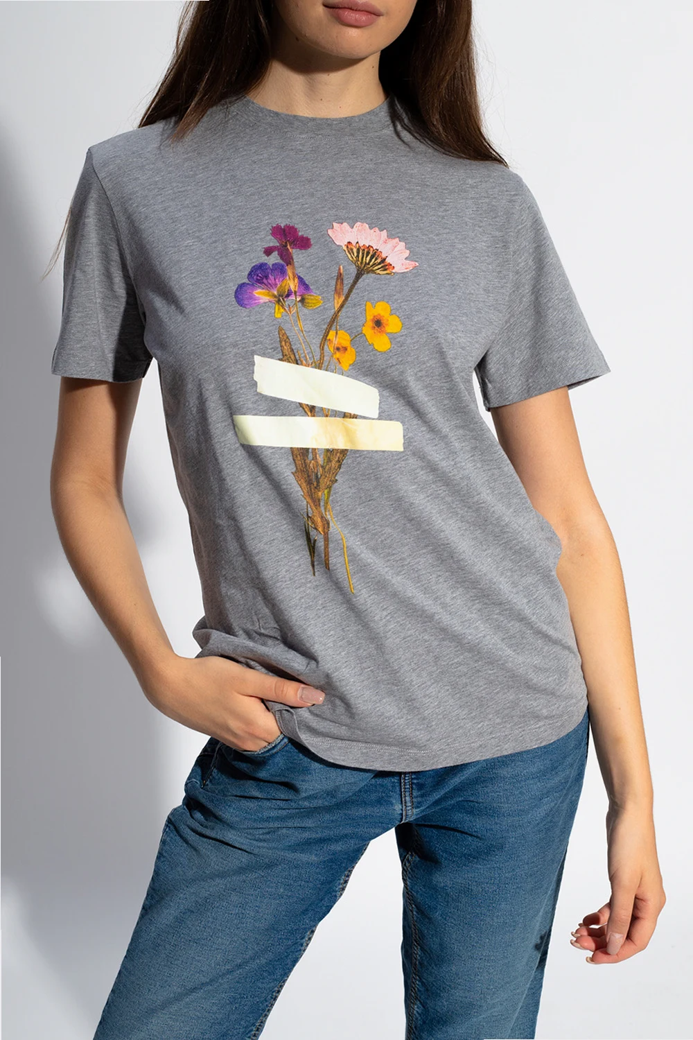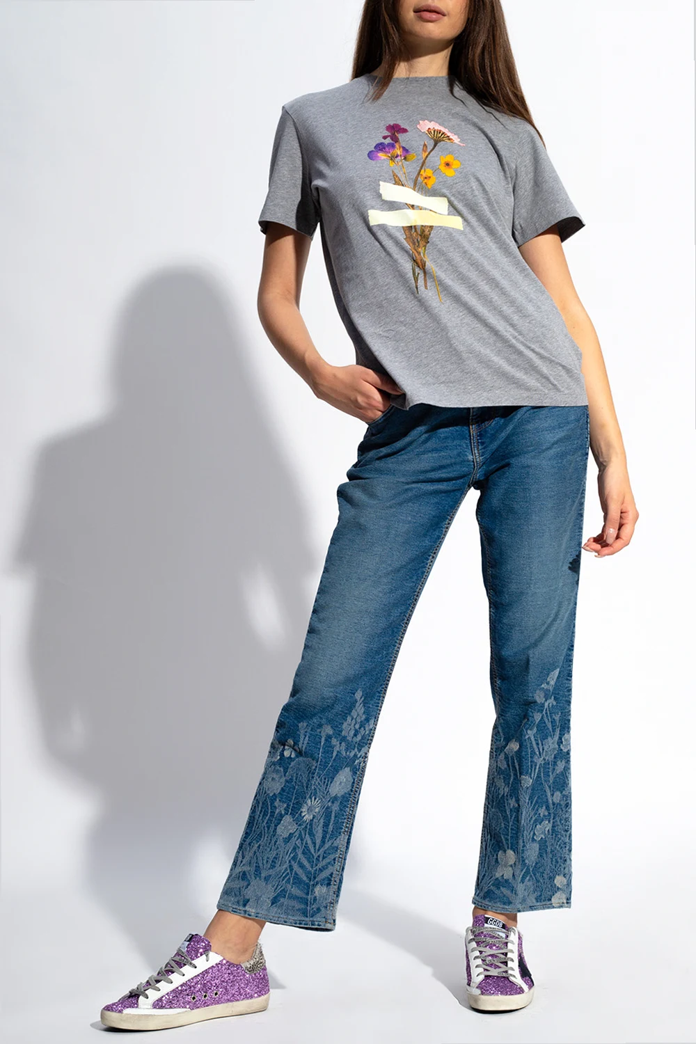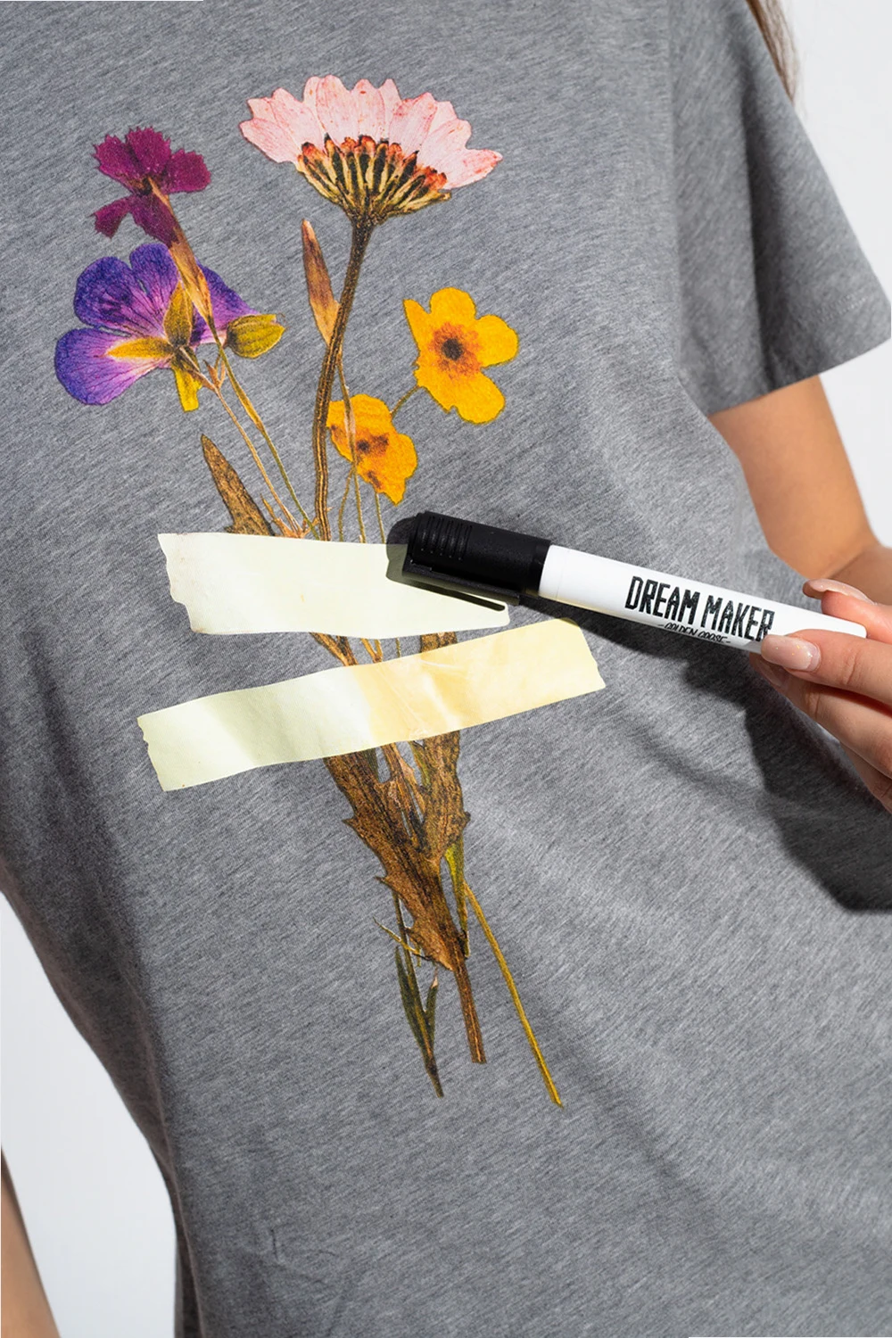 Grey crewneck T-shirt from Golden Goose, the ‘Journey’ collection. Crafted from cotton, this garment is decorated with a multicolored floral print. It comes with a black marker.