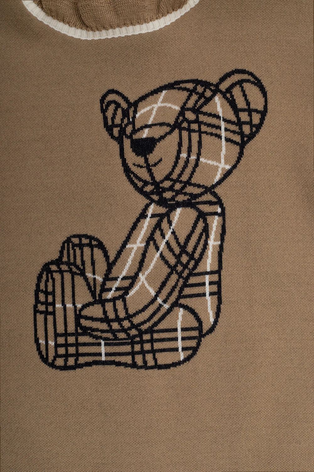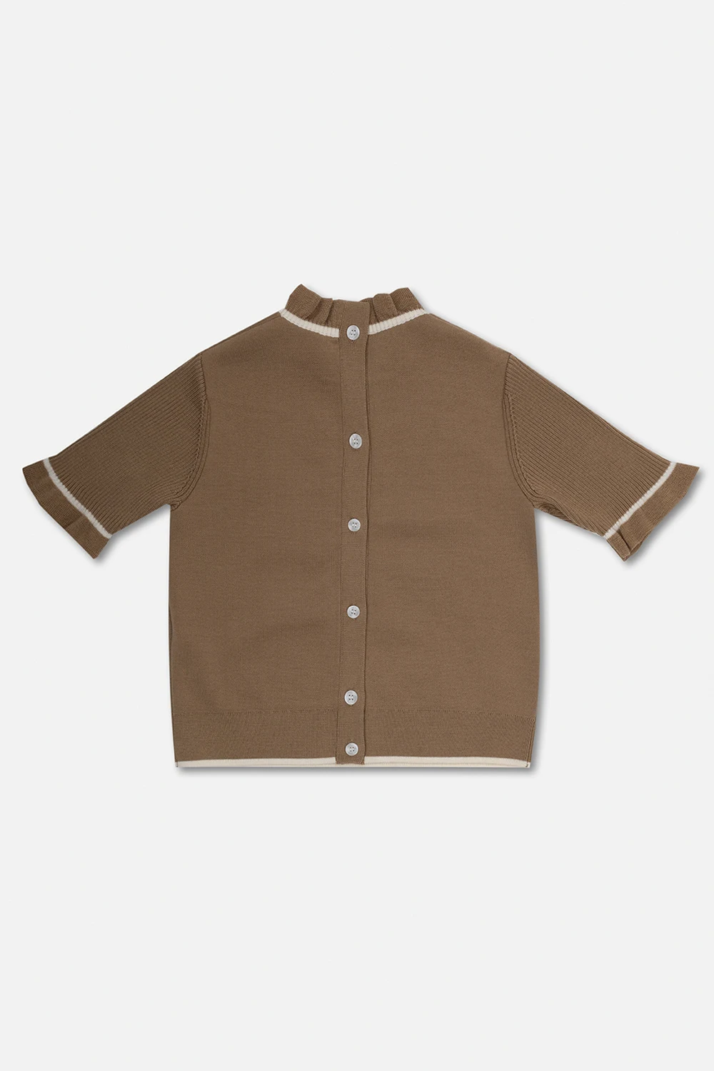 Beige ‘Avrile’ sweater from Burberry Kids. Crafted from wool, this garment features buttons at the back, short ribbed sleeves with ruffles and ribbed hem.
