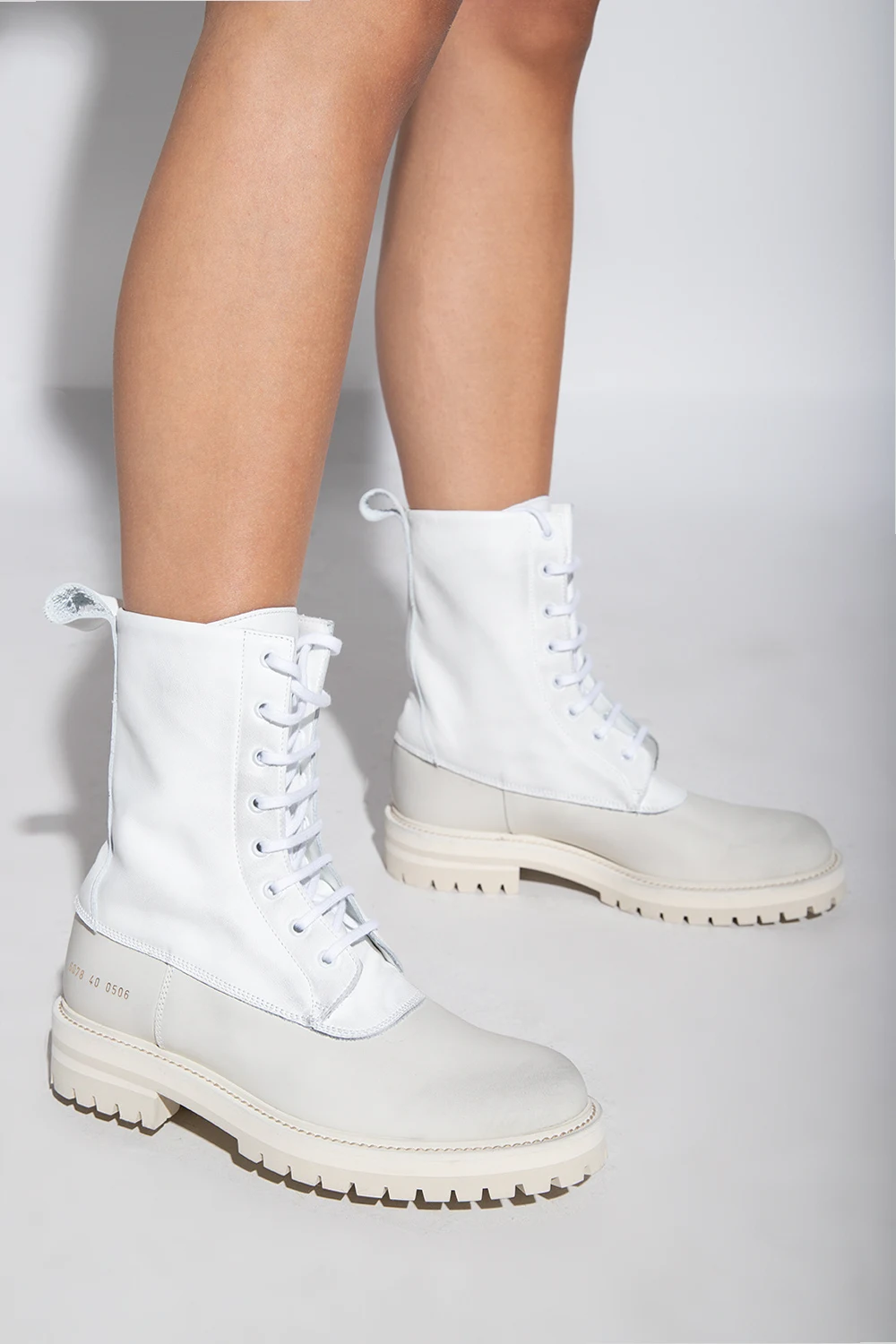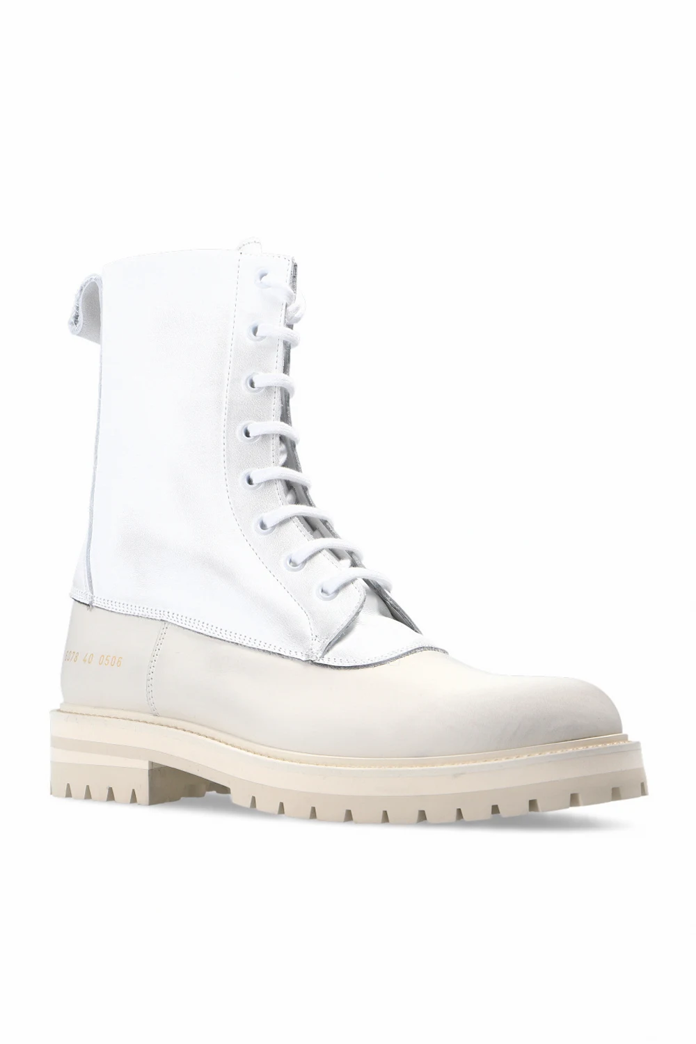 White and light grey ‘Technical’ ankle boots from Common Projects. Crafted from leather, this lace-up pair features a gold-tone print and rubber sole in light grey and cream.