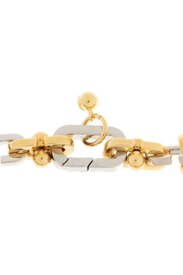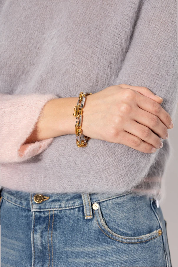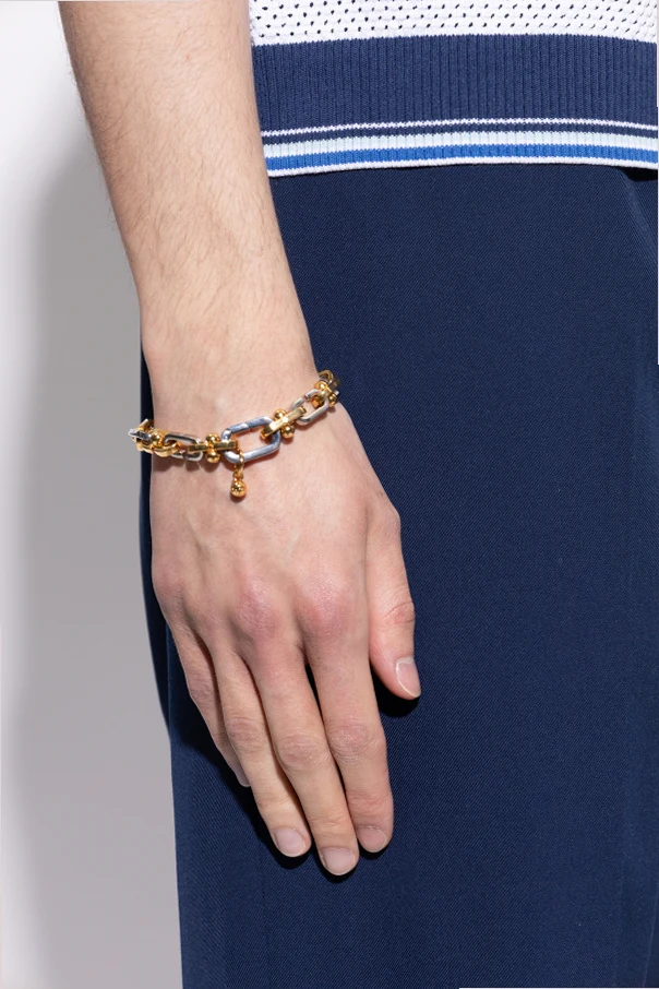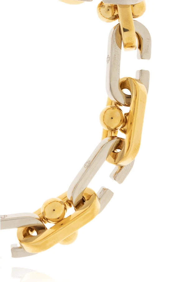 Elevate your style with this gold-plated bracelet by Casablanca, gracefully distinguished by its bold, industrial-inspired silhouette. The piece showcases prominent, elongated, and flattened links, each crafted from premium brass and meticulously gold-finished for a radiant allure. Unexpected touches of silver-tone elements interspersed among the gold create a striking contrast, highlighting the bracelet’s geometric and irregular rhythm.