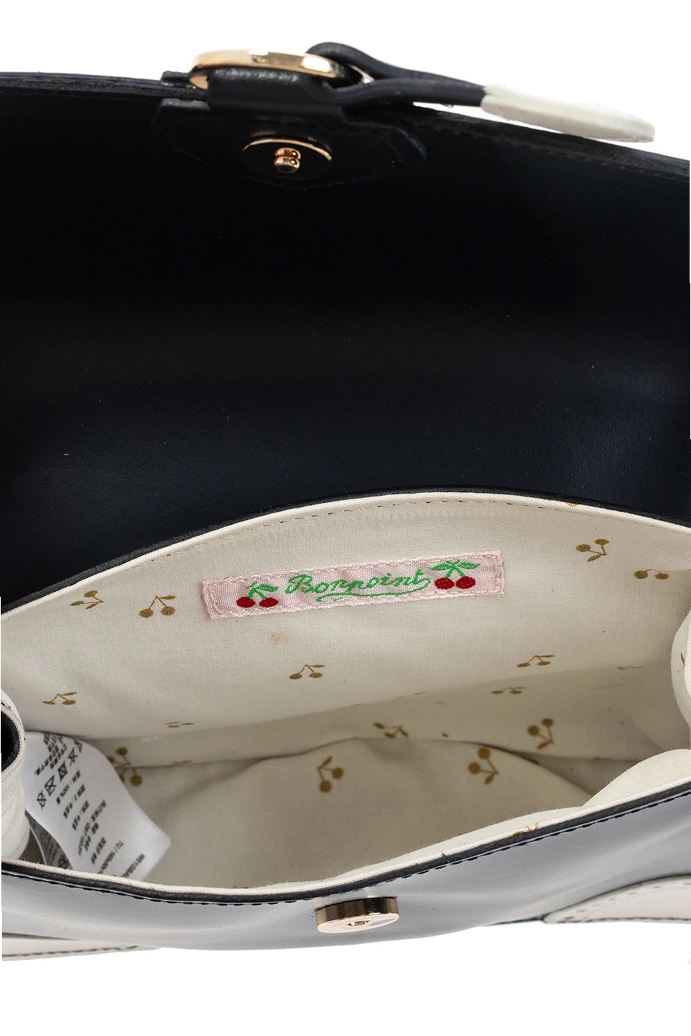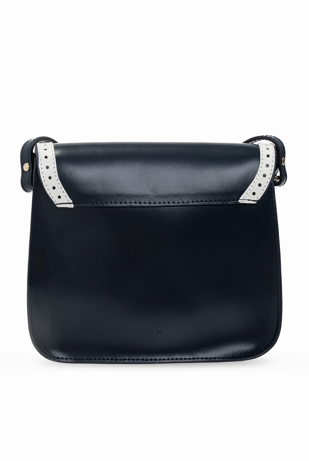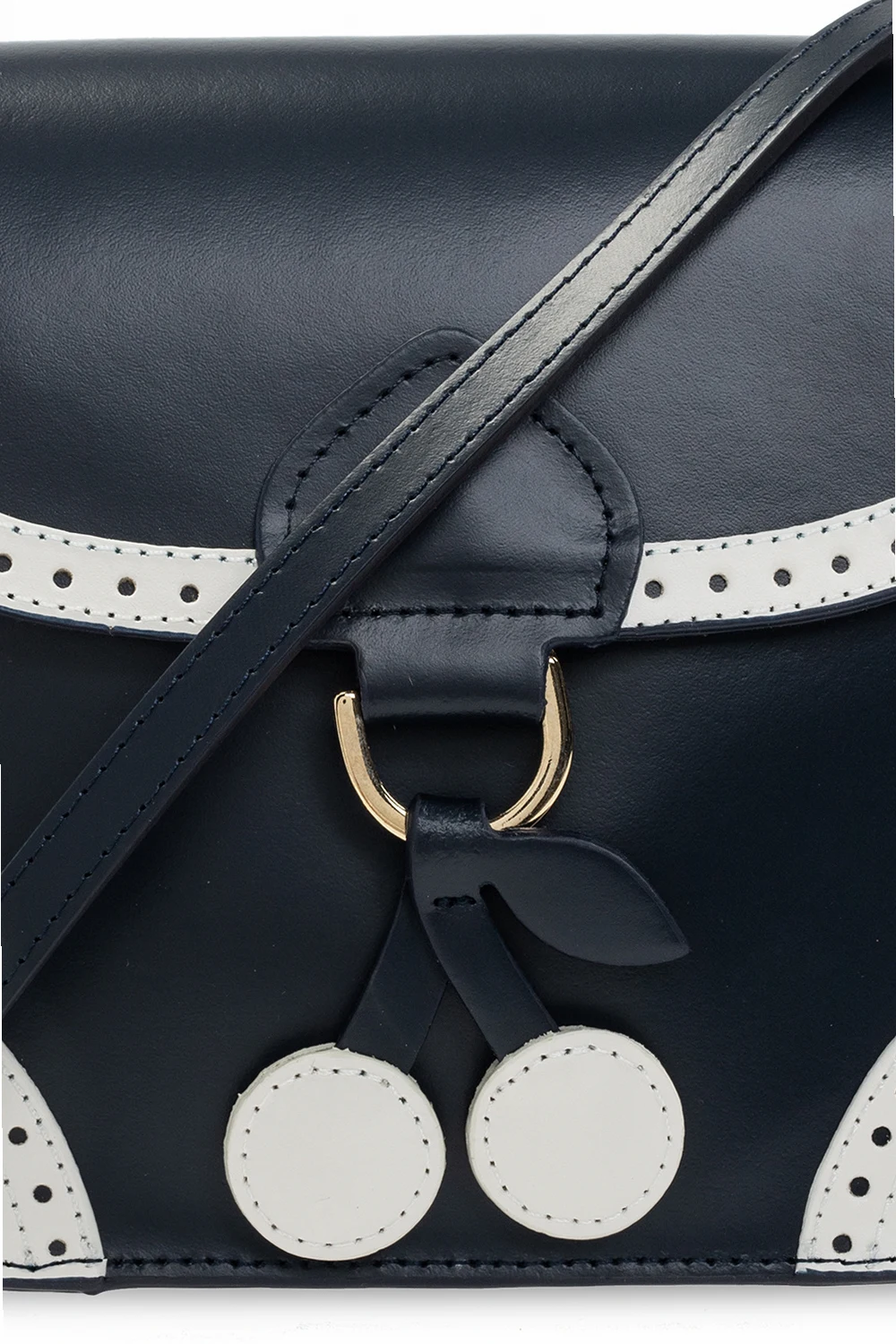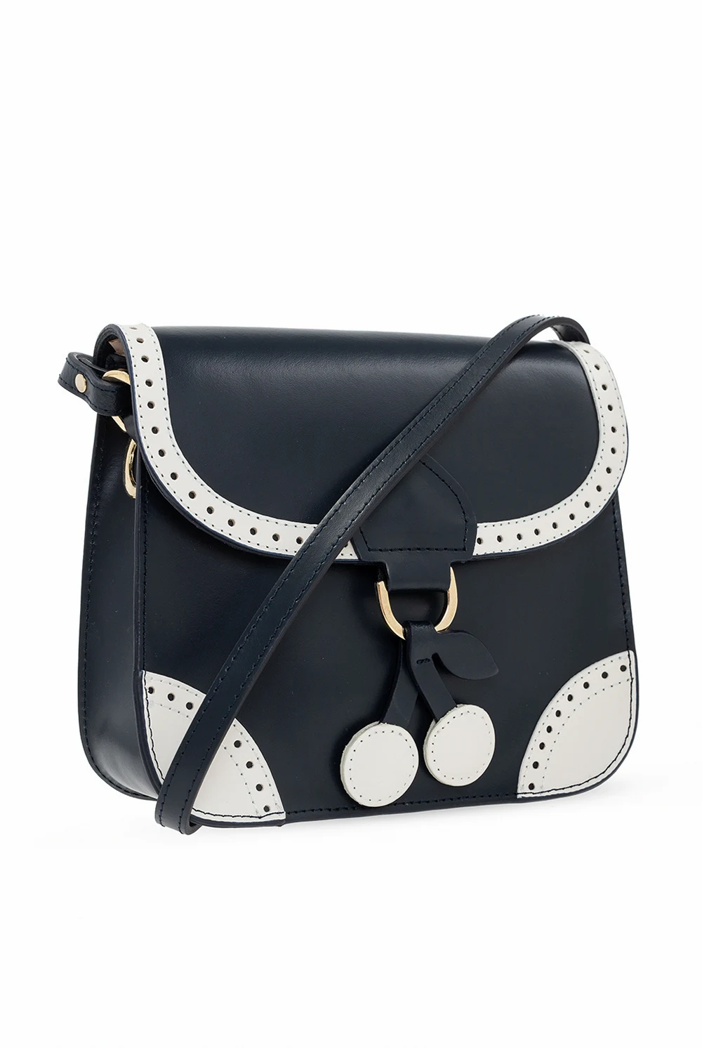 Navy blue and white shoulder bag from Bonpoint Kids. Crafted from leather, this design fastens via a magnetic snap and showcases perforations, a cherry-shaped charm, an adjustable strap, gold-tone metal hardware and a cream cotton-clad interior with one compartment and a gold-tone print.