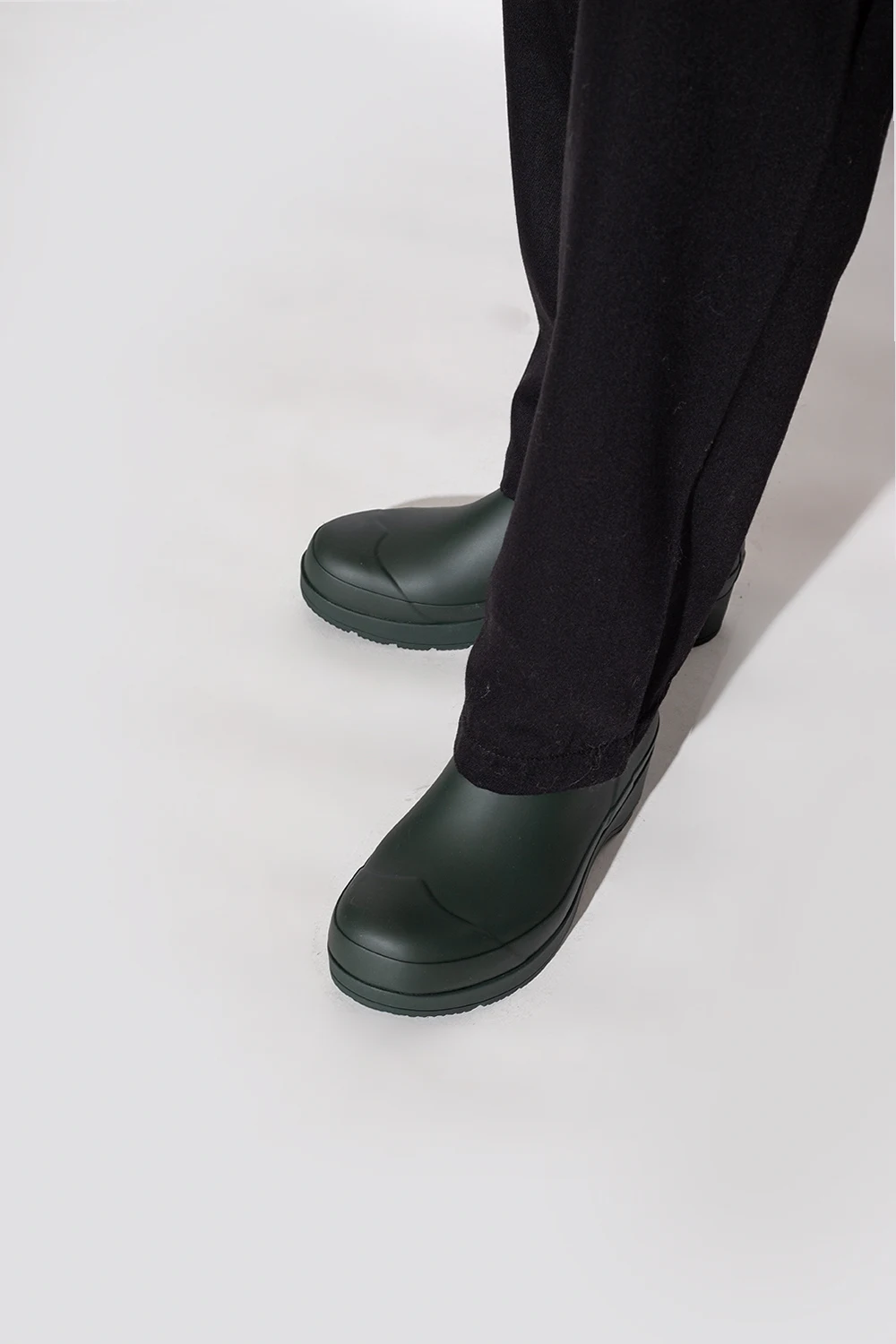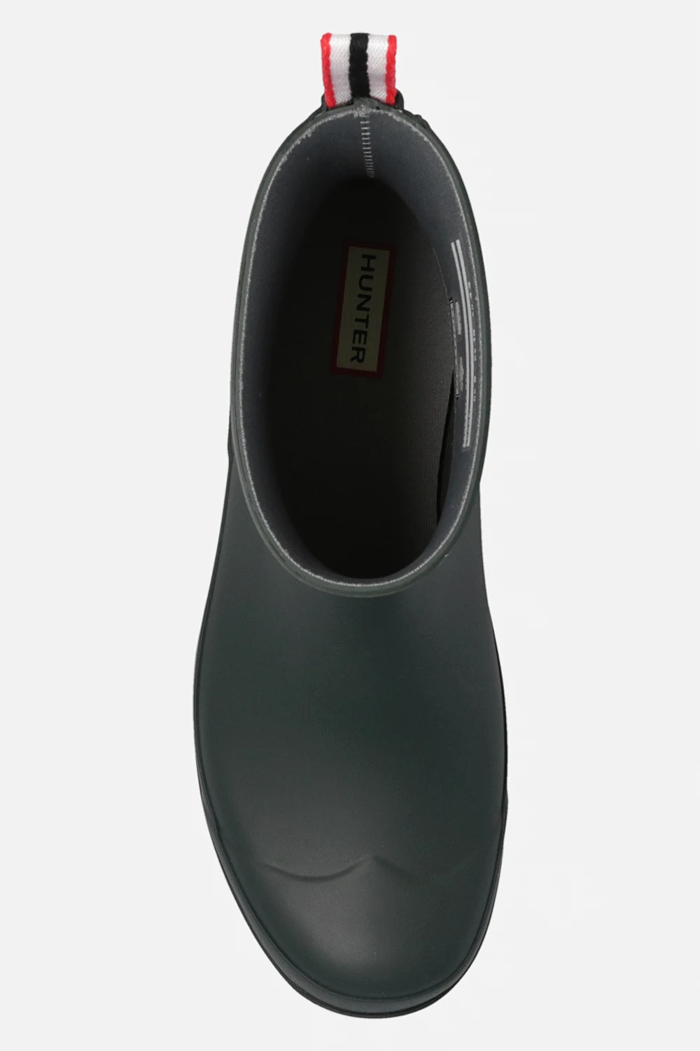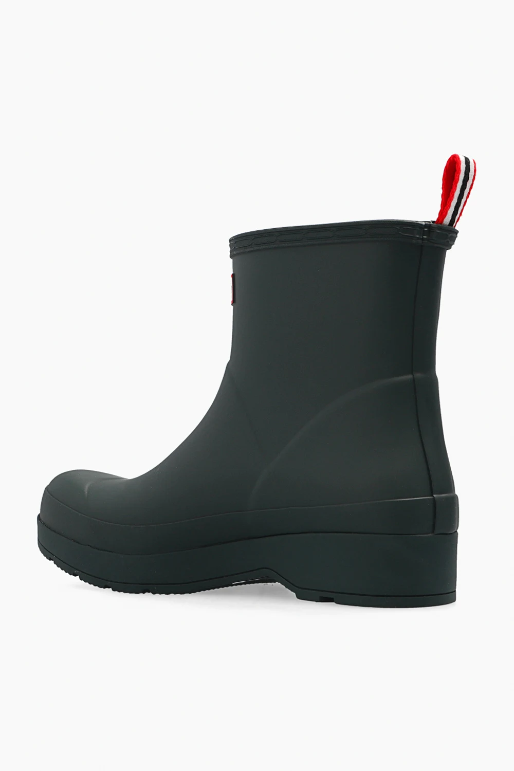 Dark green ‘Play Short’ rain boots from Hunter. Handcrafted from natural vulcanised rubber, this pair features a logo appliqué, fabric pull strap in white, red and navy as well as a rubber outsole with Hunter Original tread pattern.