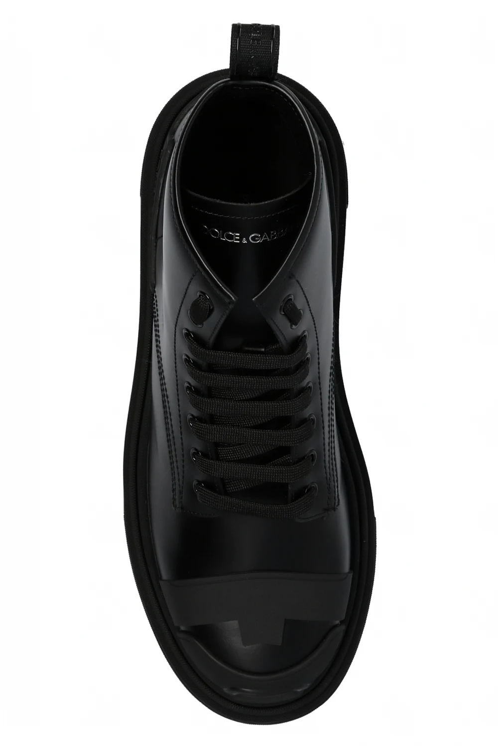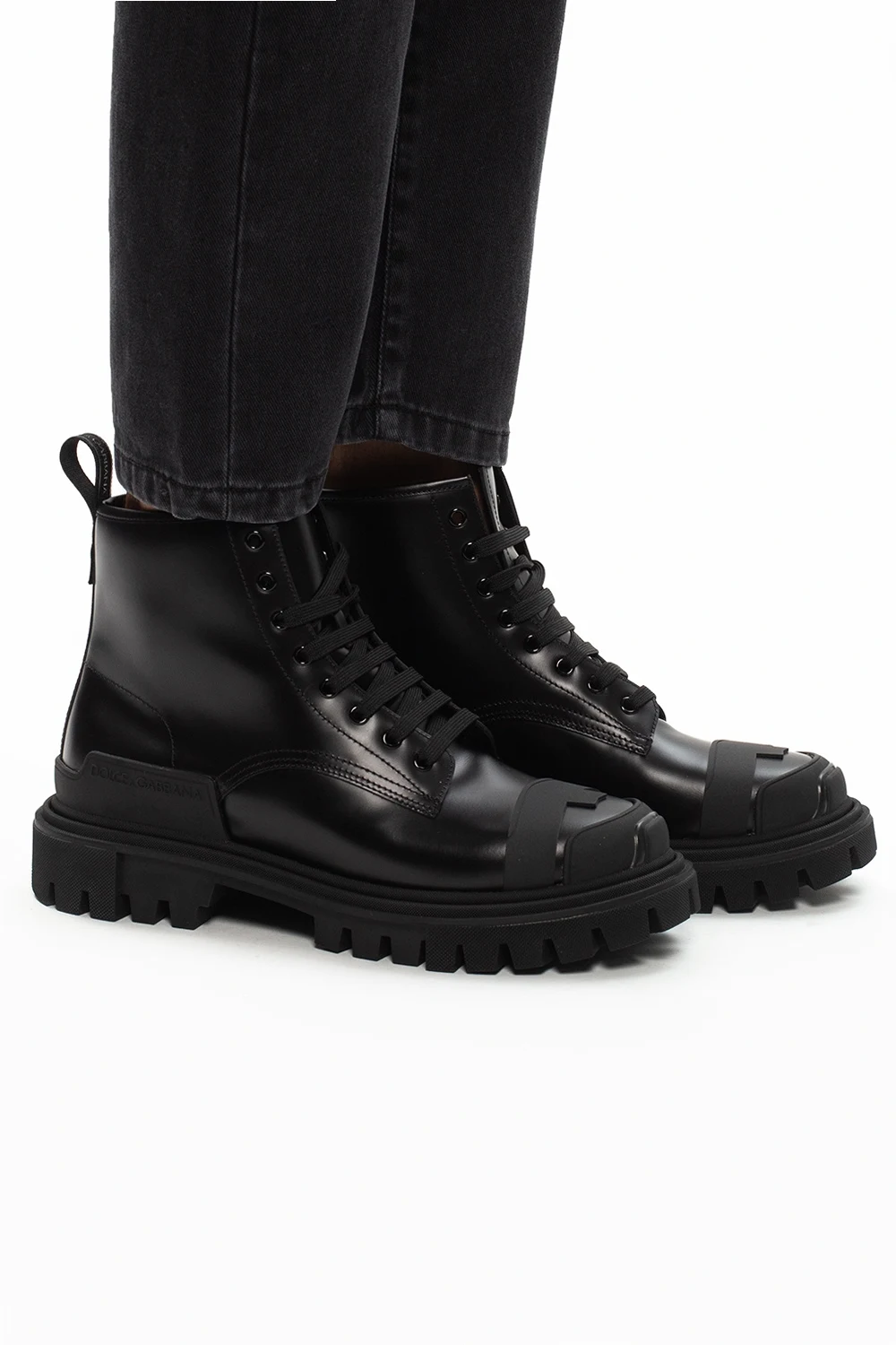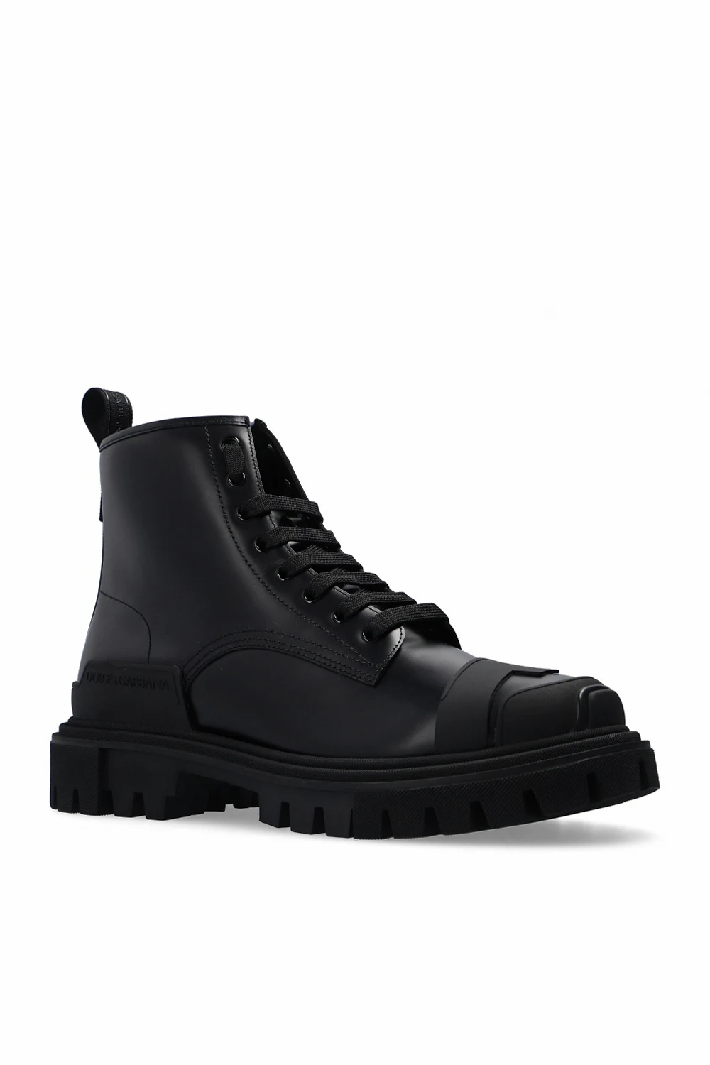 Black ankle boots from Dolce & Gabbana. Crafted from calf leather, this lace-up design features a grosgrain strap, raised logo and a black rubber sole.