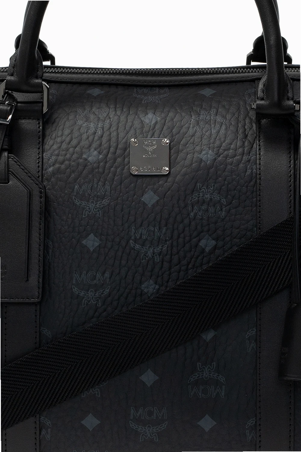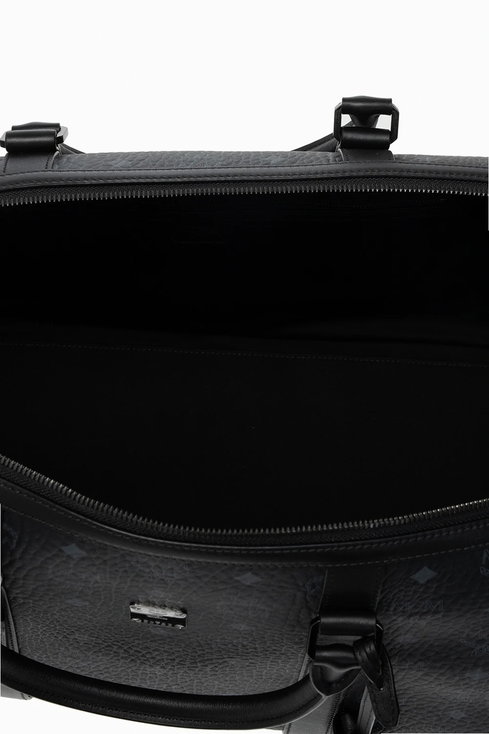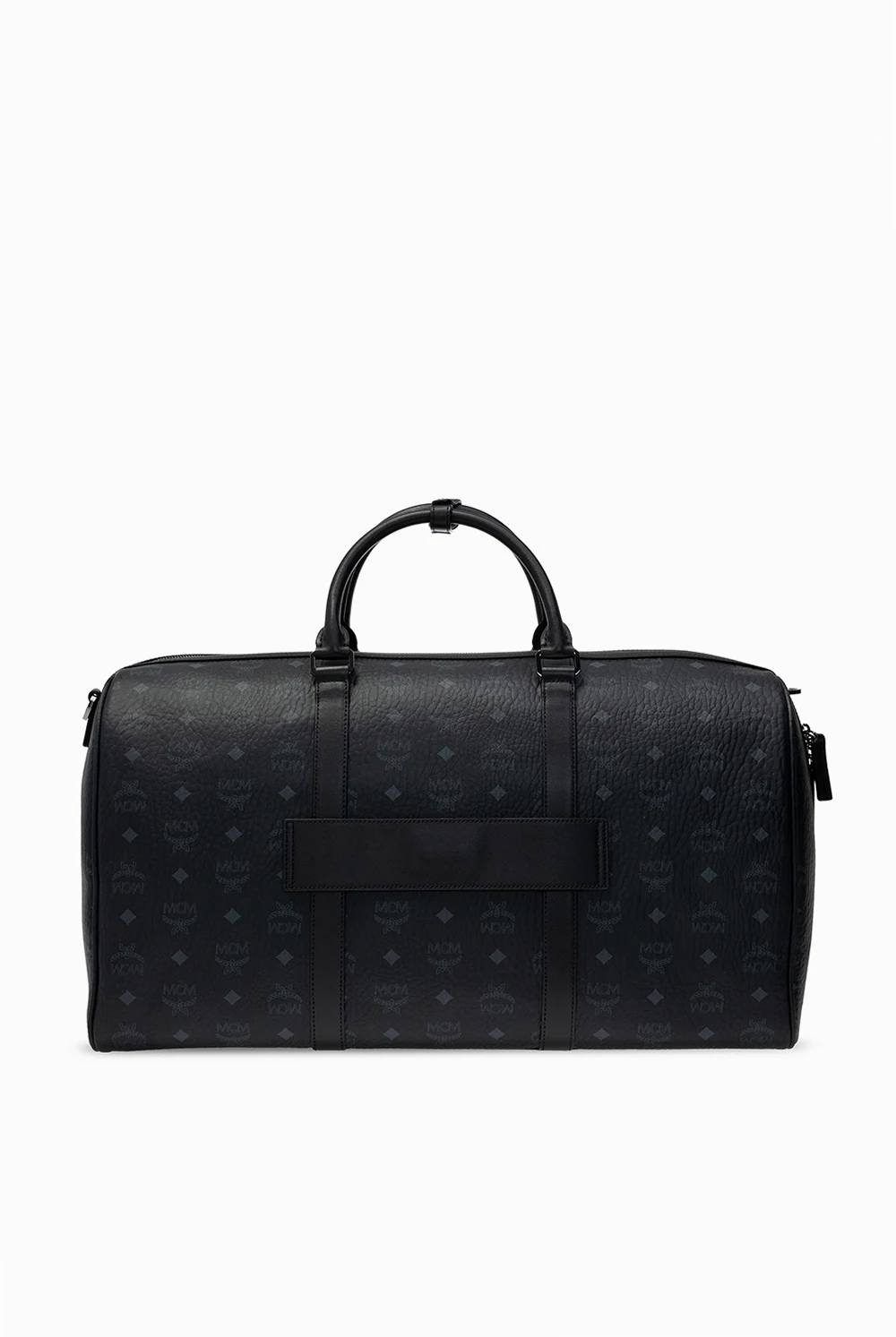 Black holdall bag from MCM. Crafted from canvas with leather trims, this item features a zip fastening, printed logo pattern in grey, metal logo detail, two half-round handles, adjustable removable shoulder strap and gold-tone metal hardware. It also has one internal compartment with one zip pocket and two slip pockets inside as well as two detachable pendants, one including a padlock.