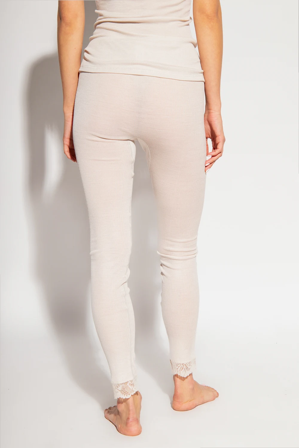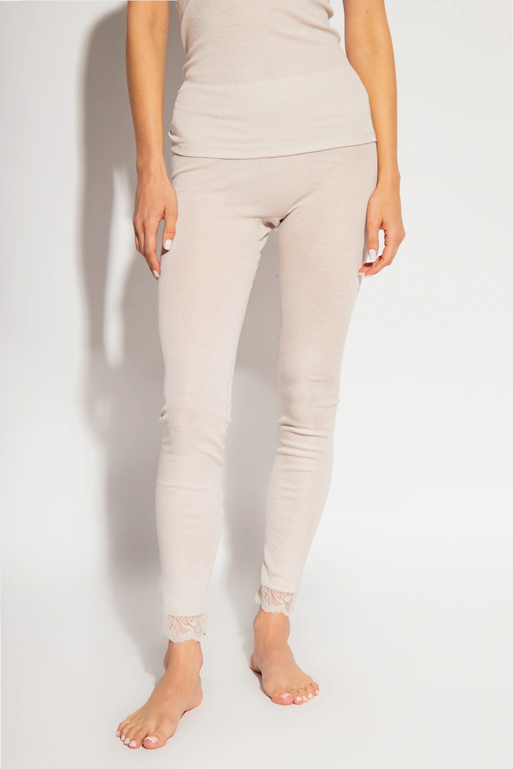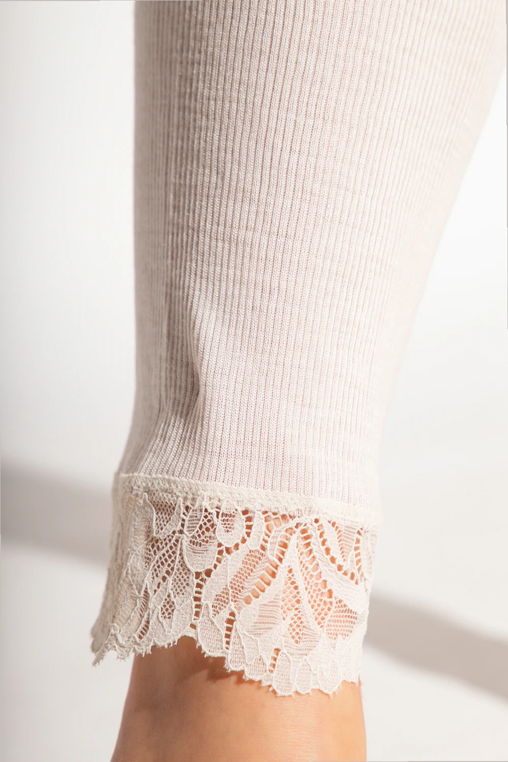 Cream ribbed leggings from Hanro. Crafted from a merino wool and silk blend, this pair features an elastic waistband and lace trims.