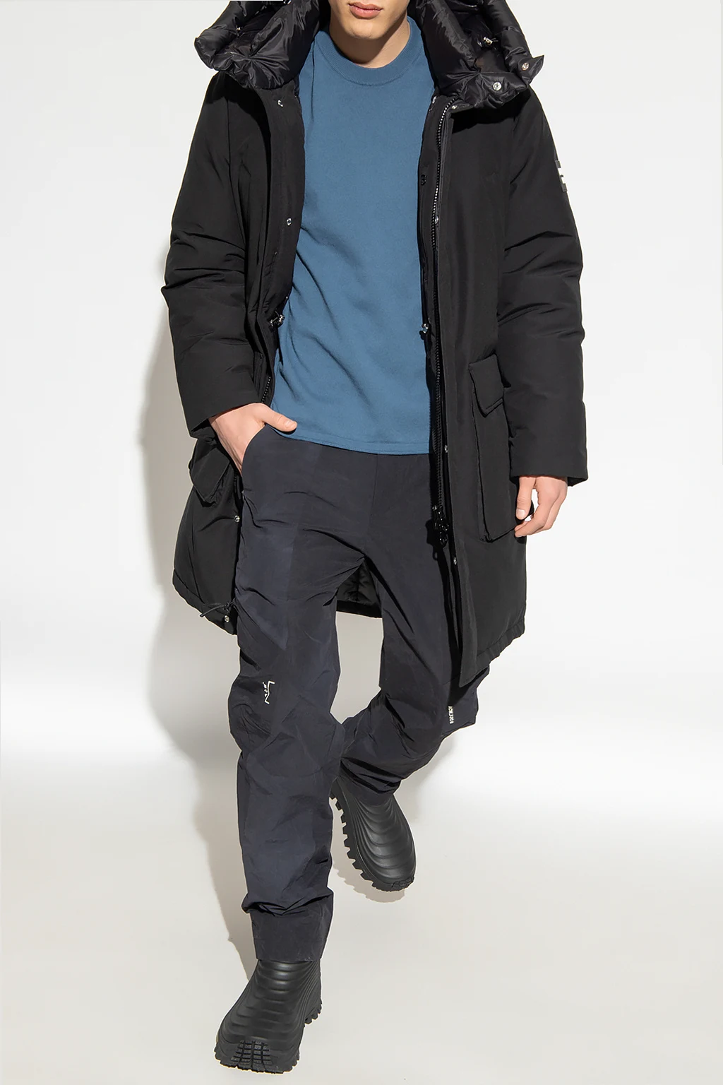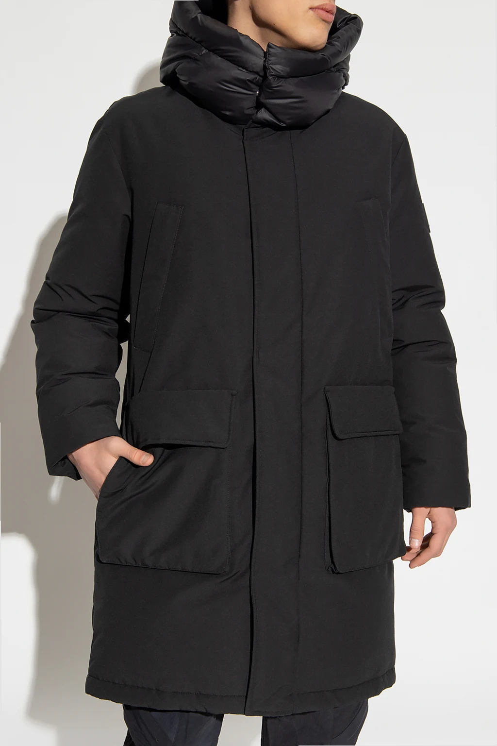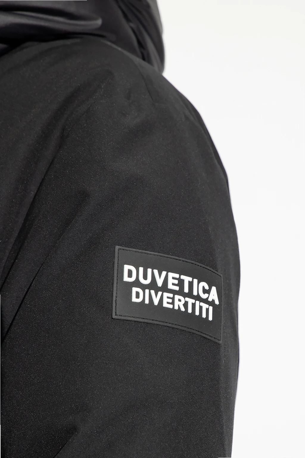 Black ‘Megrez’ hooded down jacket from Duvetica. Fastened with a zip and snaps, this garment features a drawstring waist, four zip pockets, two snap-fastened flap pockets and long sleeves with ribbed cuffs and rubber logo patch.