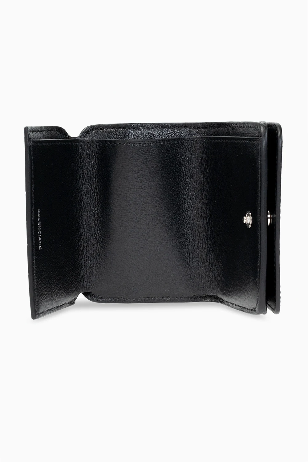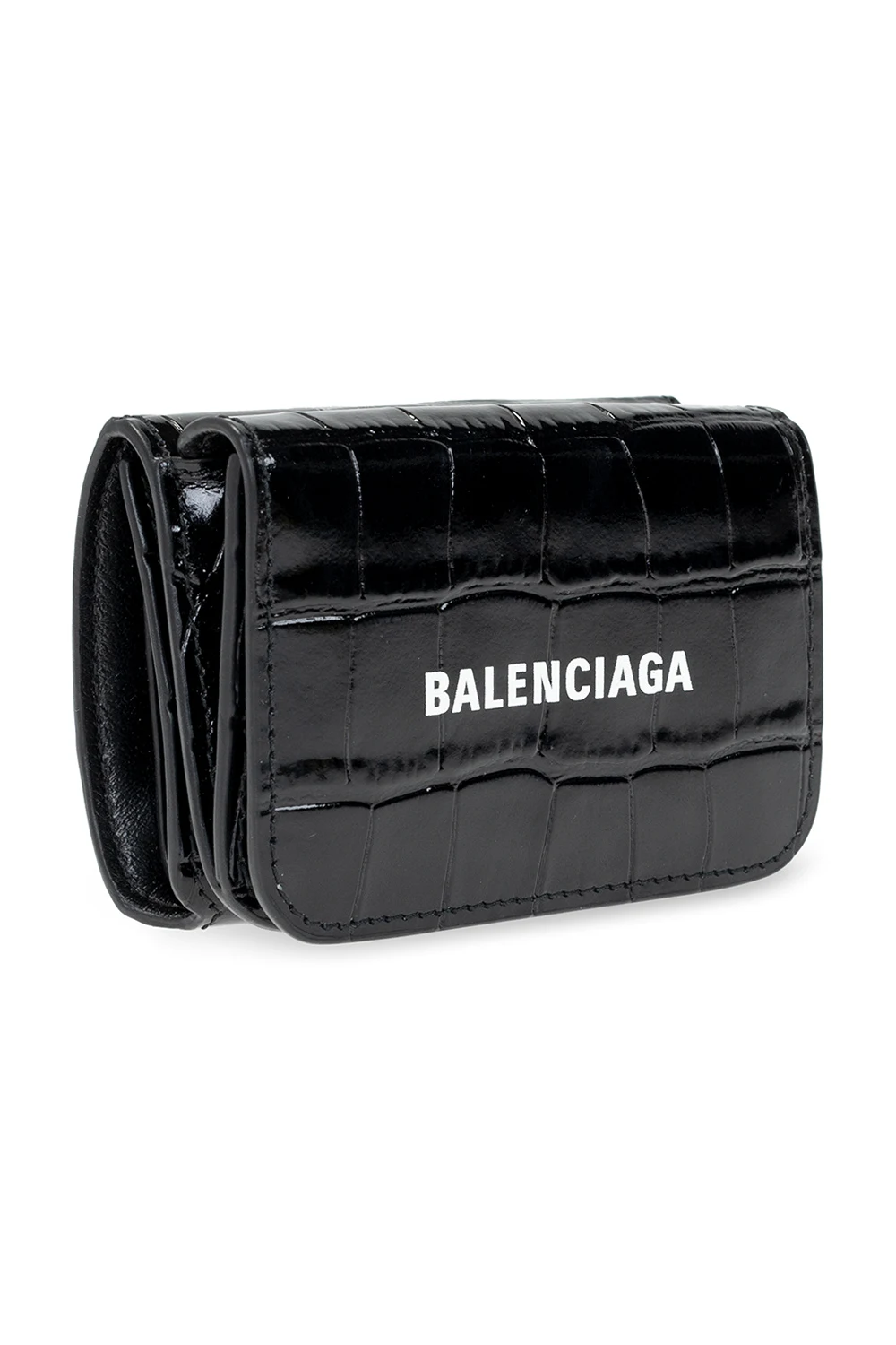 Black folding wallet from Balenciaga. Crafted from leather with a crocodile skin effect, this item fastens via a snap and features a white logo print on the front and a bill compartment, one snap-fastened coin pocket and three card slots inside.