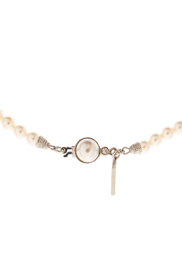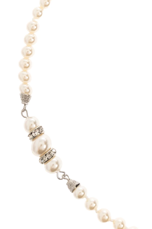 This exquisite Artificial Pearl Necklace by Alessandra Rich effortlessly marries timeless elegance with contemporary sophistication. Adorned with meticulously arranged, cream-hued artificial pearls in varying sizes, the necklace elegantly traces the neckline, its round silhouette offering a graceful drape. Shimmering silver-tone accents and lustrous crystal-like embellishments are artfully interspersed along the strand, adding luminous allure and depth.