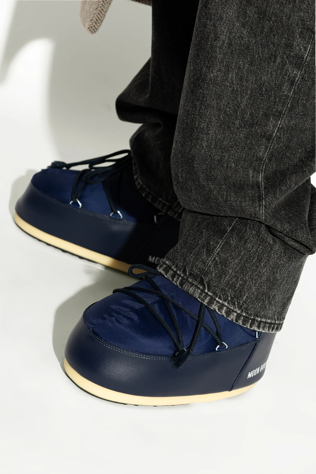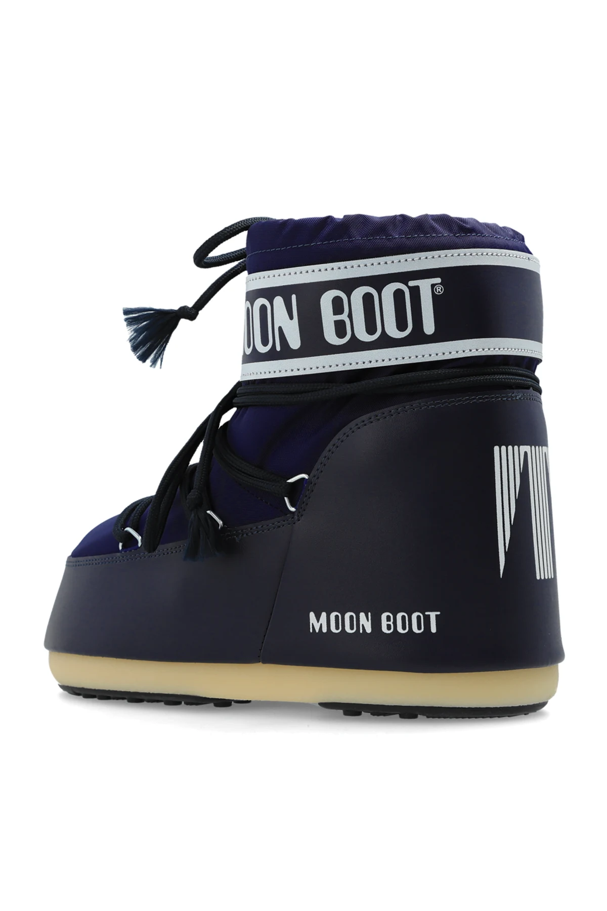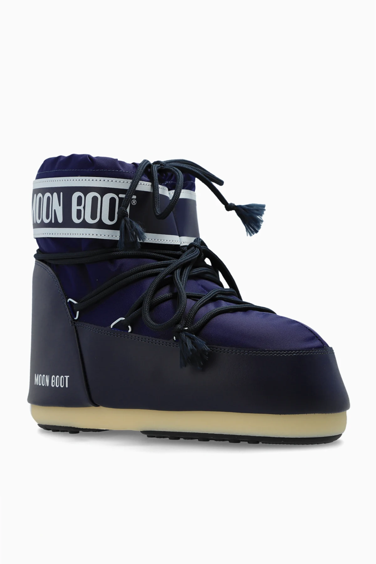 Introducing the Icon Low Nylon men's snow boots in a striking navy blue, designed by the illustrious Moon Boot. These boots epitomize the perfect amalgamation of style and utility, crafted to endure and excel in winter's harshest conditions. The Icon Low Nylon boasts a robust, low-cut silhouette, providing enhanced freedom of movement without compromising on the quintessential bulkiness expected from premium snow footwear. The thick, sturdy sole ensures superior thermal insulation and exceptional grip on snowy surfaces. Constructed with a durable nylon upper, these boots are water-resistant and easy to maintain. Inside, they are lined with soft, white synthetic fur, delivering unparalleled warmth and comfort. The boots feature the iconic "MOON BOOT" branding prominently displayed on the side and upper shaft, adding a touch of signature style. Thoughtfully designed with functional laces around the shaft and ankle, these boots offer a customizable fit while the tassel-ended laces enhance their unique character. The light-colored sole contrasts elegantly with the navy blue exterior, highlighting the meticulous attention to detail in their design. Why Choose This Product? Elegant and distinctive design by Moon Boot Durable nylon upper and synthetic fur lining for optimal warmth Ergonomic construction for superior comfort in harsh winter conditions Thick, grippy sole for excellent traction on snow Customizable fit with stylish lace detailing
