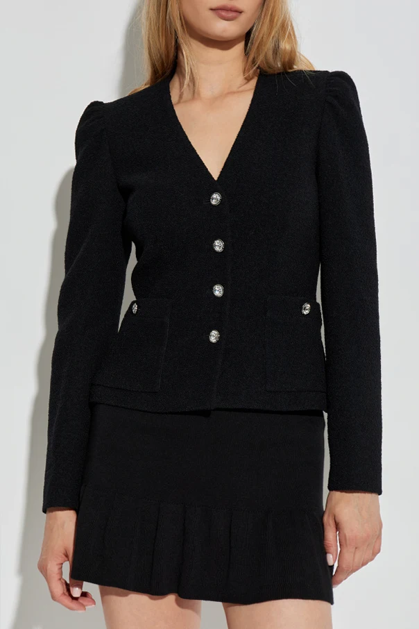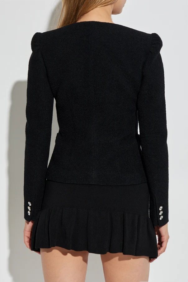 The Shimmering Button Blazer by Alessandra Rich epitomizes timeless sophistication in women’s tailoring. Crafted from a refined bouclé-inspired fabric, it boasts a tailored, elongated silhouette that artfully flatters the feminine form. Subtly structured shoulders and delicately puffed sleeves add a contemporary allure, while the deep black hue exudes understated opulence. This blazer is elevated by four jewel-like, crystal-cut buttons set in gleaming metal frames, capturing the light with every movement. The tactile blend of wool and polyamide enhances both durability and comfort, beautifully lined for a polished finish. An exquisite fusion of modern artistry and perennial elegance, this piece is the ultimate wardrobe statement. Why choose this product? Exclusive Alessandra Rich design with signature crystal buttons Luxurious fabric with a distinguished tweed-inspired texture Expertly tailored silhouette, enhancing every figure Versatile black shade suited for any refined occasion