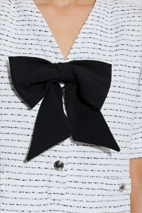 Discover the epitome of sophistication with this tweed mini dress by Alessandra Rich . Crafted from premium tweed, its subtly textured surface radiates refined distinction, perfectly echoed by a deep black hue. The dress features a sleek, tailored silhouette with gently structured short sleeves and a captivating V-neckline, beautifully accentuated by a dramatic, oversized bow—an emblem of elevated femininity.