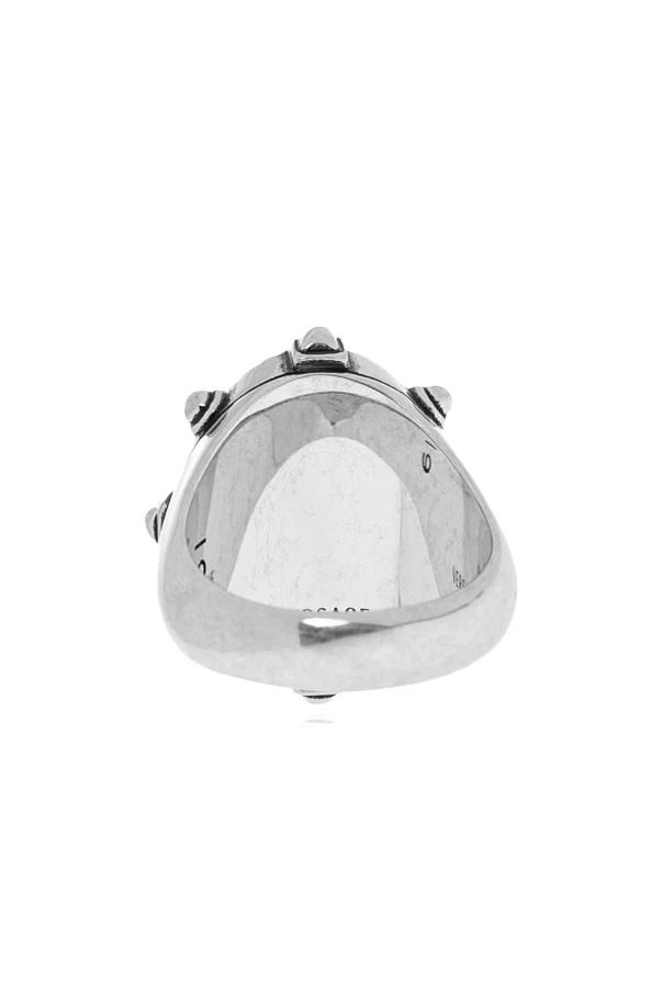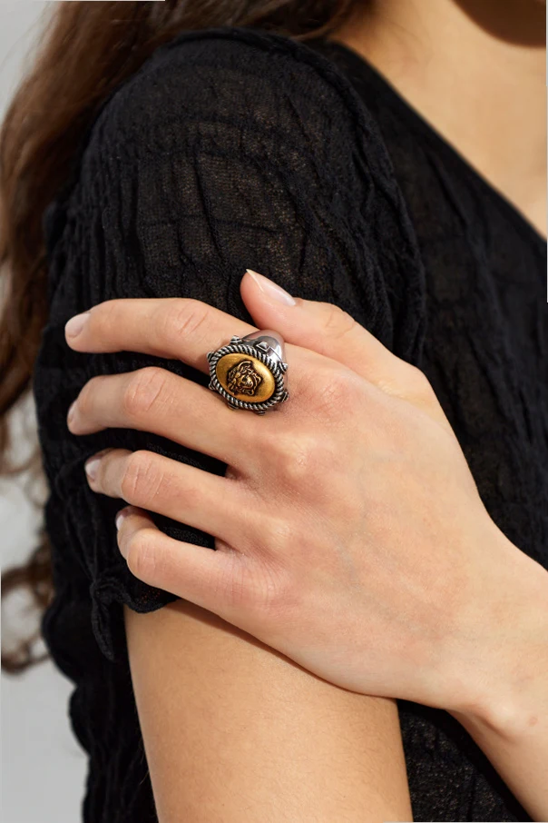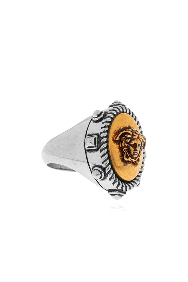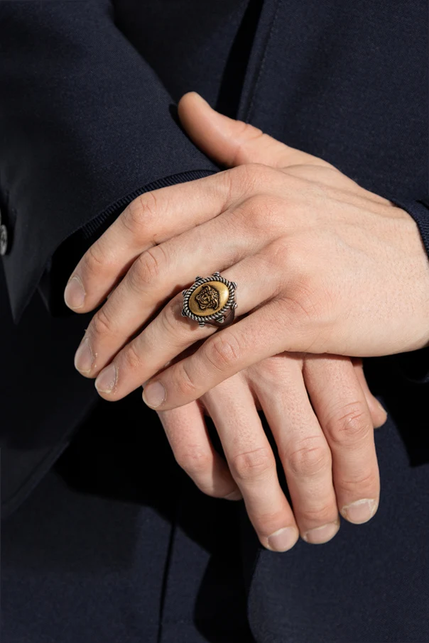 A twisted, decorative silver border frames the iconic motif, infusing the piece with depth and refined distinction. Meticulously fashioned from premium brass, this ring seamlessly merges classic elegance with modern artistry, embodying Versace’s celebrated fusion of Italian tradition and innovation.