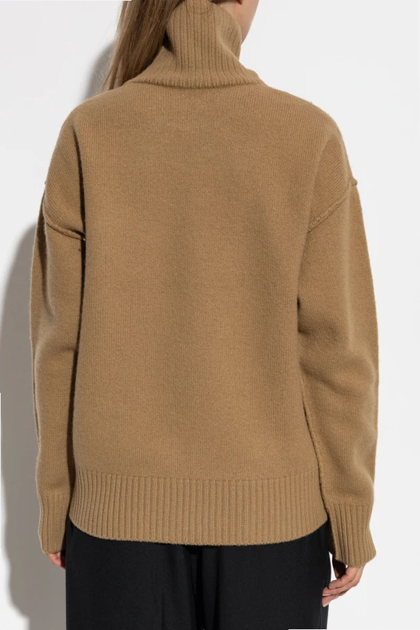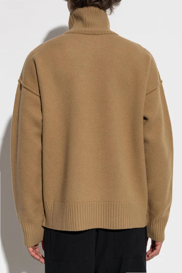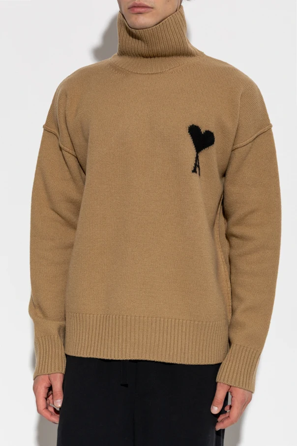 Discover refined sophistication with this luxurious wool turtleneck sweater from AMI Alexandre Mattiussi’s exclusive collection. Crafted from distinctive, high-quality knitted wool, its prominent textured finish ensures lasting softness and remarkable durability. The relaxed, oversized silhouette—with its elongated, elastic turtleneck and gracefully dropped shoulders—exudes a contemporary, effortlessly chic appeal. Bold ribbed hems and cuffs provide an elegant structure, while the single-tone design is accentuated by a striking signature touch: a black applique heart entwined with the letter “A” on the left chest, a celebrated hallmark of this renowned Parisian house.
