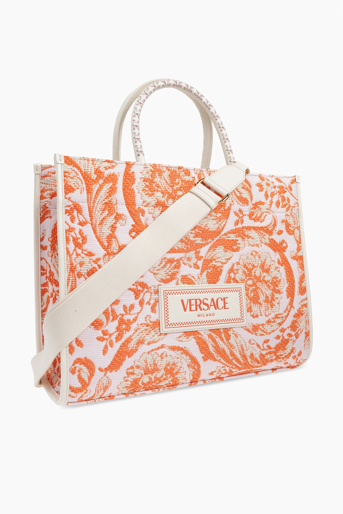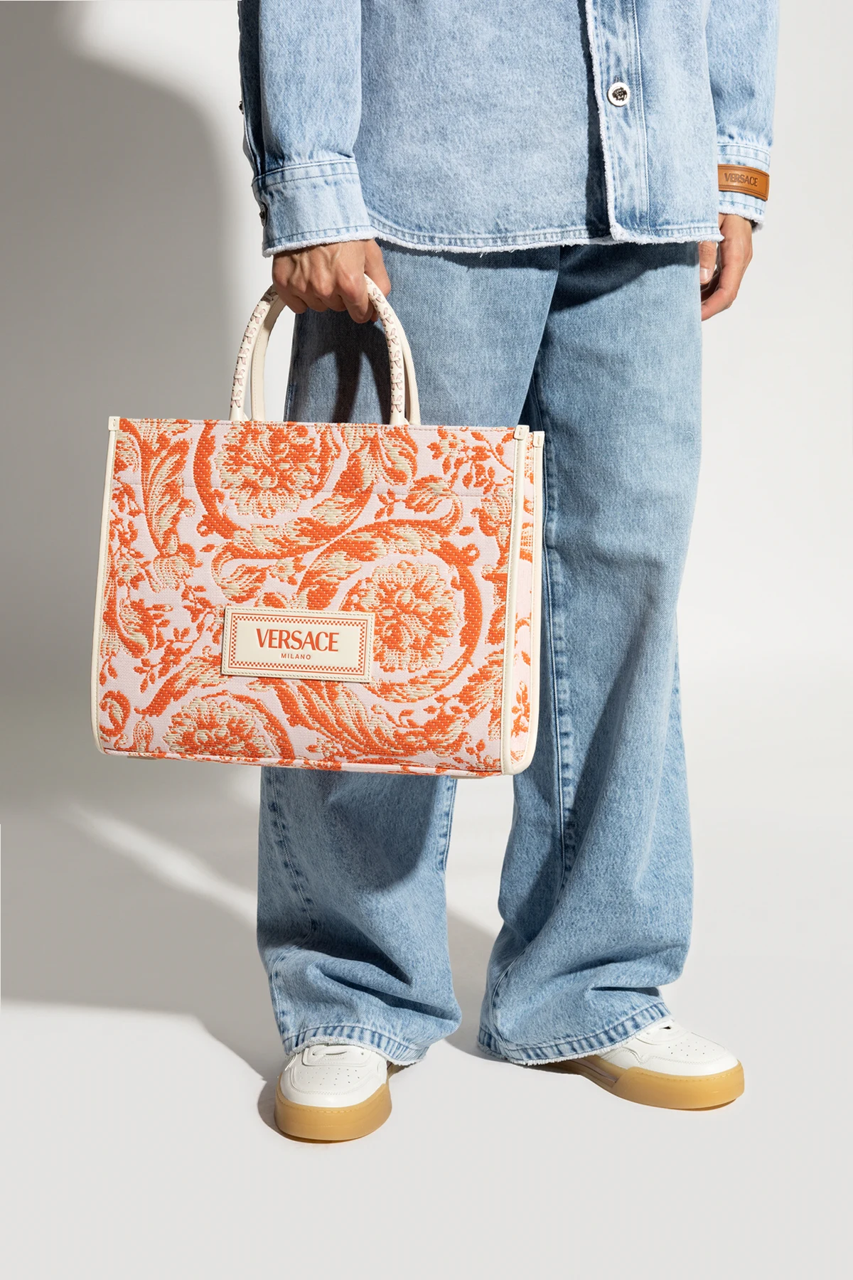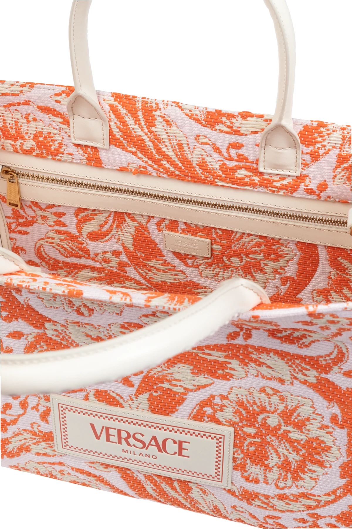 Introducing the 'Barocco Athena Large' shopper tote, a vibrant testament to the Versace legacy. This meticulously crafted piece boasts an opulent orange hue, adorned with intricate, baroque-style floral patterns that command attention. The complexity of the design, featuring bold and exaggerated elements, encapsulates the essence of luxury and sophistication. The tote's rectangular shape with vertical sides creates a sleek, tapered appearance, while the front is elegantly punctuated with a rectangular designer patch featuring the VERSACE logo. This detail, set against a harmoniously colored background, underscores the bag's luxury identity. Equipped with two handles and a long, adjustable, and detachable shoulder strap, this bag offers versatility in wearability, adapting effortlessly to your style needs. Crafted from a durable textile blend of viscose, polyester, and cotton, with a cotton-lined interior, this shopper tote promises longevity and practicality for everyday use. The addition of a zippered compartment inside enhances the functionality, ensuring your belongings are secure and organized. Accents of calf leather add a final touch of elegance, making the 'Barocco Athena Large' not only a statement piece but a testament to exquisite craftsmanship. Why Purchase This Product? Exclusive Versace design, perfect for those who appreciate high fashion and unique patterns. Functional and versatile, with multiple carrying options and a secure zippered interior compartment. Made from high-quality materials, ensuring durability and longevity. Unmistakable luxury appeal, with detailed craftsmanship and elegant accents.