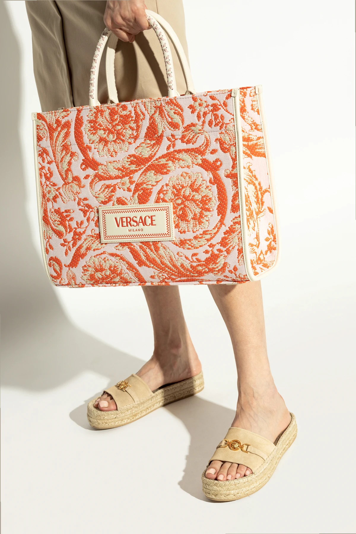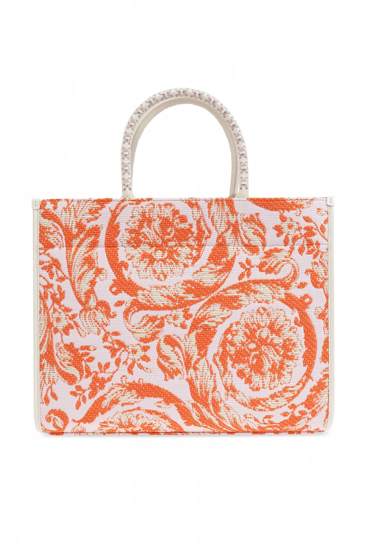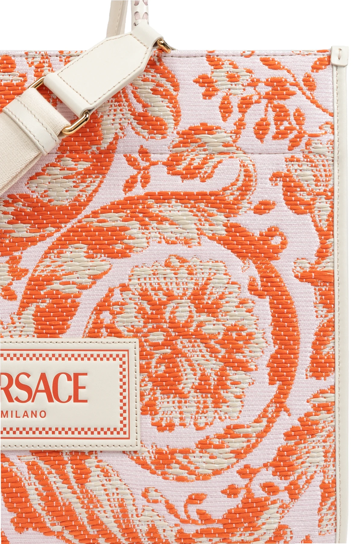 Introducing the 'Barocco Athena Large' shopper tote, a vibrant testament to the Versace legacy. This meticulously crafted piece boasts an opulent orange hue, adorned with intricate, baroque-style floral patterns that command attention. The complexity of the design, featuring bold and exaggerated elements, encapsulates the essence of luxury and sophistication. The tote's rectangular shape with vertical sides creates a sleek, tapered appearance, while the front is elegantly punctuated with a rectangular designer patch featuring the VERSACE logo. This detail, set against a harmoniously colored background, underscores the bag's luxury identity. Equipped with two handles and a long, adjustable, and detachable shoulder strap, this bag offers versatility in wearability, adapting effortlessly to your style needs. Crafted from a durable textile blend of viscose, polyester, and cotton, with a cotton-lined interior, this shopper tote promises longevity and practicality for everyday use. The addition of a zippered compartment inside enhances the functionality, ensuring your belongings are secure and organized. Accents of calf leather add a final touch of elegance, making the 'Barocco Athena Large' not only a statement piece but a testament to exquisite craftsmanship. Why Purchase This Product? Exclusive Versace design, perfect for those who appreciate high fashion and unique patterns. Functional and versatile, with multiple carrying options and a secure zippered interior compartment. Made from high-quality materials, ensuring durability and longevity. Unmistakable luxury appeal, with detailed craftsmanship and elegant accents.
