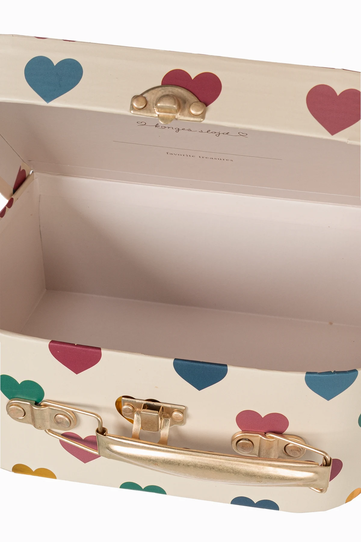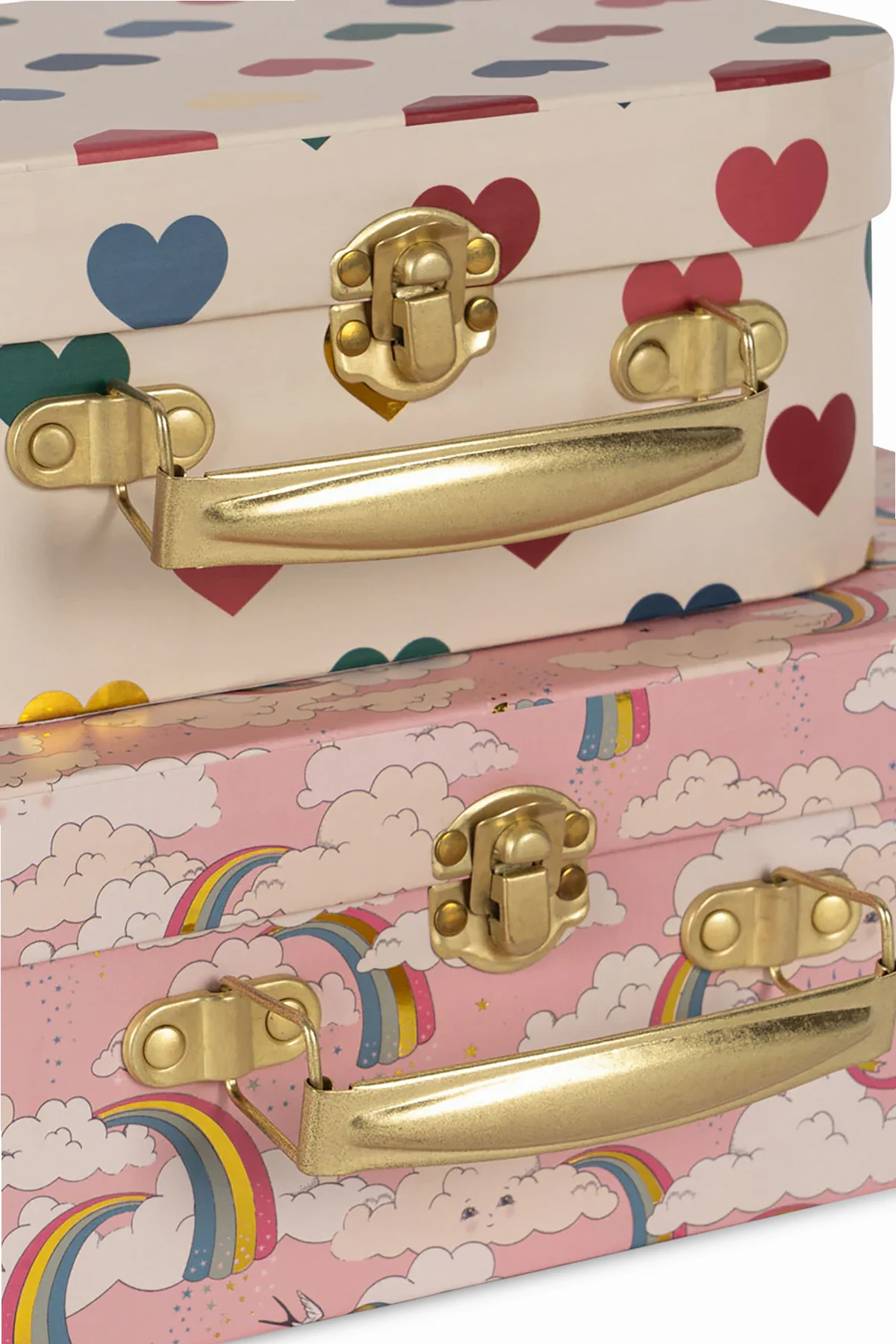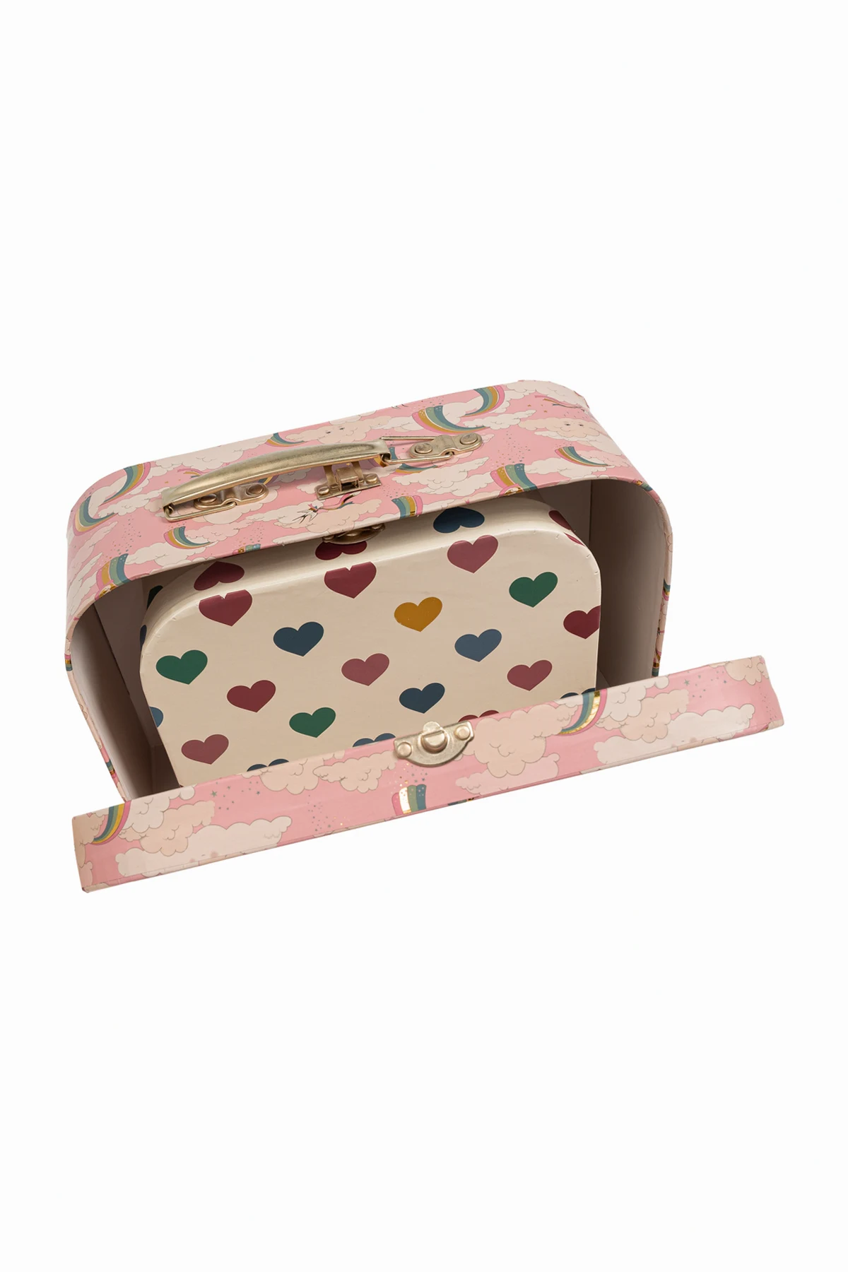 Presenting the Set of Two Decorative Suitcases by the exclusive brand Konges Sløjd, these exquisite accessories are designed to elevate any child's room. Each suitcase is crafted with meticulous attention to detail, embodying elegance and charm. The set features two rectangular suitcases with rounded corners. The top suitcase is adorned with a white hue embellished with multicolored hearts, while the bottom suitcase displays a whimsical pink pattern featuring clouds, rainbows, and unicorns. Both suitcases are constructed from sturdy cardboard and are complemented by elegant gold-tone metal handles and locks, ensuring durability and a touch of sophistication. The interiors are a refined beige, inscribed with "konges slojd" and "favorite treasures," and the larger suitcase's lid mirrors the exterior's delightful cloud and rainbow motif. The set's dominant palette includes a harmonious blend of pink, white, red, blue, green, and yellow, making it a vibrant addition to any decor. Why Choose This Product? Exquisite design by the renowned Danish brand Konges Sløjd. Perfect blend of functionality and aesthetic appeal. Made from FSC™ certified materials for an eco-friendly choice. Ideal for decorative purposes and storage solutions. Thoughtfully sized to fit together seamlessly: Large: H: 17 cm x W: 25.5 cm x D: 8.5 cm Small: H: 14 cm x W: 20 cm x D: 7 cm