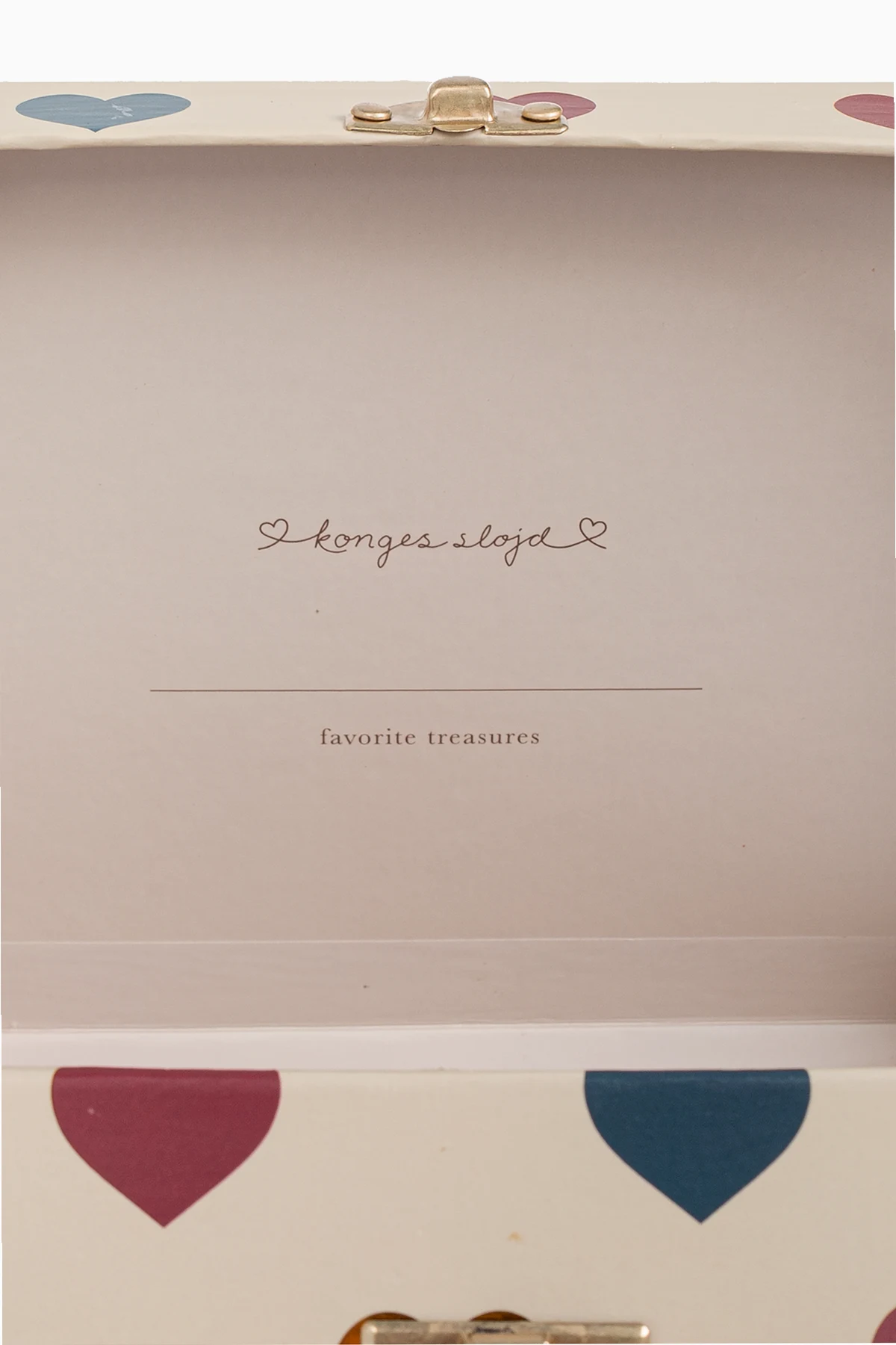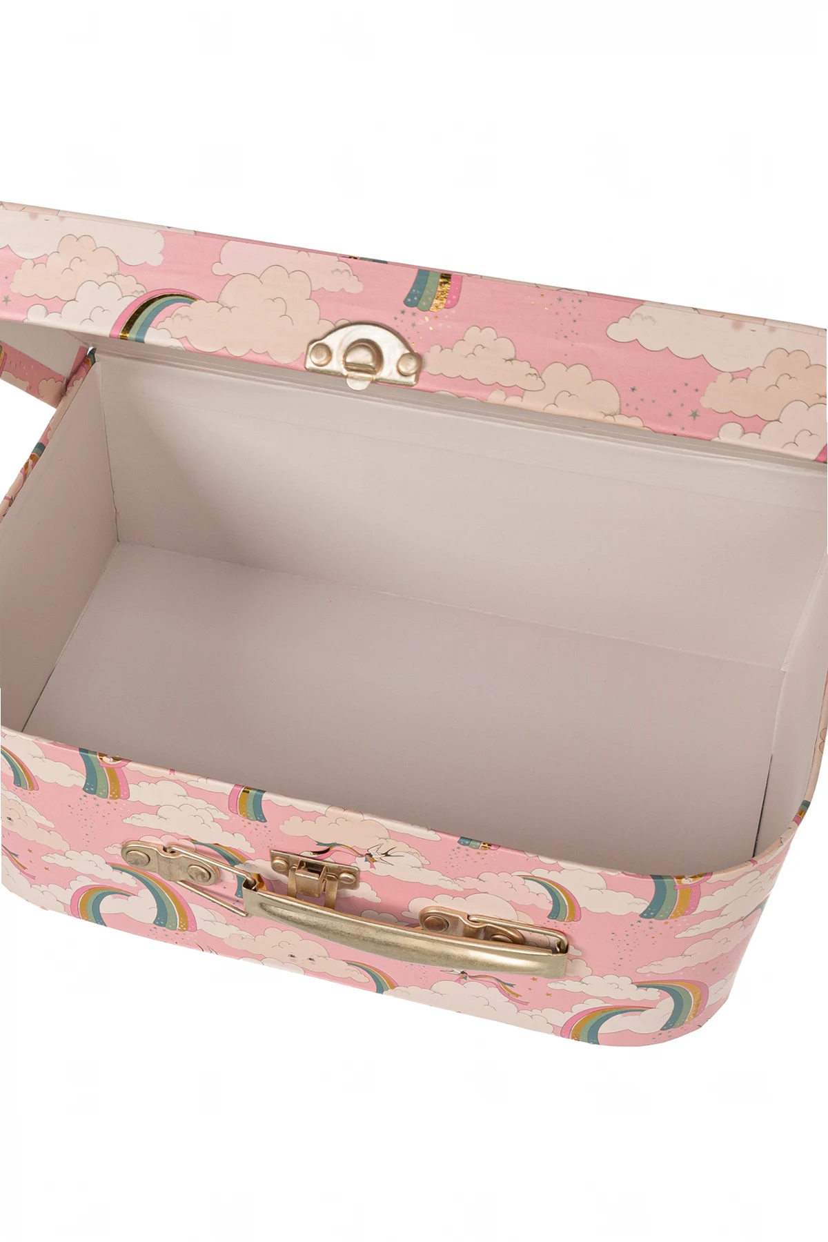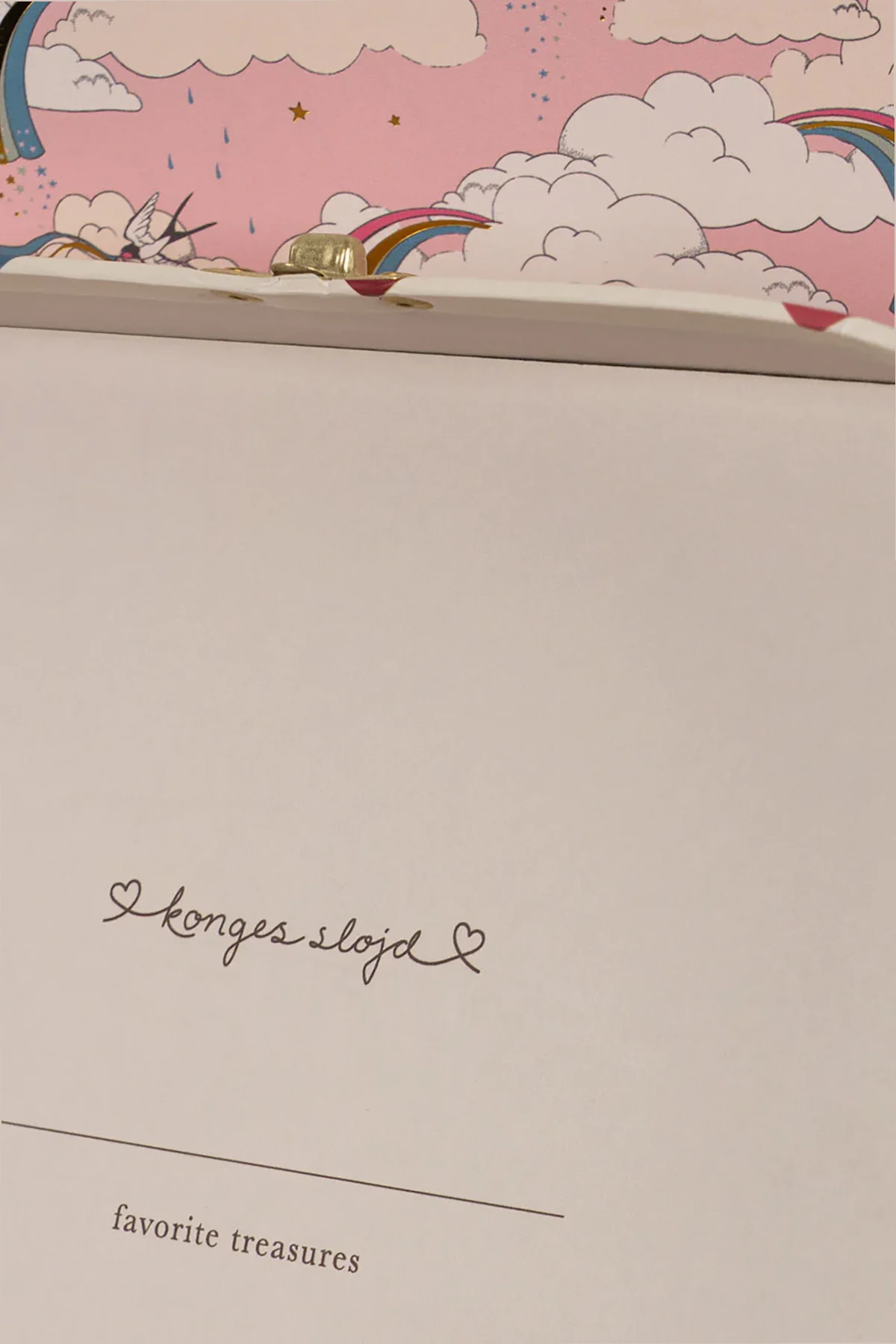 Presenting the Set of Two Decorative Suitcases by the exclusive brand Konges Sløjd, these exquisite accessories are designed to elevate any child's room. Each suitcase is crafted with meticulous attention to detail, embodying elegance and charm. The set features two rectangular suitcases with rounded corners. The top suitcase is adorned with a white hue embellished with multicolored hearts, while the bottom suitcase displays a whimsical pink pattern featuring clouds, rainbows, and unicorns. Both suitcases are constructed from sturdy cardboard and are complemented by elegant gold-tone metal handles and locks, ensuring durability and a touch of sophistication. The interiors are a refined beige, inscribed with "konges slojd" and "favorite treasures," and the larger suitcase's lid mirrors the exterior's delightful cloud and rainbow motif. The set's dominant palette includes a harmonious blend of pink, white, red, blue, green, and yellow, making it a vibrant addition to any decor. Why Choose This Product? Exquisite design by the renowned Danish brand Konges Sløjd. Perfect blend of functionality and aesthetic appeal. Made from FSC™ certified materials for an eco-friendly choice. Ideal for decorative purposes and storage solutions. Thoughtfully sized to fit together seamlessly: Large: H: 17 cm x W: 25.5 cm x D: 8.5 cm Small: H: 14 cm x W: 20 cm x D: 7 cm