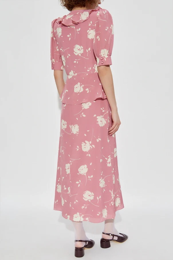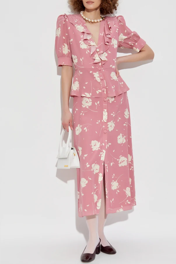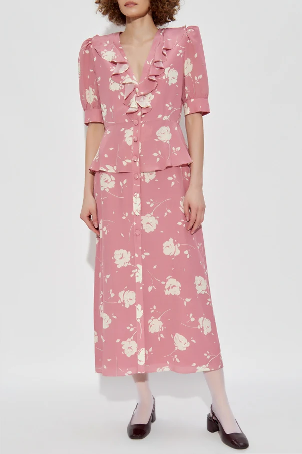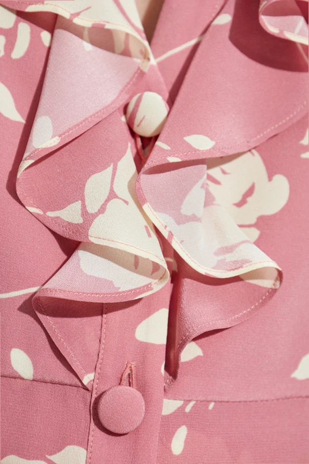Discover the sublime allure of the Silk Dress from Alessandra Rich's exclusive collection. Exquisitely crafted from the finest silk, this midi-length silhouette falls gracefully to mid-calf, cinching elegantly at the waist and flaring into a subtly voluminous skirt. The short puff sleeves, finished with wide cuffs, evoke a timeless sophistication, while the V-neckline—framed by a double ruffle—adds a touch of romantic charm. A refined floral motif of cream and white blooms softly flourishes across a delicate pink background, imbuing the piece with understated femininity. The design is elevated by silk-covered buttons running the length of the front, each one meticulously detailed. The satiny, lightly lustrous finish embodies luxury, ensuring an unforgettable wearing experience. Why choose this product? Masterfully crafted from sumptuous silk with a radiant sheen Distinctive floral pattern for a captivating, refined look Elegant tailoring highlights the silhouette with poise and grace Sophisticated details, including covered buttons and ruffled neckline Designed by the renowned Alessandra Rich for signature exclusivity