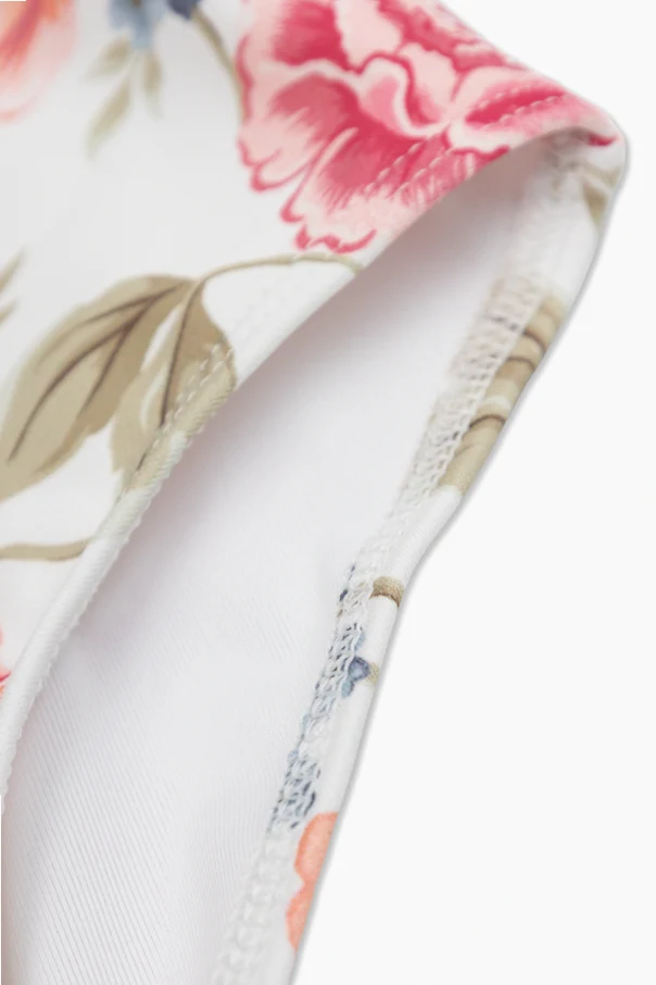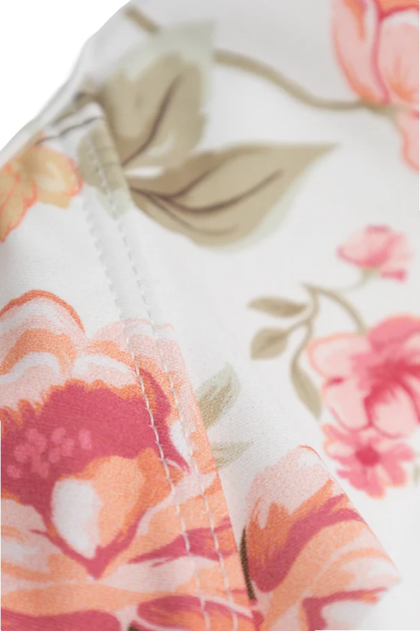 The enchanting design features lush, pink and pastel floral motifs interlaced with subtle green leaves, artfully displayed across the entire piece. Broad, sculpted ruffles at the shoulders lend an exquisite sense of playfulness and sophistication. The back captivates with an elegant deeper cut, elevating the overall look to new heights of style.