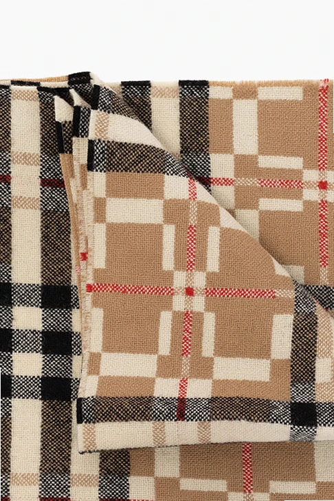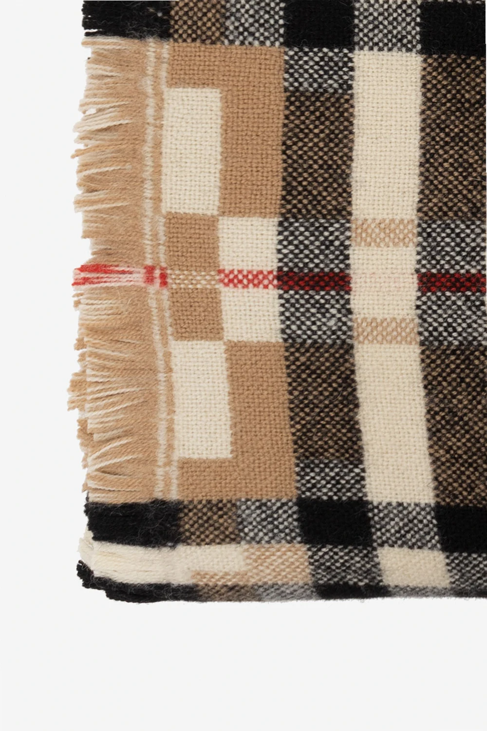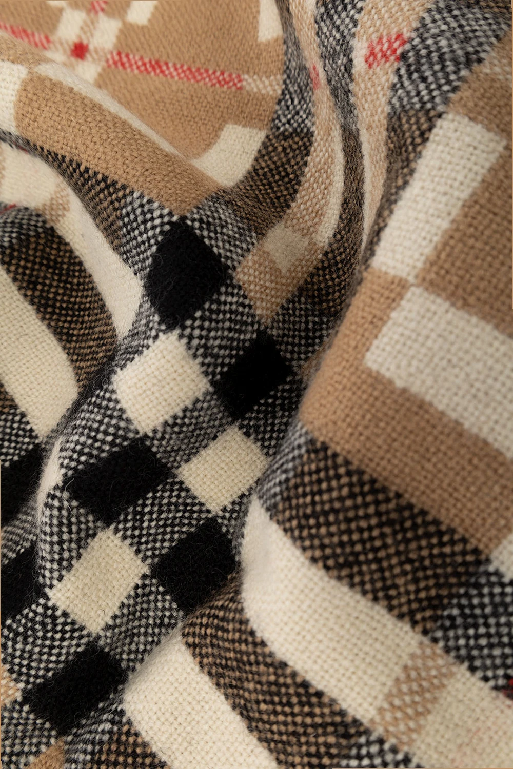 Beige blanket from Burberry. Made of wool, this item showcases the brand's signature colourful check pattern and fringed edges.