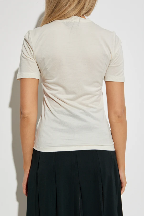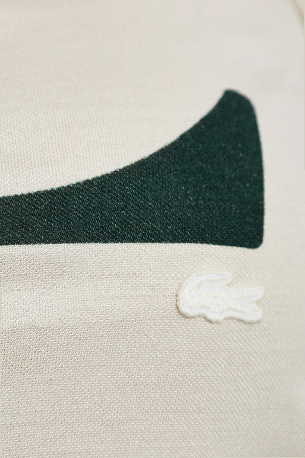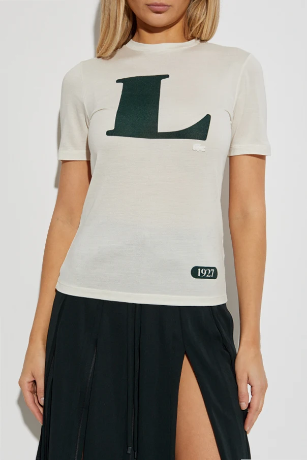 Experience pure sophistication with this silk t-shirt from the LACOSTE RUNWAY collection. Tailored in a refined, straight silhouette, this graceful garment features a classic crew neckline and short sleeves, with a fluid, lightly fitted shape that elegantly skims the figure. The luxurious, matte silk fabric is distinguished by its delicate touch and subtle translucence, revealing the unmistakable finesse of premium craftsmanship. A bold, dark green "L" emblazons the front, complemented by a motivational patch with the inscription "1927" on a deep green ground. The iconic white crocodile logo is discreetly stitched beside the initial, a subtle nod to the esteemed heritage of Lacoste. The back remains pristine and unadorned, celebrating modern simplicity. Why choose this product? Crafted from exquisite, high-quality silk for unparalleled comfort Distinctive designer details set apart by refined logo and emblem Versatile fit that combines effortless chic with timeless appeal Statement graphic and thoughtful accents for modern elegance