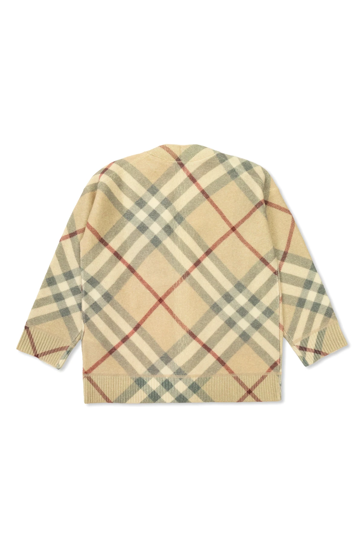 Introducing the quintessence of sartorial elegance, the Burberry Kids Plaid Cardigan. Dominated by an exquisite beige hue, this cardigan is accentuated with sophisticated white, black, and red plaid patterns, embodying a classic yet casual style. The garment's silhouette, characterized by its simple, classic cut and slightly dropped shoulders, evokes a relaxed charm, perfect for any casual ensemble. The cardigan features a traditional collar adorned with a contrasting white label, showcasing the prestigious Burberry Kids logo, a testament to its authenticity and luxury heritage. Its front closure boasts a series of light-colored buttons, thoughtfully selected to complement the garment’s overall palette, ensuring a harmonious aesthetic. Upon closer inspection, one can appreciate the texture of the material, suggesting a soft blend potentially inclusive of wool, designed to provide both comfort and warmth. The presence of the designer's logo at the collar further signifies the cardigan's exclusivity and brand identity. Why Purchase This Product? Elegant plaid design, perfect for versatile styling. Made from soft, possibly wool-blend material, offering comfort and warmth. Features a classic cut with modern touches, suitable for casual occasions. Authenticity marked by the Burberry Kids logo, ensuring a luxury experience. Buttoned front for easy wearability and a touch of timeless charm.