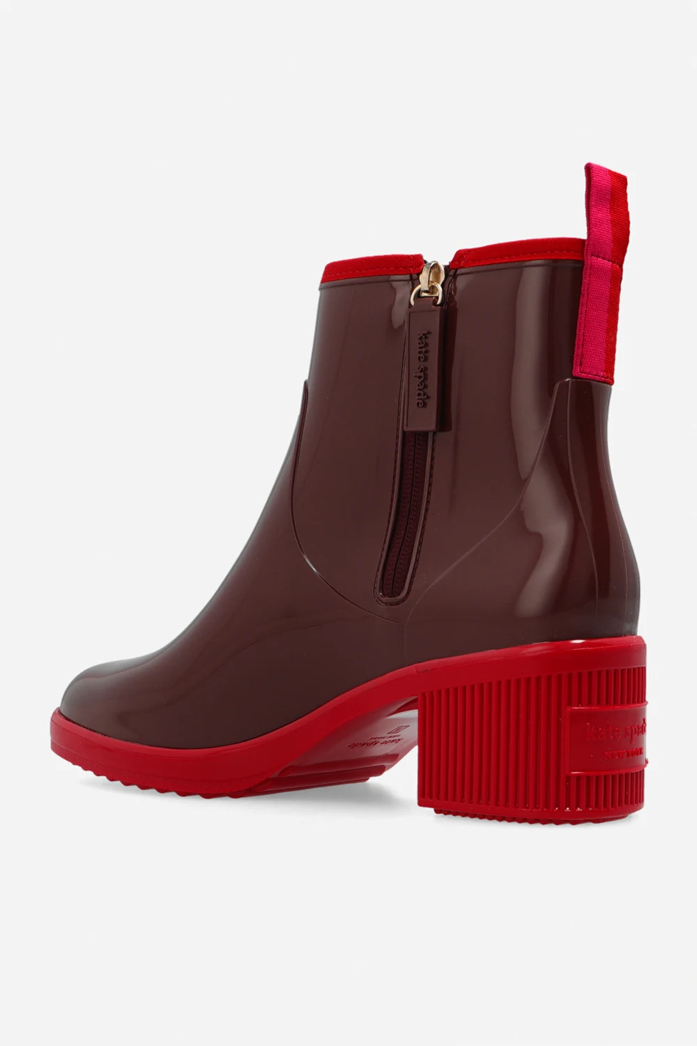 Brown heeled rain boots from Kate Spade. Fastened with a side zip, this round toe design is complete with a raised logo and light brown rubber sole.