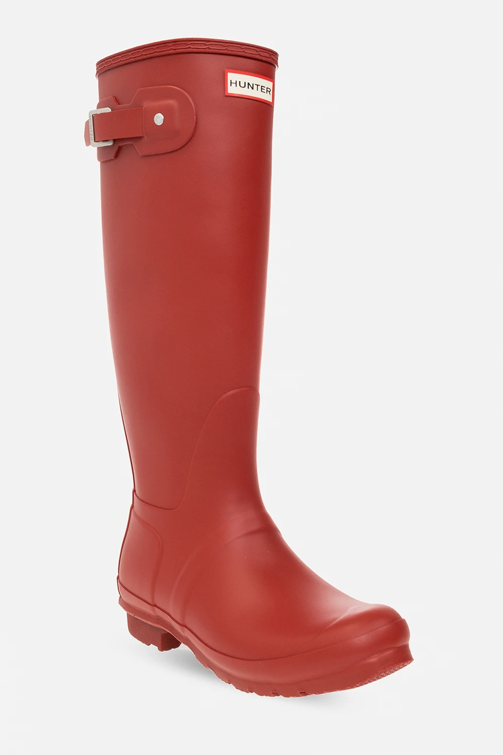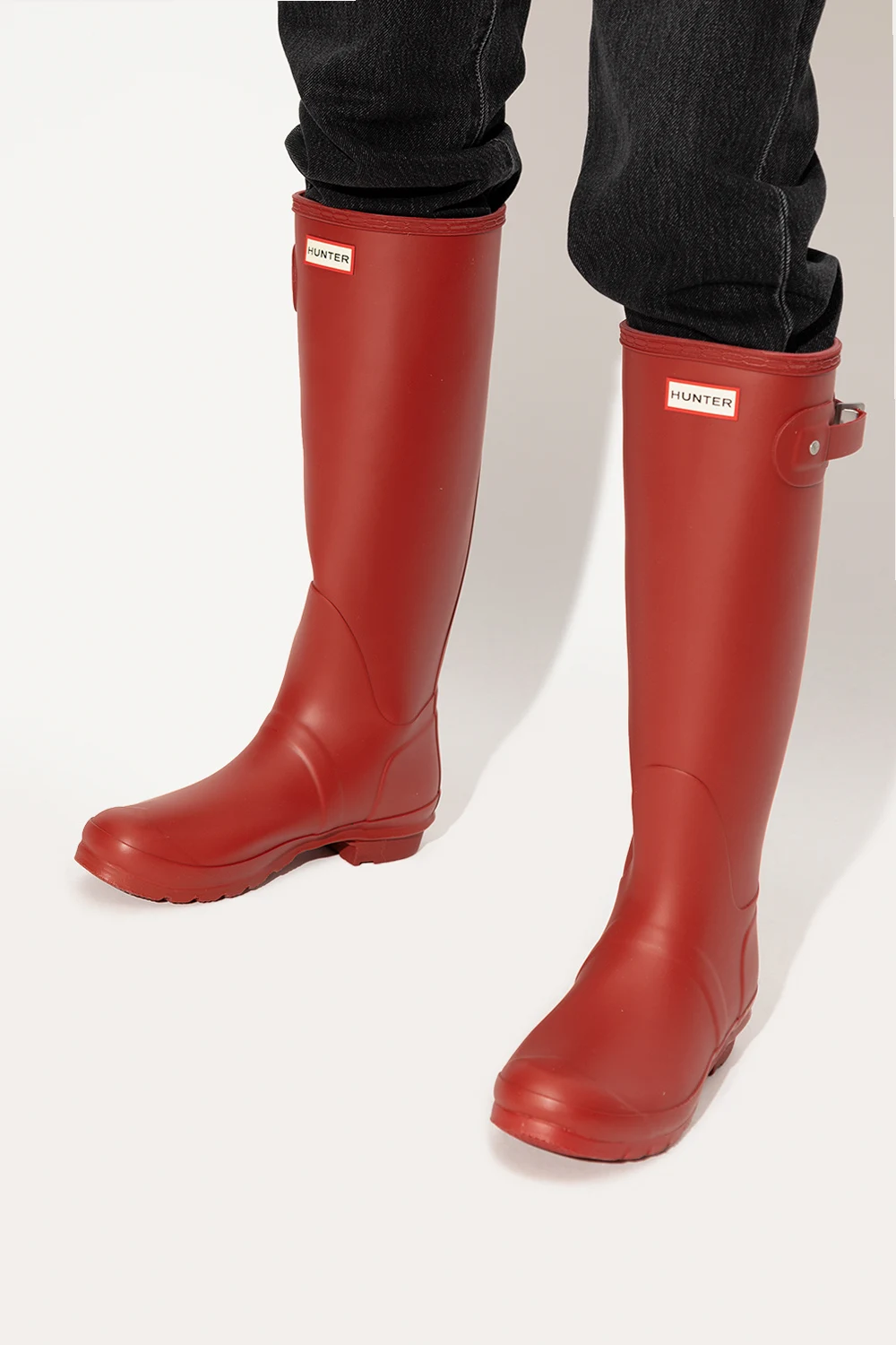 Red ‘Original Tall’ rain boots from Hunter. Handcrafted from natural vulcanized rubber with a matte finish, this pair features a logo detail, strap with a metal buckle on the side and rubber sole with the signature Hunter Original tread.