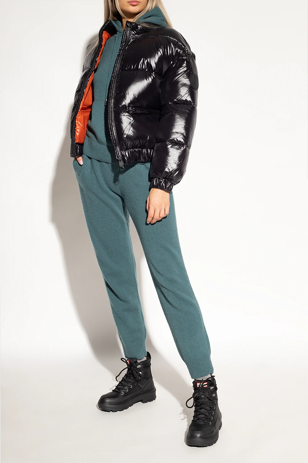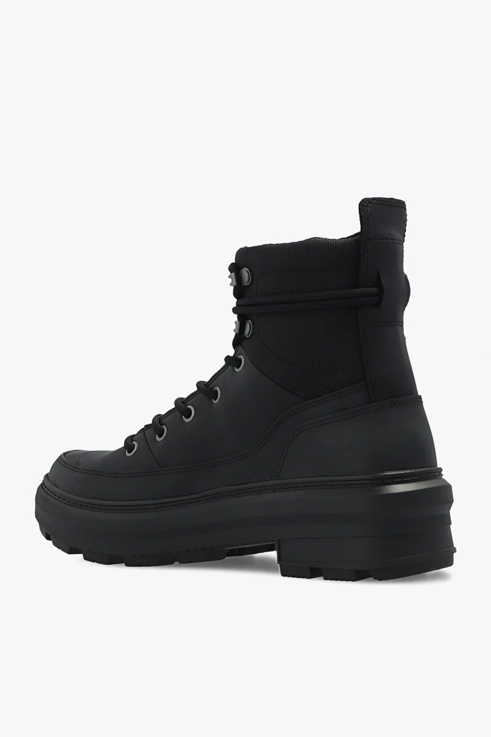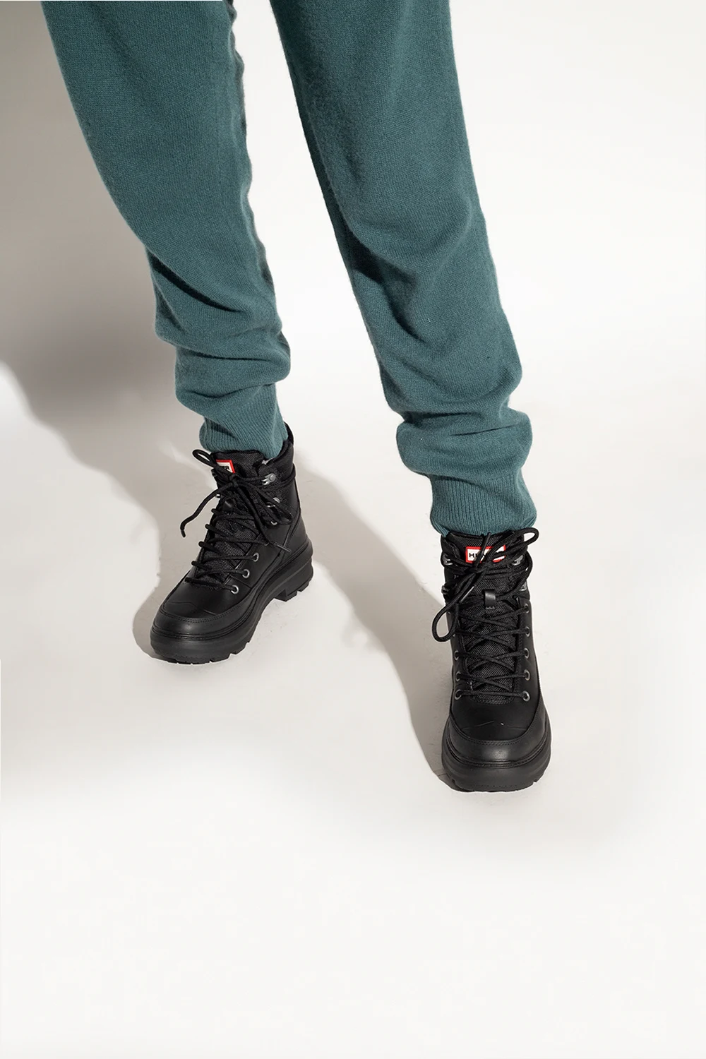 Black ‘Rebel Explorer’ boots from Hunter. Resting on a black rubber sole, this lace-up pair is decorated with a logo patch in white, red and black.
