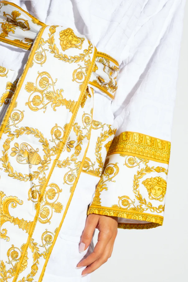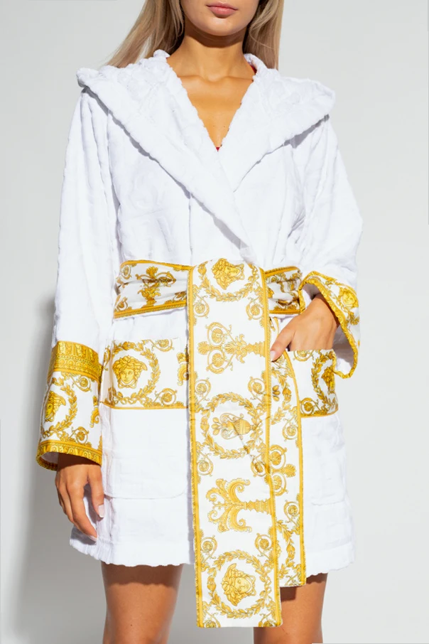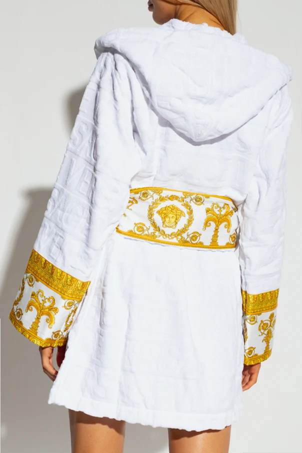White hooded bathrobe from Versace Home. Made of cotton terry, this design features tie belt, jacquard logo pattern, white stripes with a yellow and brown I Love Baroque pattern, long sleeves and two slip pockets.