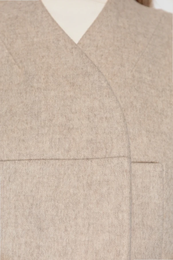 Imbued with sophisticated allure, this beige woolen blazer by ENTIRE STUDIOS offers a refined interpretation of timeless tailoring. Crafted from sumptuous materials, its soft, high-quality wool blend is enriched with the delicate touch of cashmere, presenting a matte, subtly heathered texture that feels exquisitely gentle. The classic, contoured silhouette features elegantly structured shoulders and a discreetly defined waist, while the absence of a lapel collar is replaced by a modern, rounded neckline—underscoring the piece’s contemporary sensibility. The concealed front closure maintains a clean, minimalist aesthetic, beautifully complemented by geometric seam detailing that highlights the garment’s architectural finesse. Why choose this product? Exceptional blend of wool and cashmere for supreme comfort Modern neckline and hidden closure for a refined, minimalist look Expertly tailored silhouette accentuates the female form Subtle melange finish exudes understated elegance Designed by ENTIRE STUDIOS, synonymous with high-end craftsmanship