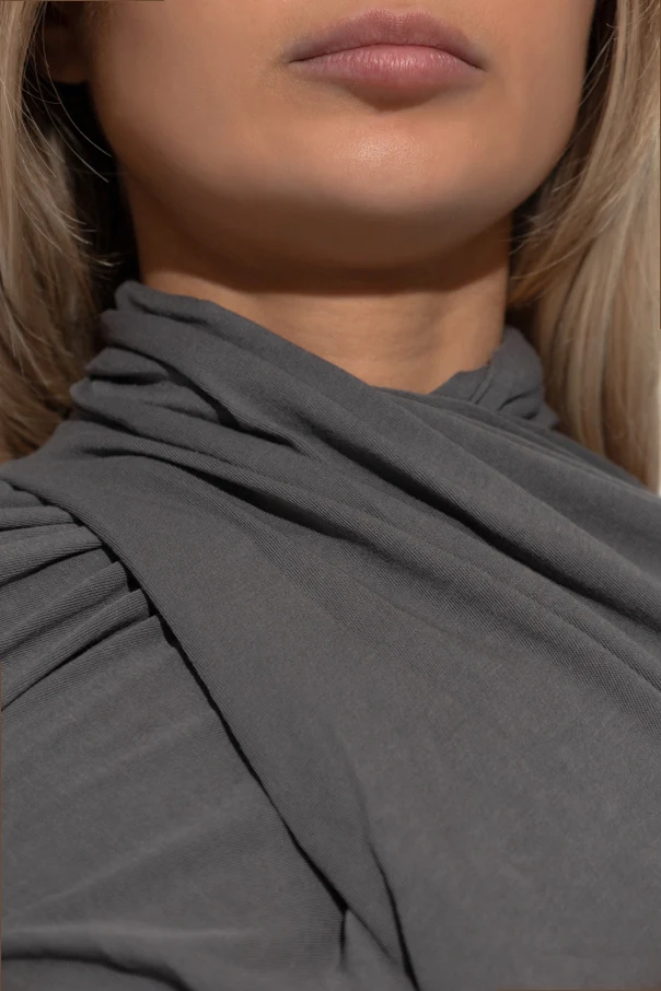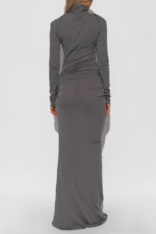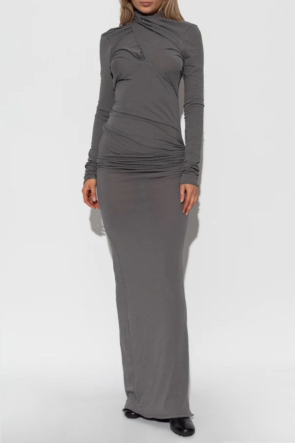 Imbued with understated sophistication, this ENTIRE STUDIOS long fitted dress epitomizes modern refinement. Crafted from exceptionally soft, high-quality jersey, the silhouette gracefully elongates the figure, enhanced by delicate elastic draping at the bodice, waist, and hips that subtly shape and flatter the natural form. The sleek, maxi-length cut features long, impeccably tailored sleeves and an elongated shoulder line, finished with a seamless, gently structured turtleneck collar. Free of visible prints, embellishments, or designer insignia, this dress radiates minimalist elegance through a smooth, monochromatic palette and precision in every detail. Why choose this product? Luxurious, soft jersey embraces comfort and sophistication Distinctive asymmetrical draping sculpts a flattering silhouette Elegant minimalism, devoid of external logos or patterns Meticulously tailored for an exclusive, modern look