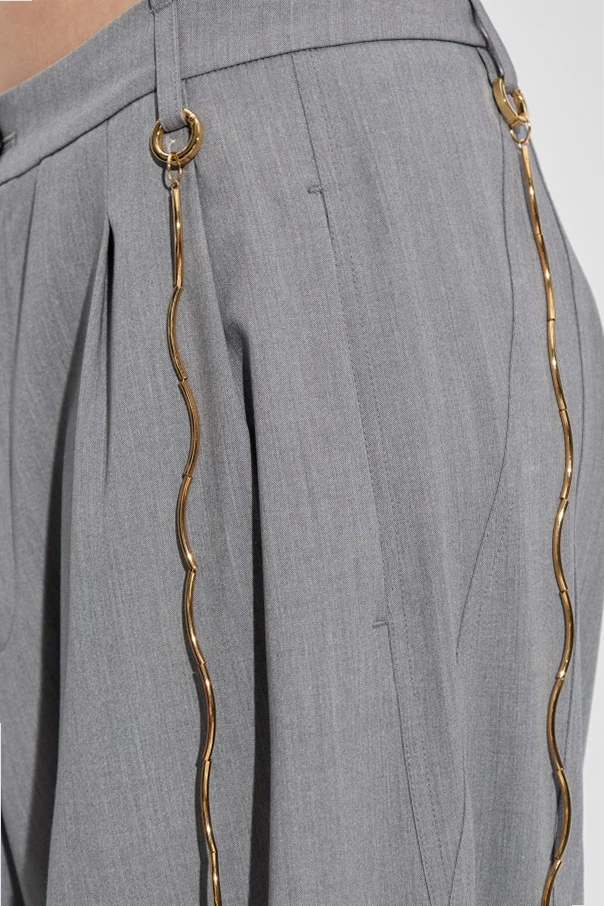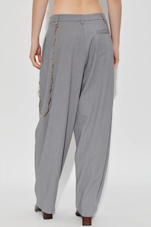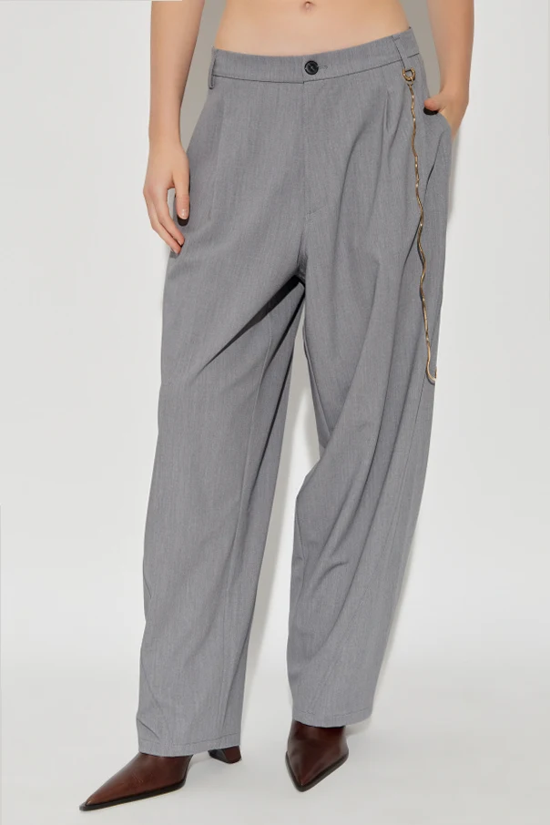 Distinctive touches elevate these pants into a modern statement piece: a decorative chain or bold beaded charm graces the right pocket, reflecting an exclusive allure. The front closure features a light-toned button and a sleek zipper, seamlessly blending practicality with contemporary style. Two discreetly inset front pockets lend everyday functionality while accentuating the pants’ effortless, casual aesthetic.