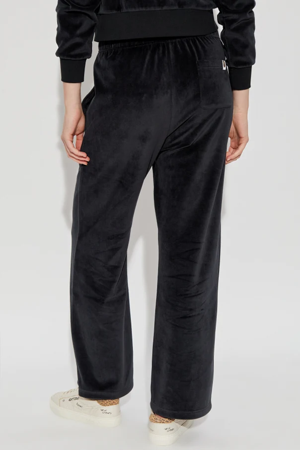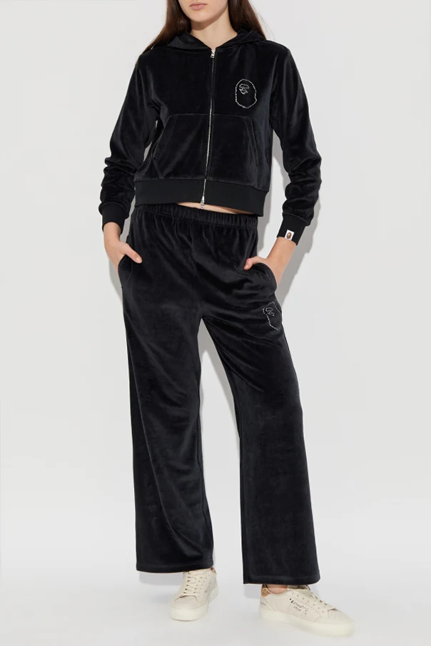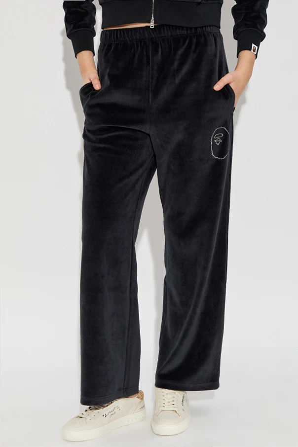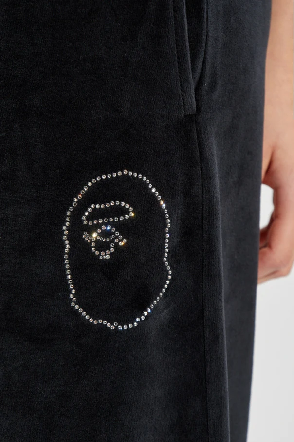 Imbued with understated opulence, these black velour sweatpants from the exclusive A BATHING APE® collection exude an elevated sense of modernity. Carefully crafted from sumptuously soft velour, their delicate sheen captures attention while offering an indulgent tactile experience. The wide-leg silhouette presents a relaxed, contemporary profile, harmoniously balanced by an elasticized waistband that ensures personalized comfort and a flawless fit. Thoughtfully designed for both style and utility, these trousers feature two side pockets for functional refinement. A distinctive, artistic flourish appears in the form of a crystal-embellished minimalist face motif near the left pocket, exemplifying avant-garde detailing and unmistakable designer heritage. Why choose this product? Luxurious velour material with a subtle luster Contemporary wide-leg cut for modern appeal Signature crystal detail highlighting exclusive artistry Elastic waistband for all-day comfort and versatility Practical side pockets for everyday essentials