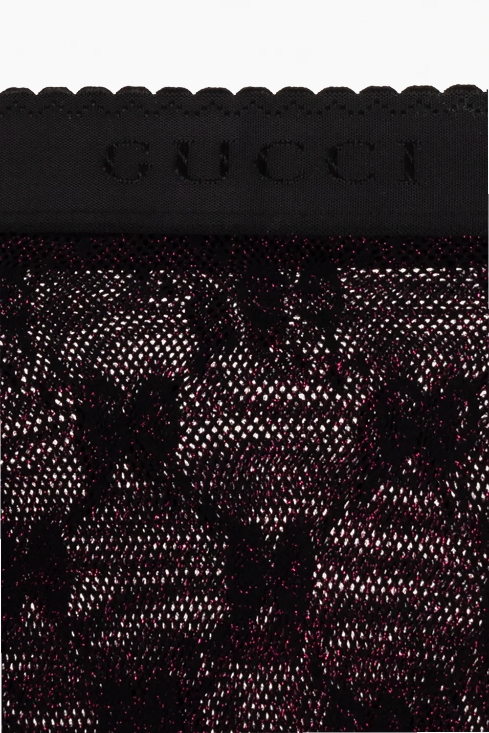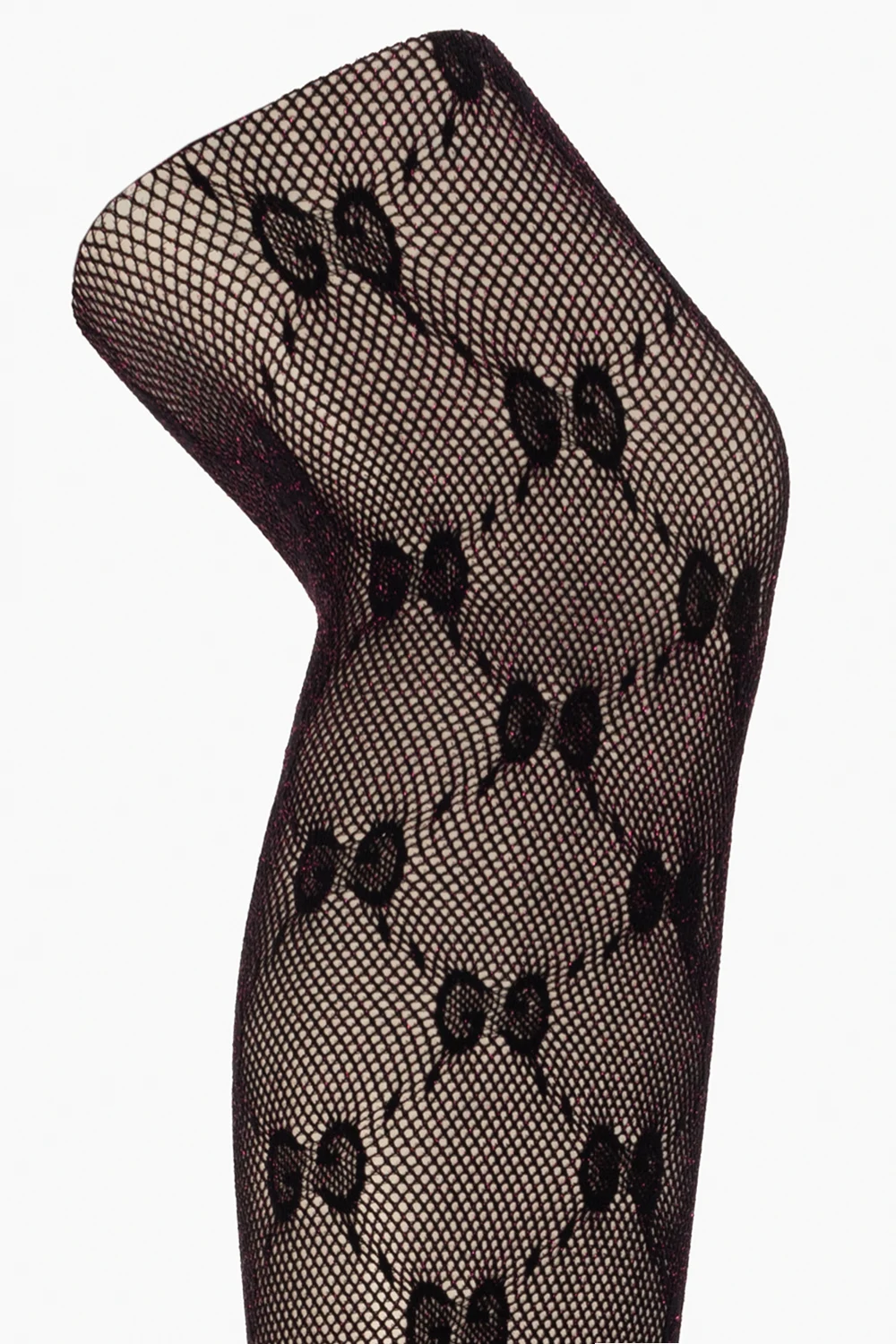 Black and dark pink tights from Gucci. Inlaid with a glossy lurex yarn, this pair features a monogram pattern and an elasticated waistband accentuated with a logo.