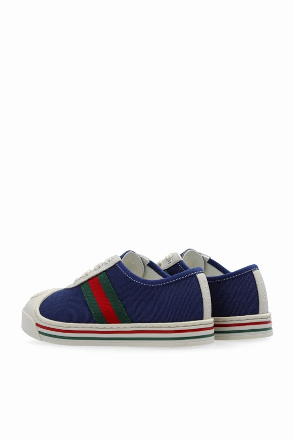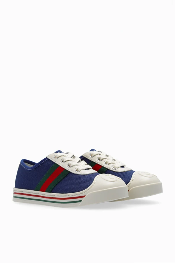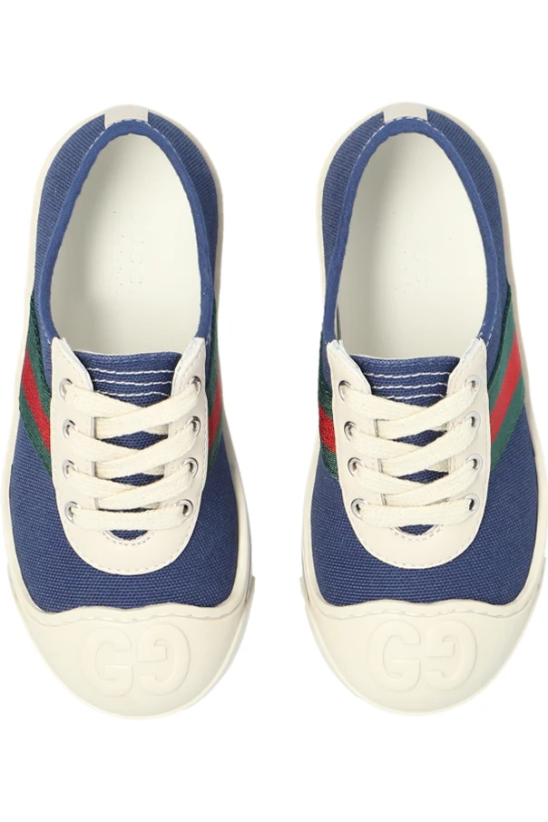Navy sneakers from Gucci Kids. Crafted from textured fabric, this lace-up pair features beige leather trims, a rubber toe with a tactile logo, the brand’s signature Web stripe in green and red as well as a cream rubber sole with decorative stripes.