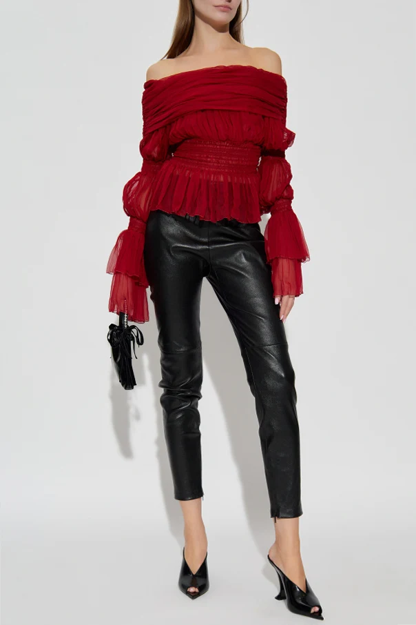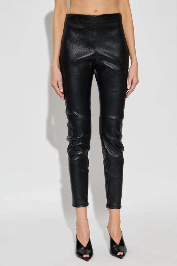 Experience refined sophistication with the Leather Pants with Zippered Ankles by Versace, conceived for those who appreciate contemporary elegance fused with iconic heritage. Expertly tailored from premium, natural lambskin leather in classic black, these skinny-fit trousers feature a high-rise silhouette that artfully accentuates the feminine figure. The smooth, subtly matte finish and seamless design exude understated luxury, while the vertical seams along the front and back create a visually elongating effect. Discreet zippers, elegantly integrated at the ankles, offer effortless wear and a precise, customized fit. These exceptional details transform a timeless classic into a distinctly modern statement piece. Why choose this product? Crafted from exquisite lambskin leather for supreme softness and durability Signature Versace artistry blending innovation with Italian tradition Flattering skinny silhouette with elongating vertical seams Functional, refined ankle zippers for style and comfort Unembellished, versatile design perfect for elevated day-to-night styling