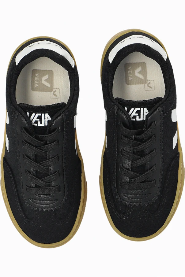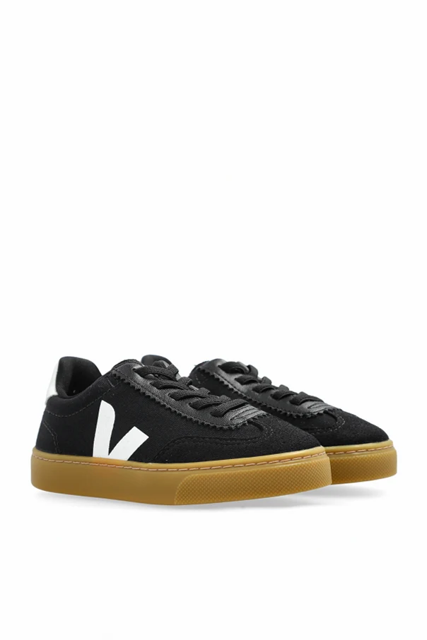 Introducing the Small Volley Canvas sneakers by the illustrious Veja Kids . These children's athletic shoes epitomize a harmonious blend of simplicity and sophistication, accentuated by a dominant black hue complemented by white details.